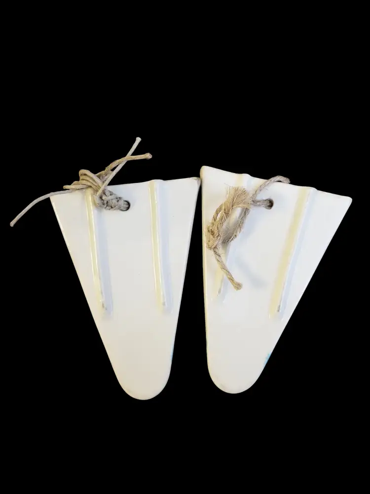 Vintage Shawnee Pottery Wheat Wall Pocket – Set of 2 are 3 1/2" wide x 5” tall. This is a well loved pair of pottery wall pockets that are hand-painted under glaze. They both show signs of use and each has its own hairline crack which are hardly noticeable when hanging. No chips, cracks, or repairs other than noted.