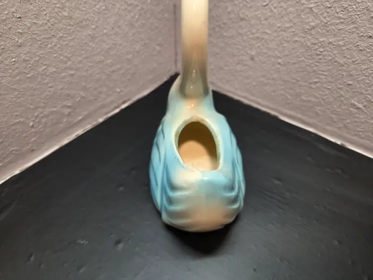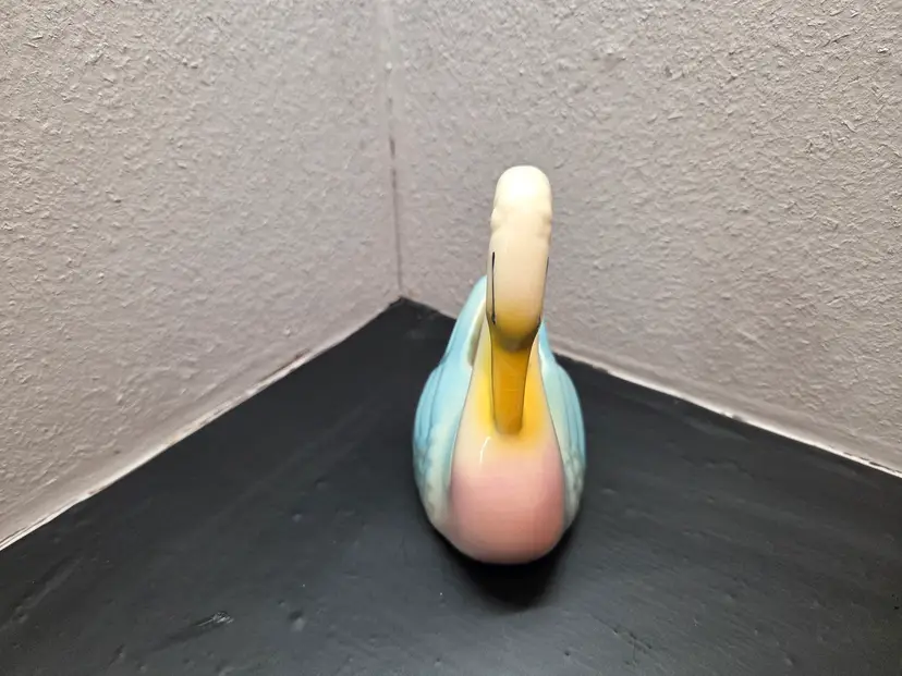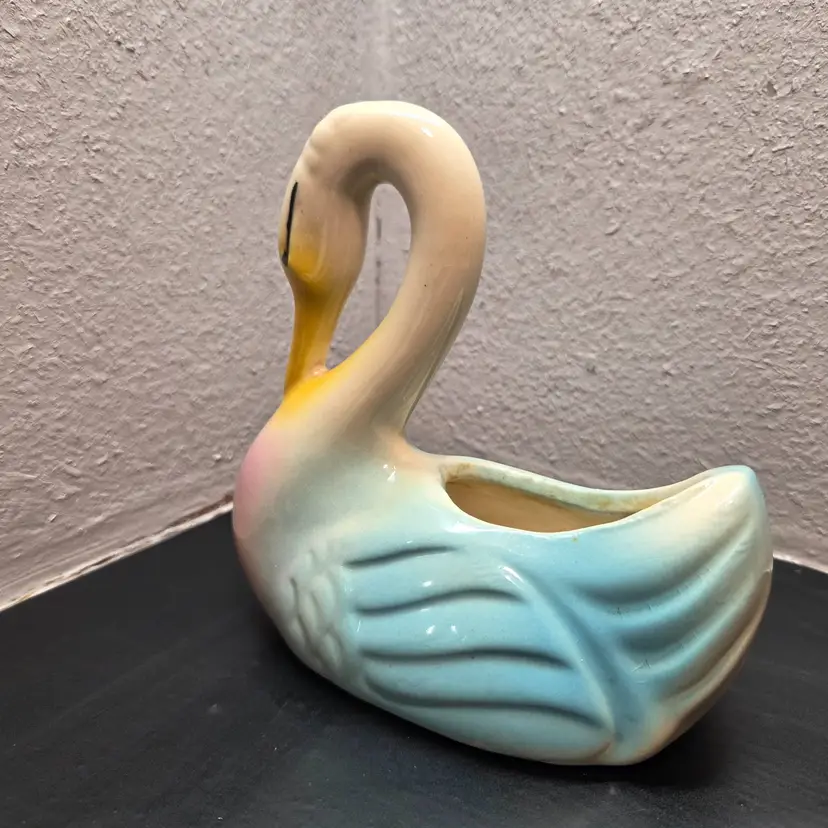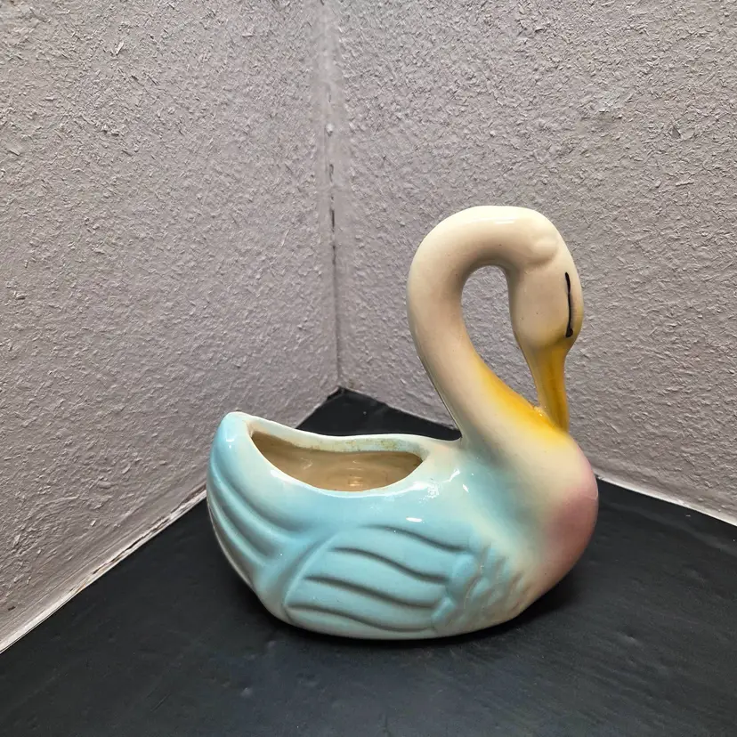 The Vintage Shawnee Swan Ceramic Planter is a charming piece of mid-century modern decor, featuring a blue and pink swan design with a stylized goose motif. This small ceramic planter is perfect for displaying succulents or other small plants, adding a touch of retro flair to any room. Made in the United States in the 1950s, this original piece is glazed and can be cleaned with a damp cloth or warm water. With its unique airbrush pattern and animal theme, this planter is a collectible item suitable for all occasion