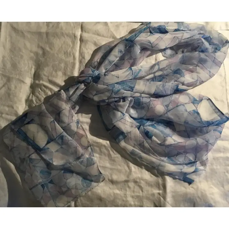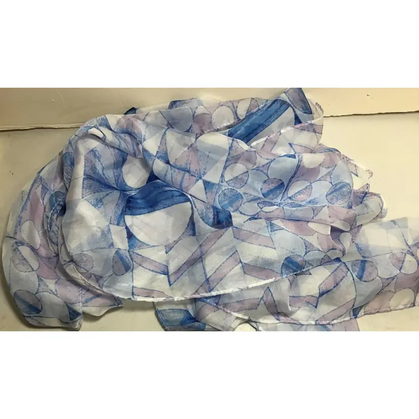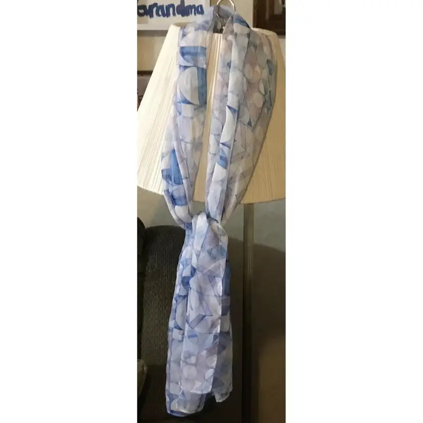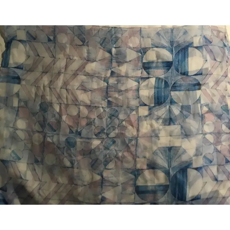 72 inches long by 12 inches wide. Pattern is blocks of geometric shapes of all kinds. Soft and sheer.