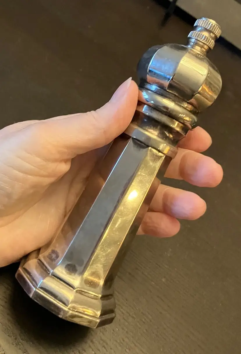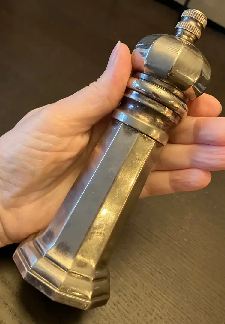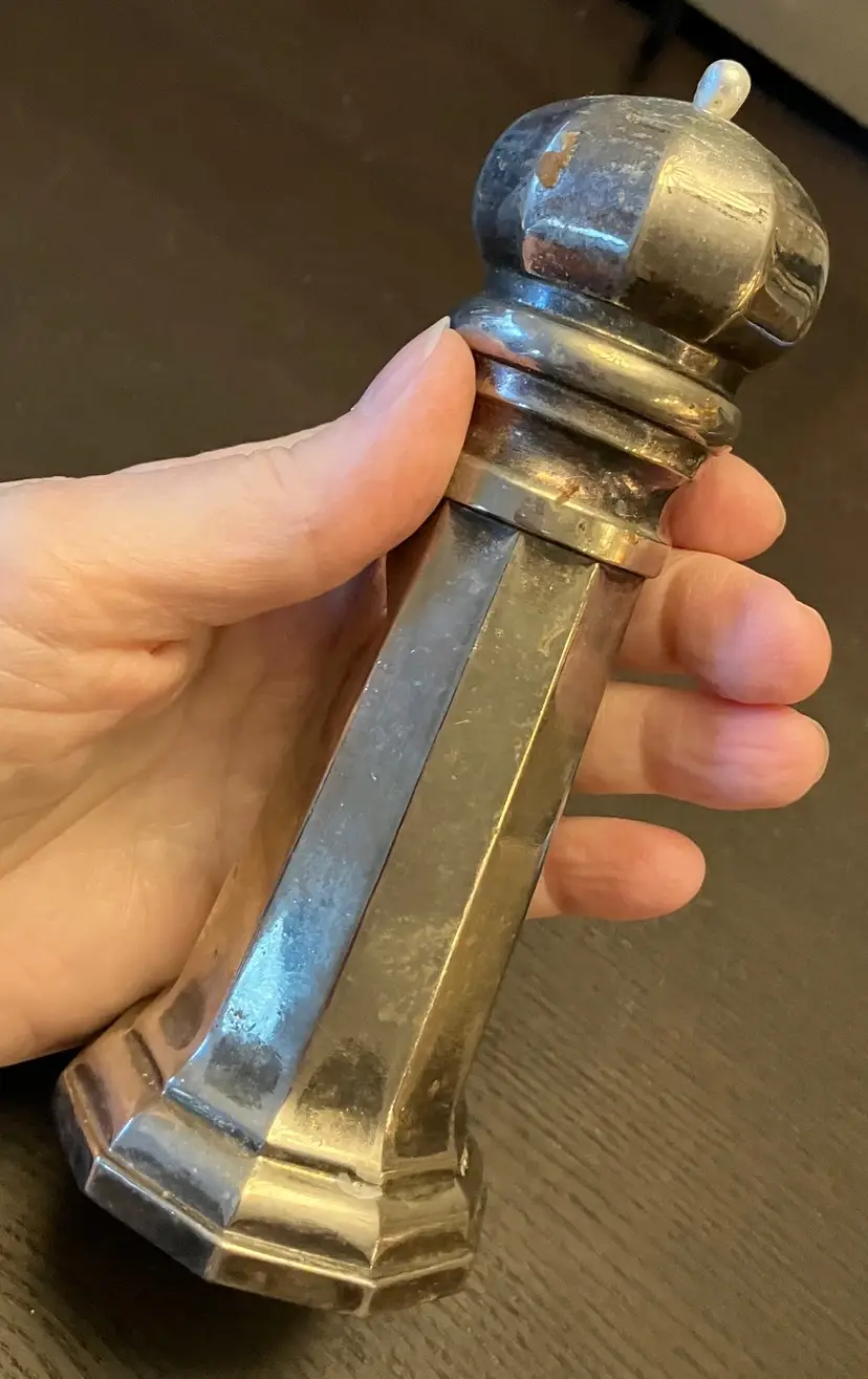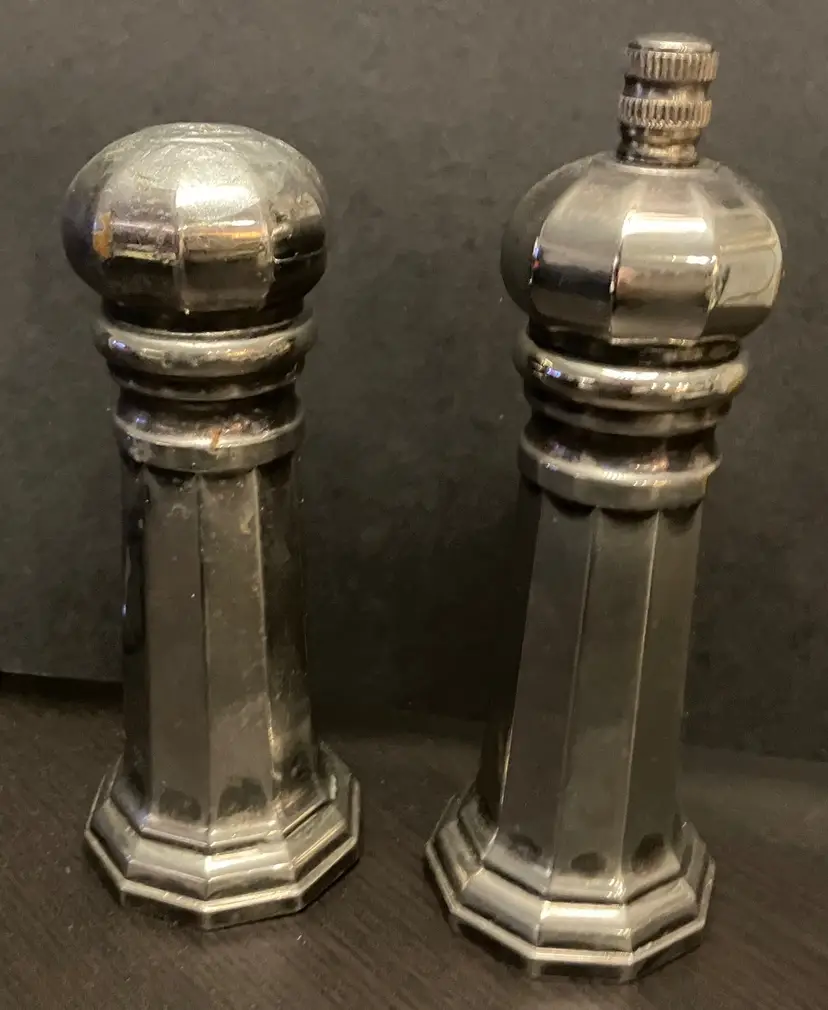 Paneled body and a domed top with a tarnished finish. The pepper one is in very good condition. The salt one is damaged on the top (see images). Pepper one is 6 1/2" tall. The salt one is 5 3/4" tall.