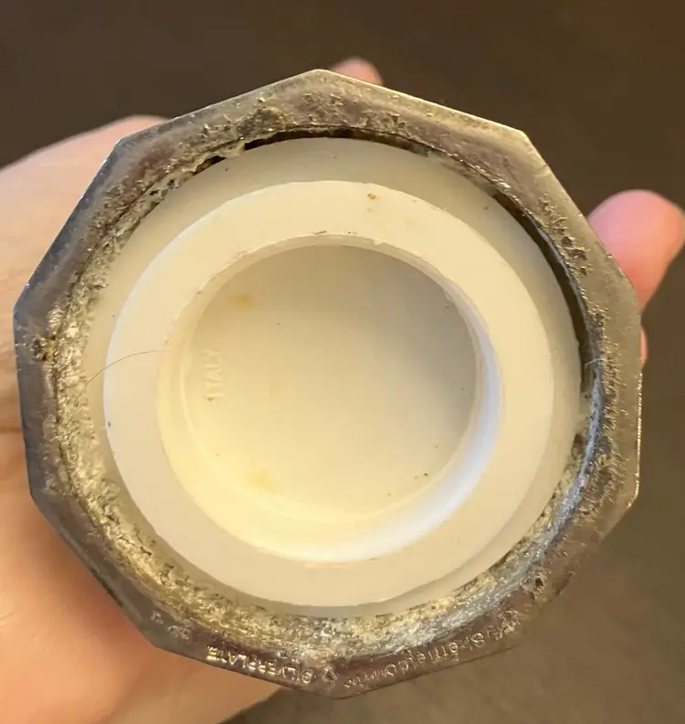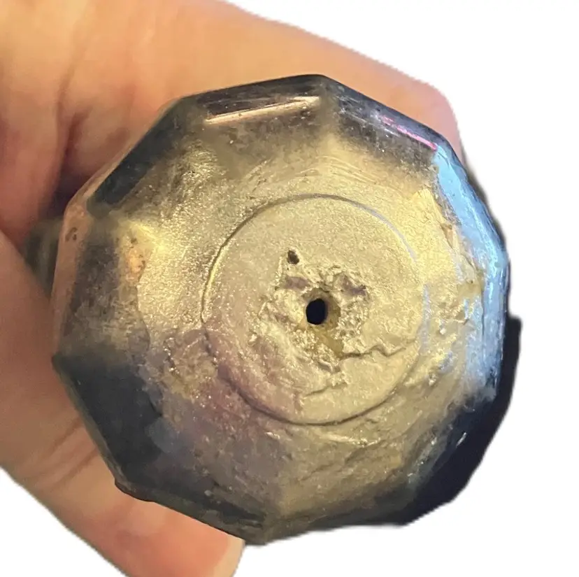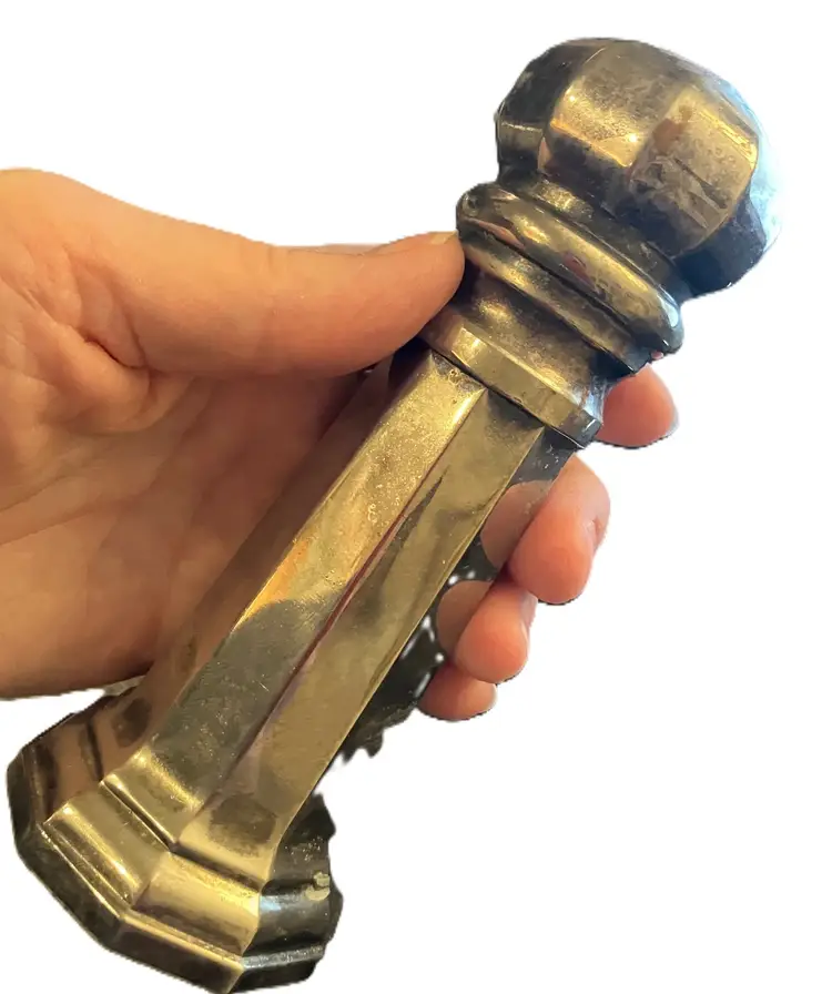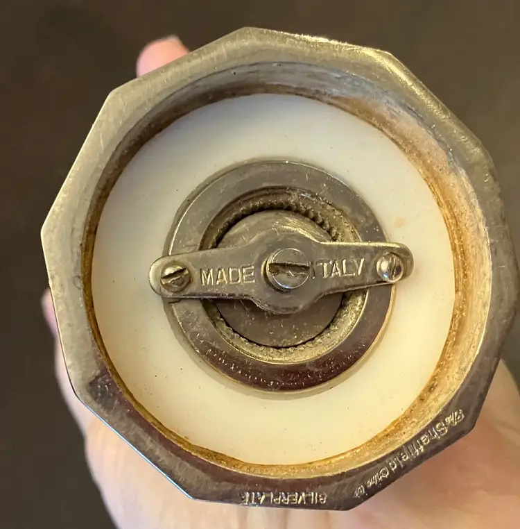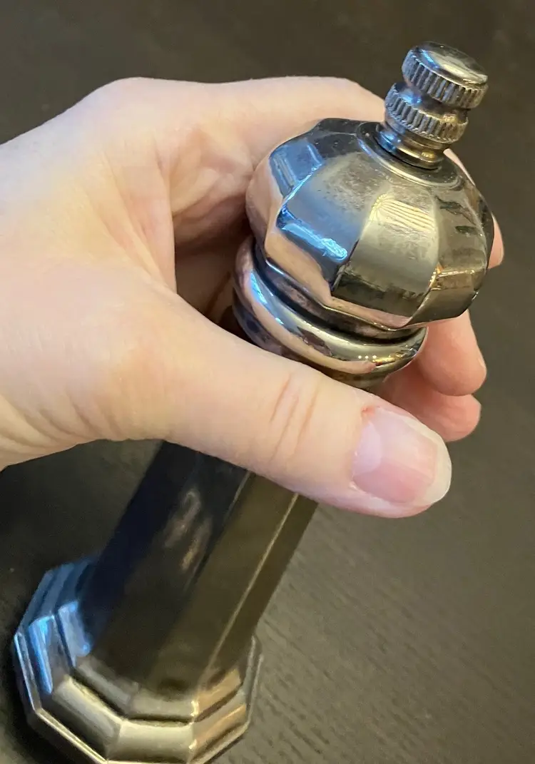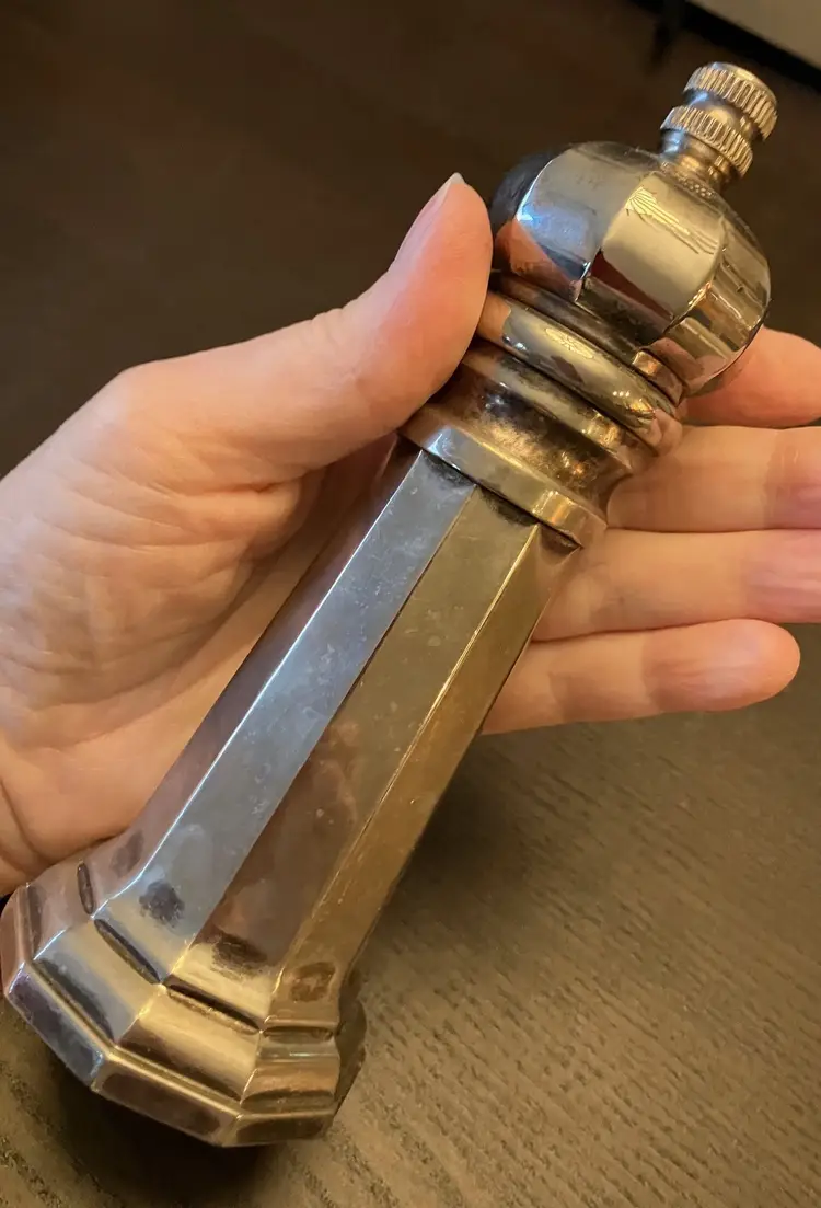 Paneled body and a domed top with a tarnished finish. The pepper one is in very good condition. The salt one is damaged on the top (see images). Pepper one is 6 1/2" tall. The salt one is 5 3/4" tall.
