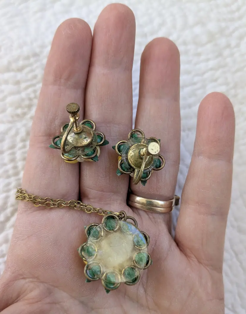 The pendant on the necklace is 1" in diameter and has a 15" gold tone chain. The earrings are screw back. Unmarked