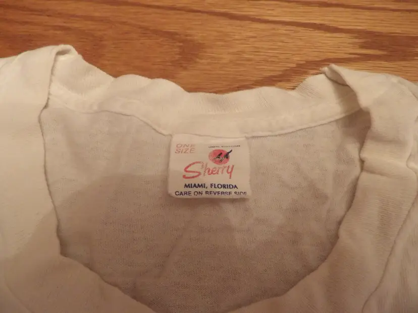 This is a good condition, used, vintage tshirt. It is Sherry branded, one size, with no rips, stains, or tears. Tag says Miami, FL. It is single stitch. Please see pictures. (Merida)