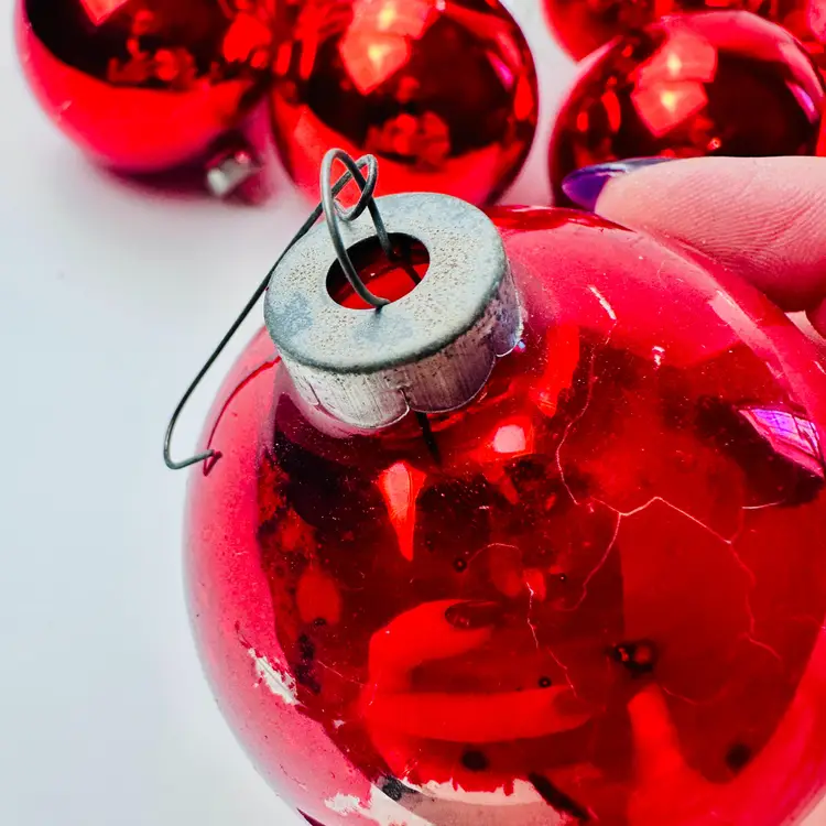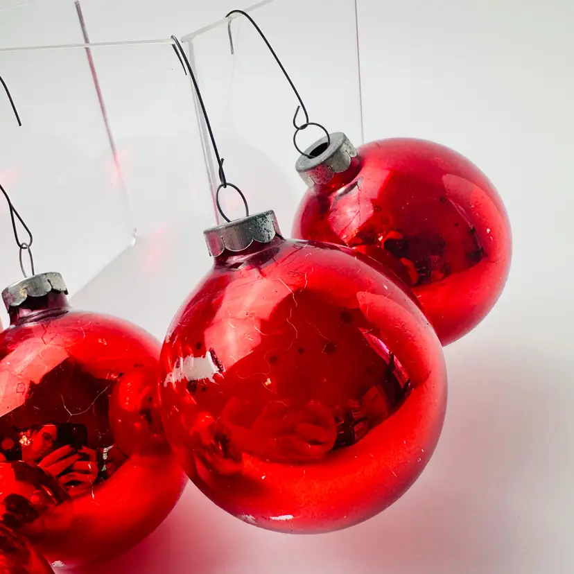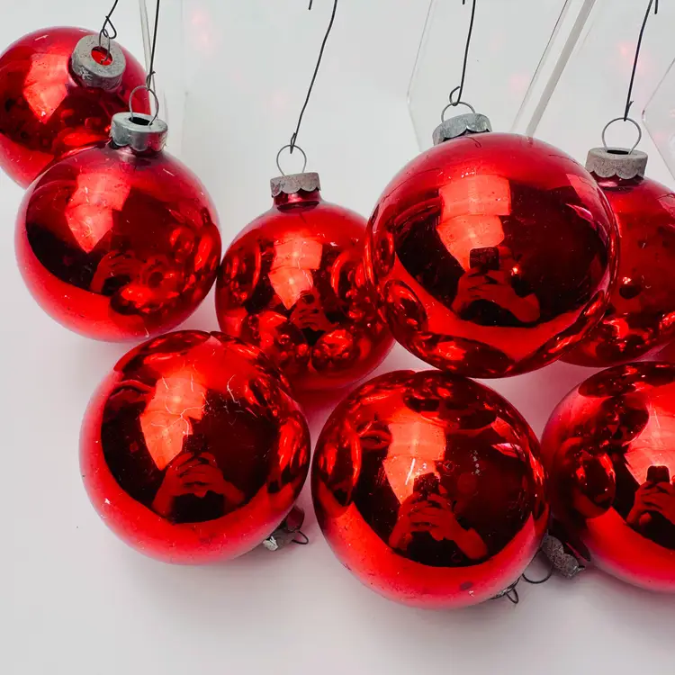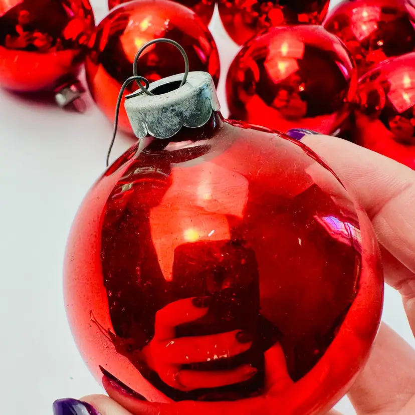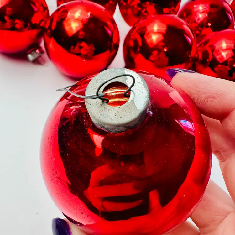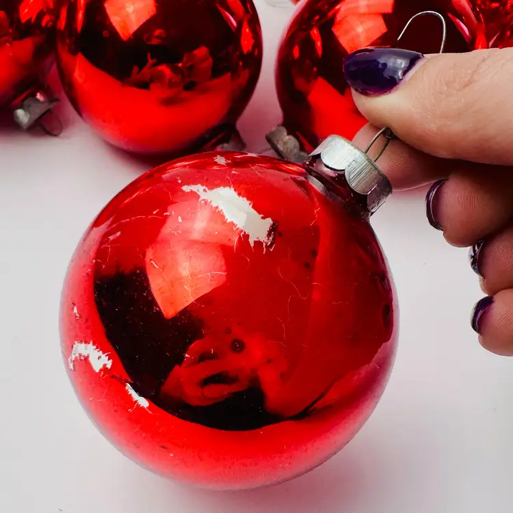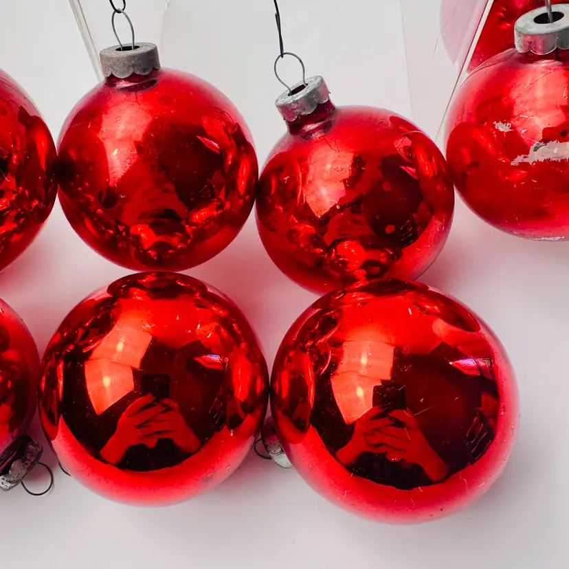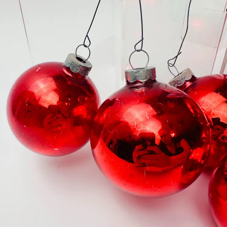 These items are in fair vintage condition. No chips or cracks. Original caps. Some scratching, wear and missing color due to age. These were ornaments actually used from 1950s through the 80s. See all images for details. Use the zoom feature for a closer look. Measures approximately 3" in diameter. Altogether they weigh 5oz