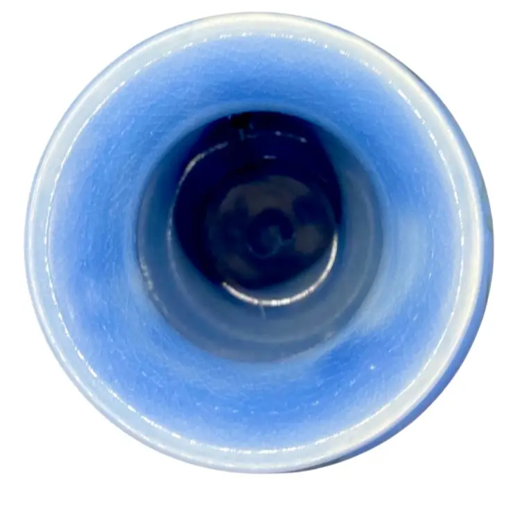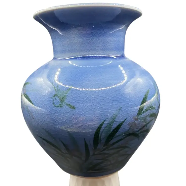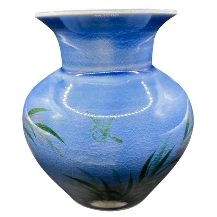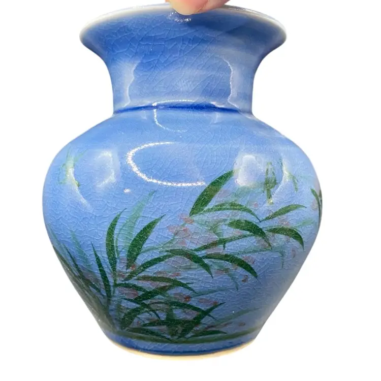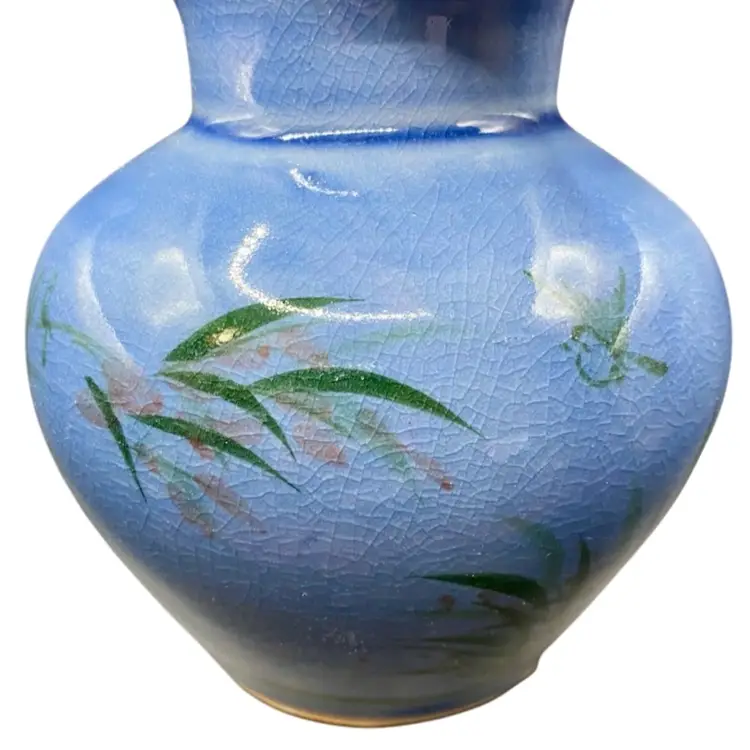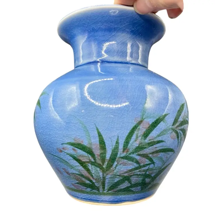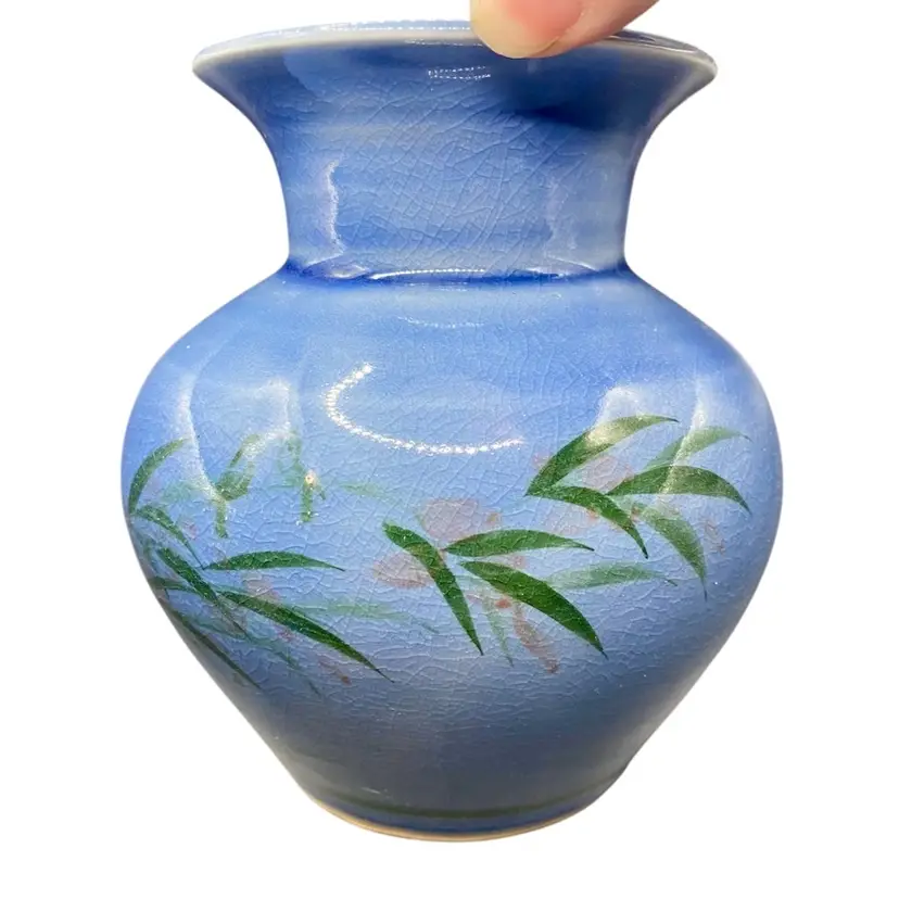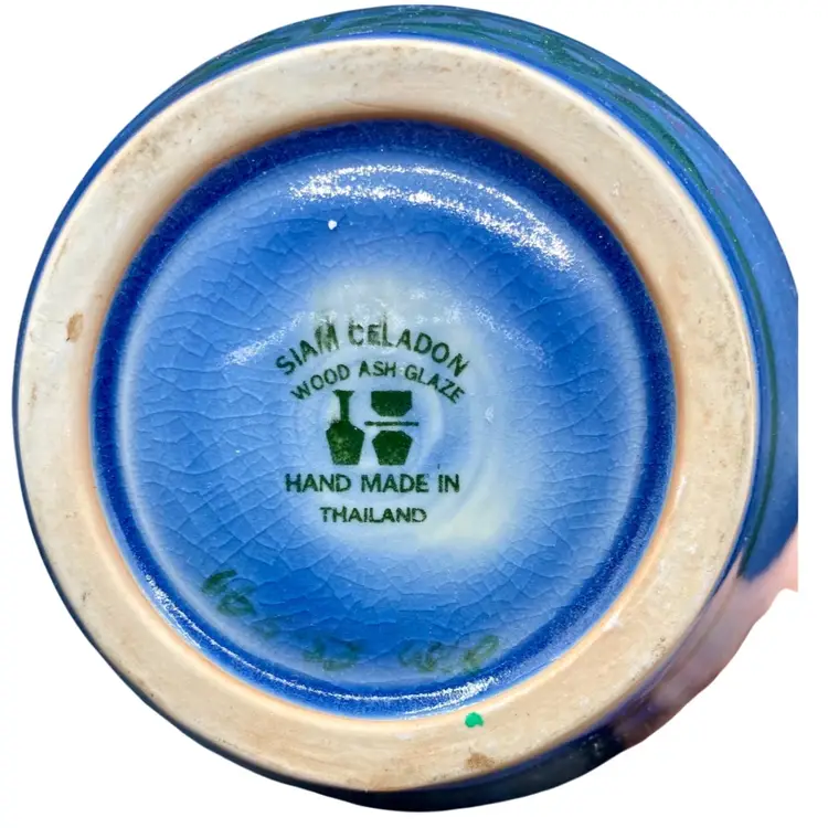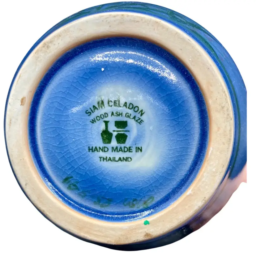 This vintage Siam Celadon Blue Vase is a charming addition to any collection. The vase features a beautiful design of flying and perched birds and long green and pink flowering reeds. Handmade in Thailand and created using a wood ash glaze, this vase is a reflection of Thai culture and craftsmanship.