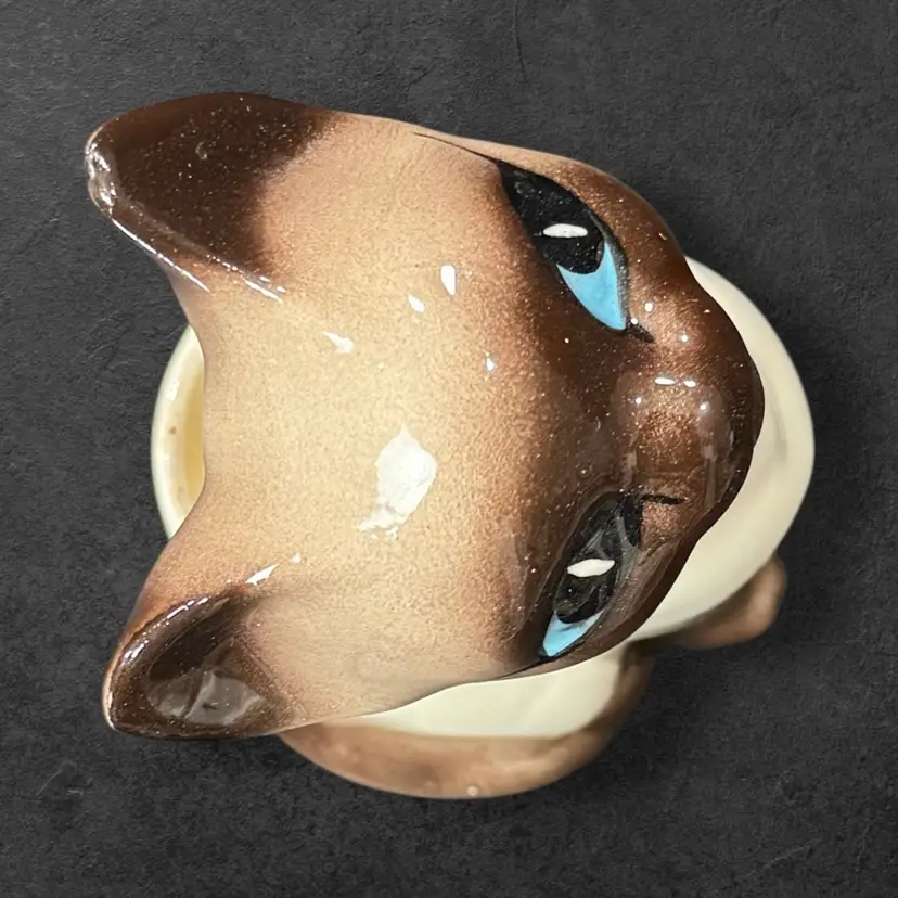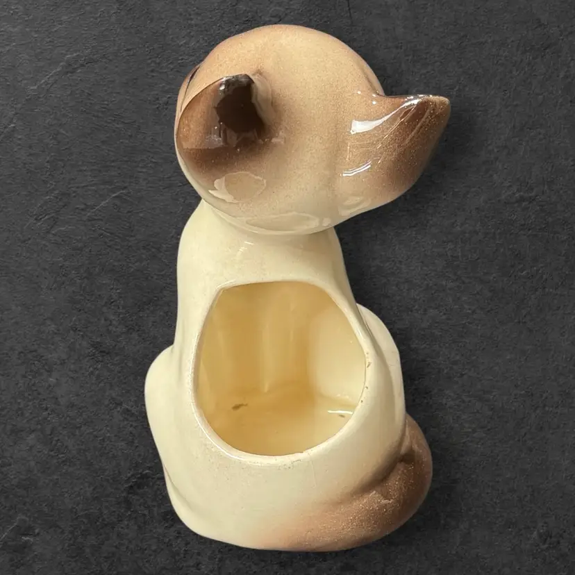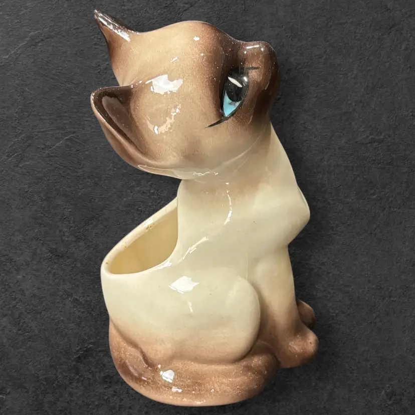 Vintage Siamese Cat Ceramic pottery planter, circa 1950’s. Measures 7” tall to the tip of his ears and 3-3/4” wide. Planter is in excellent vintage condition with no chips, cracks or repaired spots. There is some light crazing as shown in last picture.