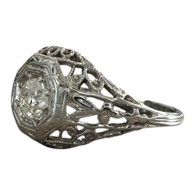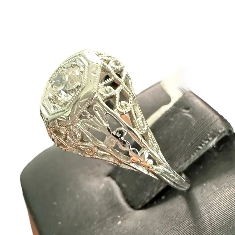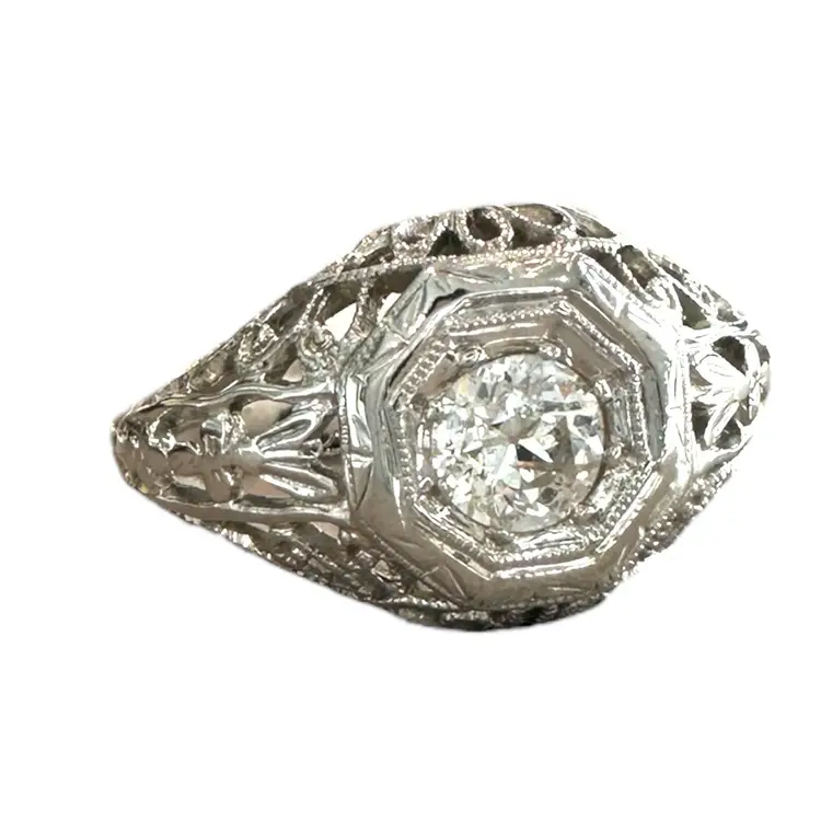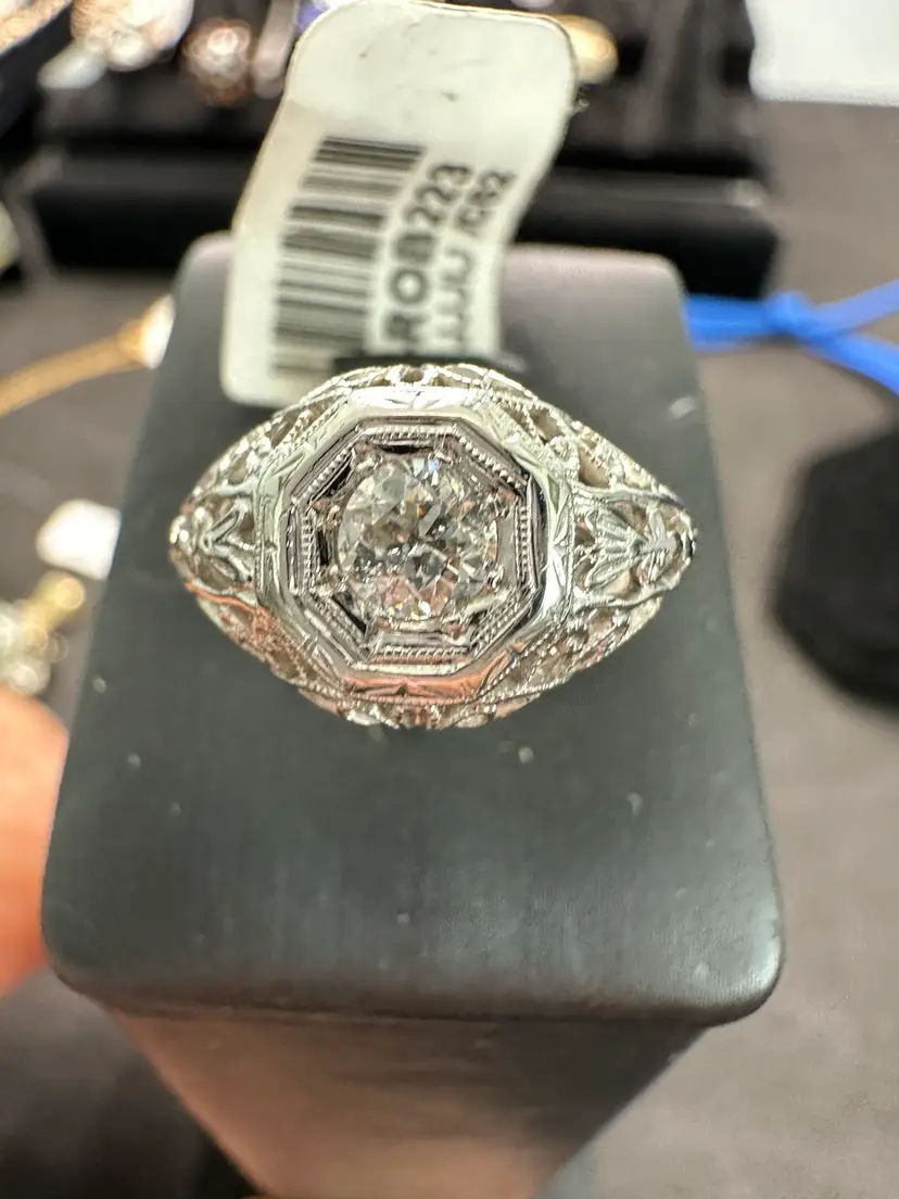 This vintage diamond ring consist of a European brilliant diamond measuring 5 mm with an estimated weight to .39 karat The quality of the diamond is a high color of F and the clarity is a SI3. The width of the ring is 10 mm and his Hallmark LAIS 18 karat.