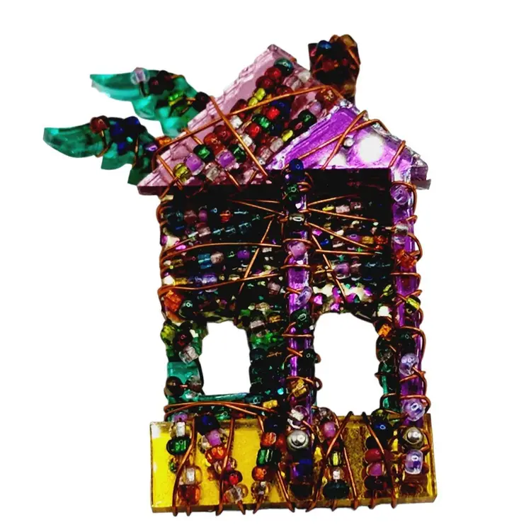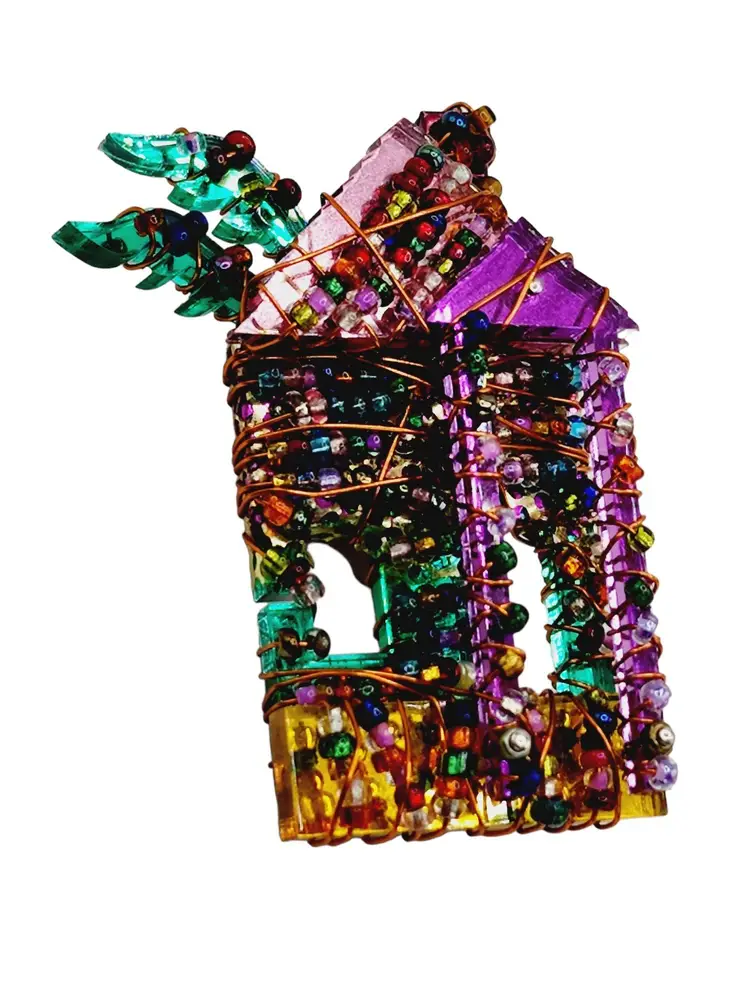 Hand-wired house-shaped brooch decorated with multicolor acrylic. Size: approximately 2.5'' Condition: very good Era: circa 1980s Signed: marked but hard to read