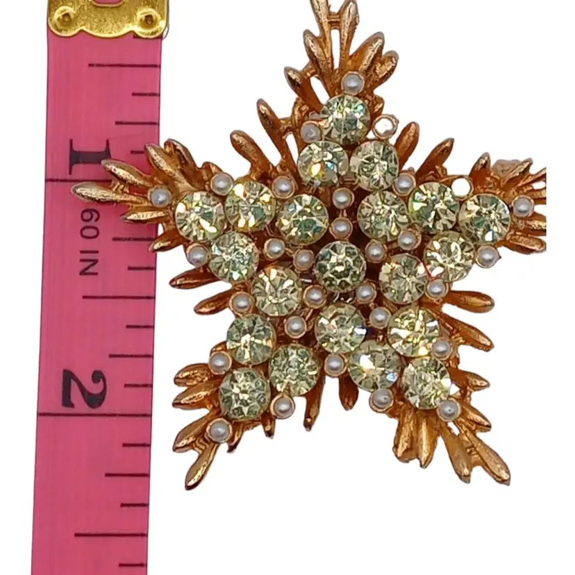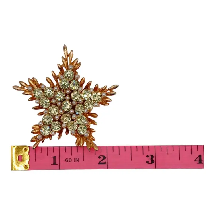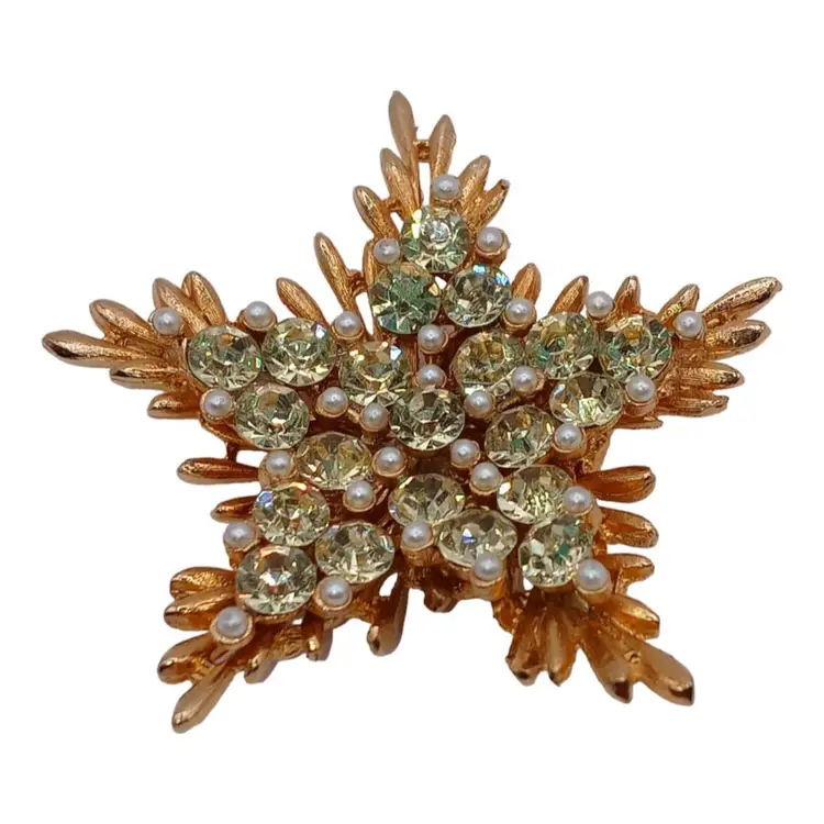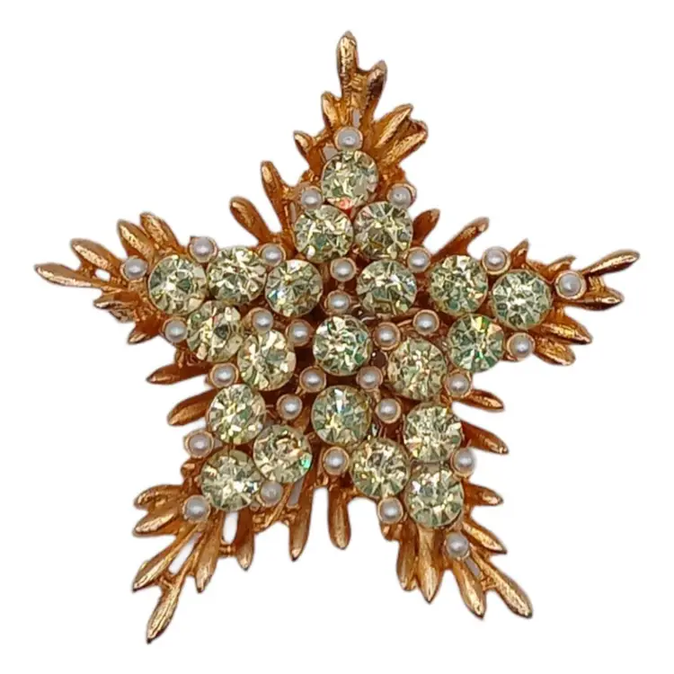 Adorned with light green rhinestones and faux pearls against a radiant gold-tone metal finish, this brooch exudes celestial allure. The intricate star design showcases the craftsmanship and attention to detail characteristic of BSK jewelry.