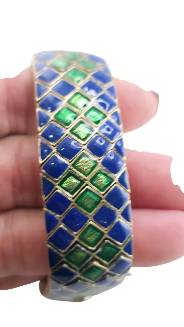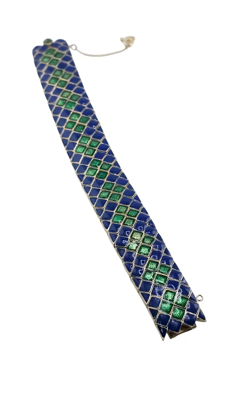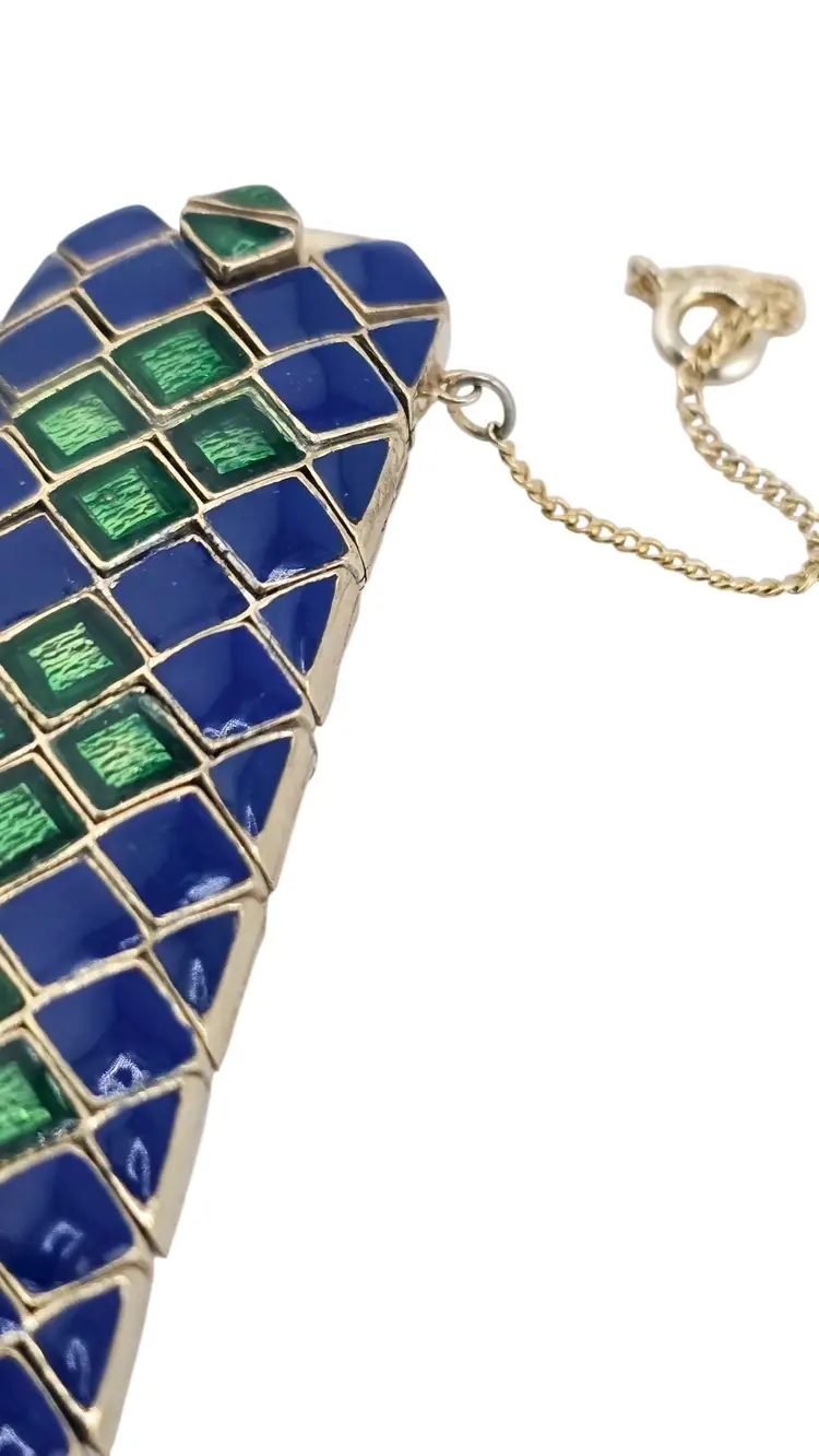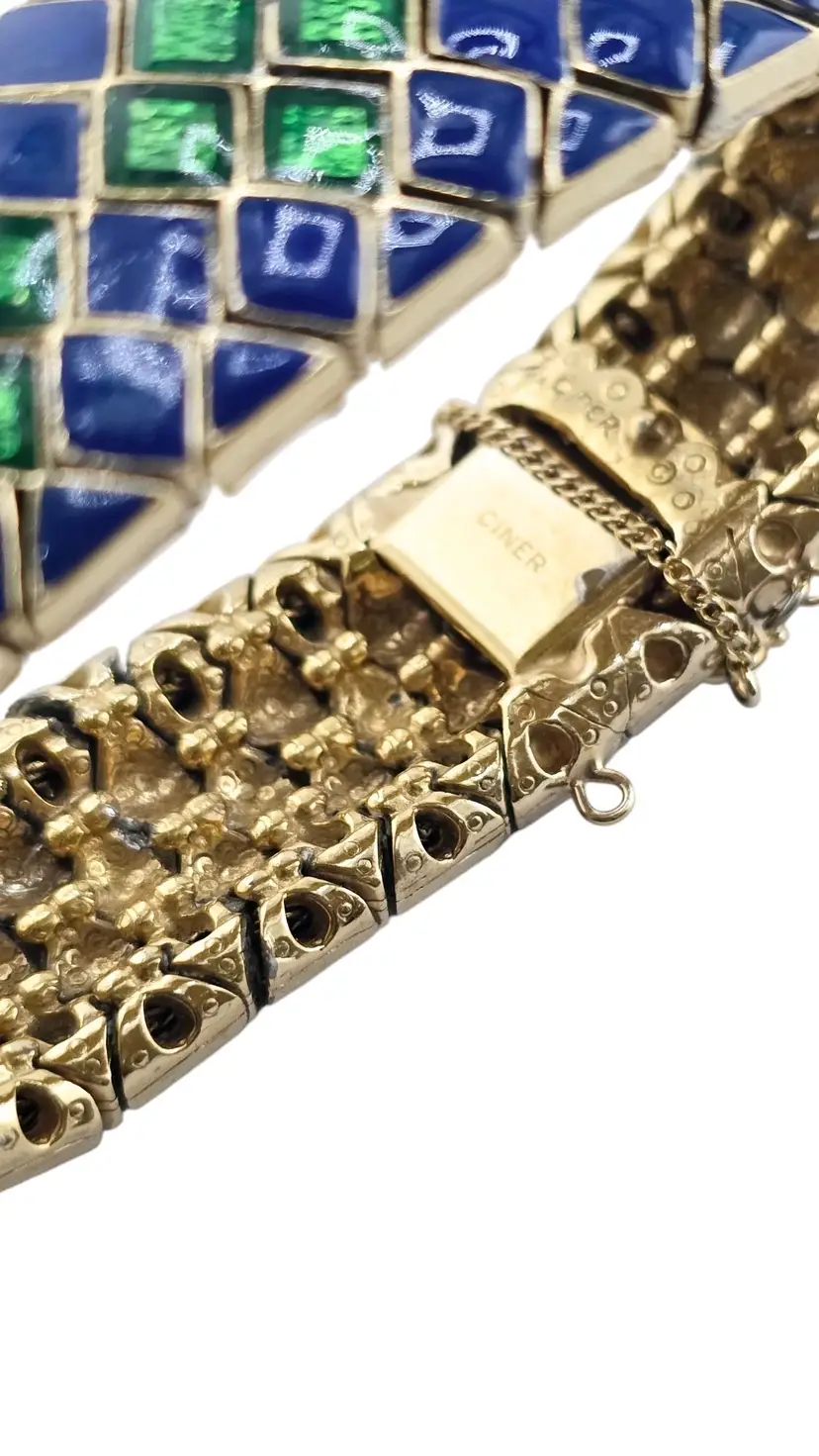 Size: 7.25" long by almost 1" wide Color: Blue, Green, Gold Condition: Very good vintage Signed: Ciner Details: In great condition, signed twice, has a safety chain—this is a heavy one!