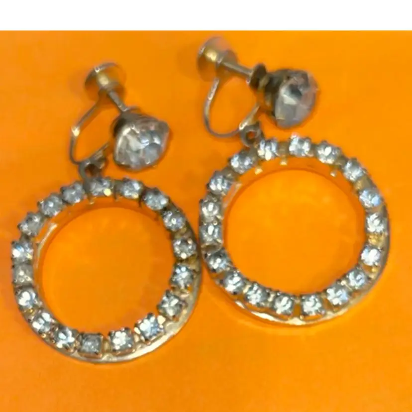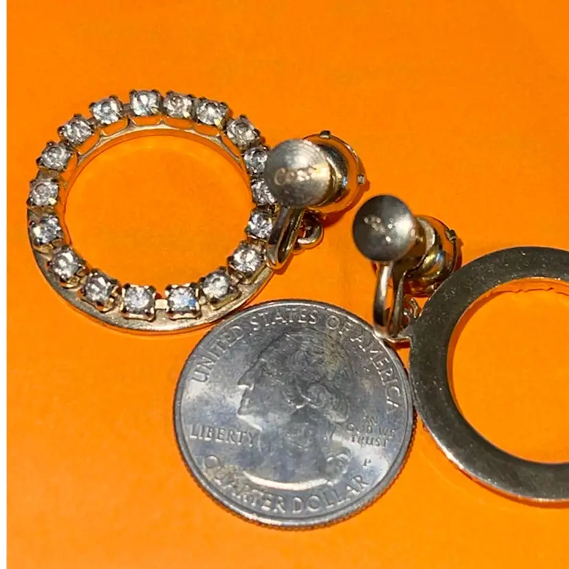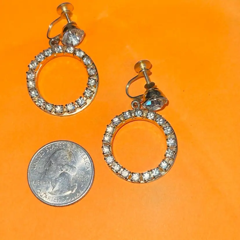 Fabulous! Vintage Signed Coro 60s Rhinestone Screw Back Hoop Earrings Set in gold Metal.
