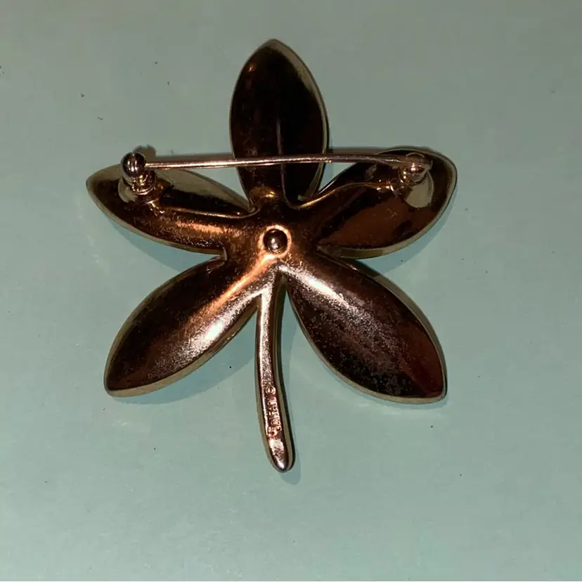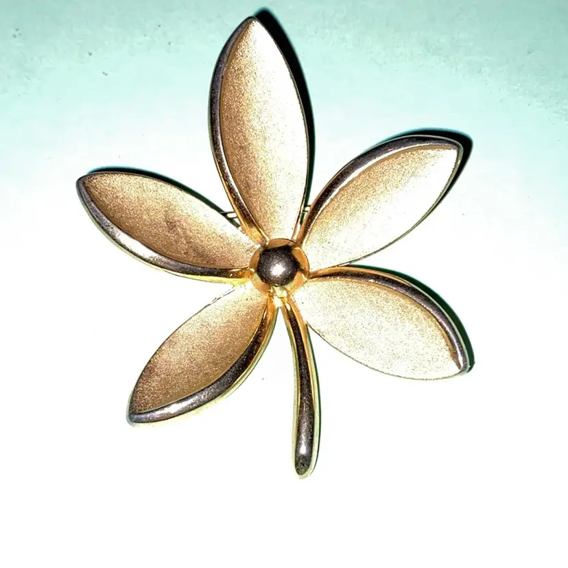Vintage signed Crown Trifari brushed gold plated brooch in the shape of a flower with five petals and stem. Brooch, which is outlined with glossy gold tone, measures 2 3/8" x 2" and is signed on the stem. Excellent condition