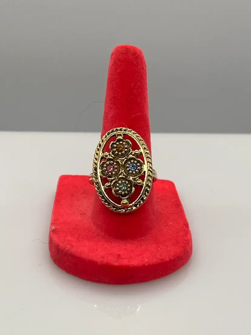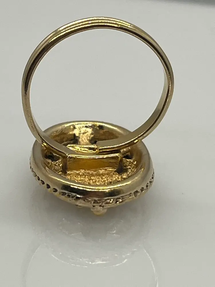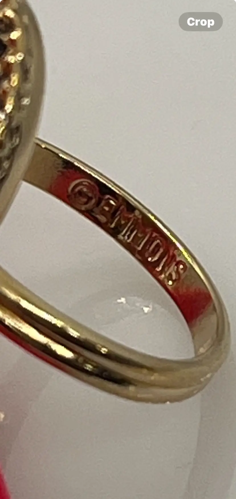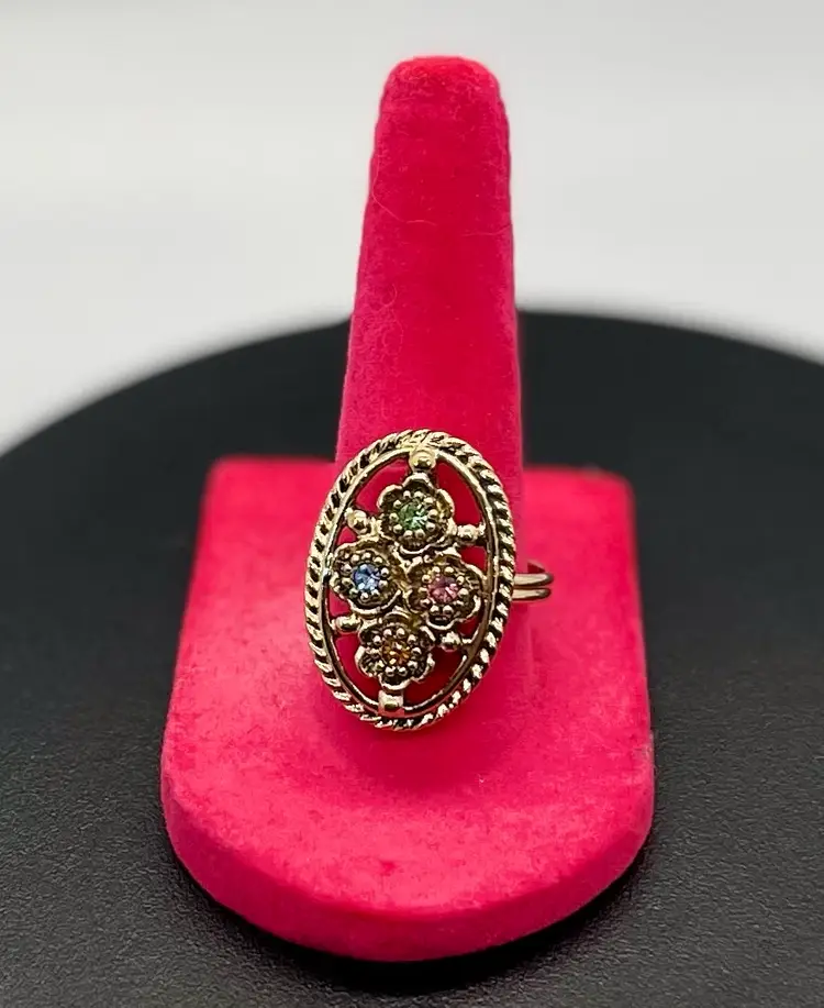 • Designer: Signed "©EMMONS" (the prestigious precursor to Sarah Coventry). • Style: Victorian/Etruscan Revival. • Era: Circa 1960s – 1970s. • Materials: High-quality gold-tone plating with sparkling glass rhinestones. • Size: Features an adjustable band, making it a perfect gift or a versatile addition to any collection (currently sits around a size 6-7 but can be gently resized). • Condition: Excellent vintage condition. The plating remains bright with a beautiful patina, and all stones are original and secure.