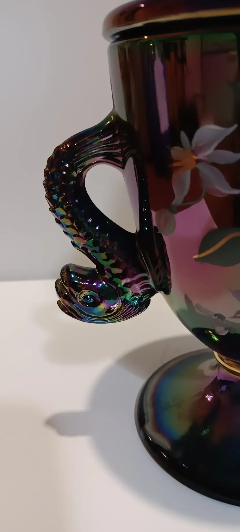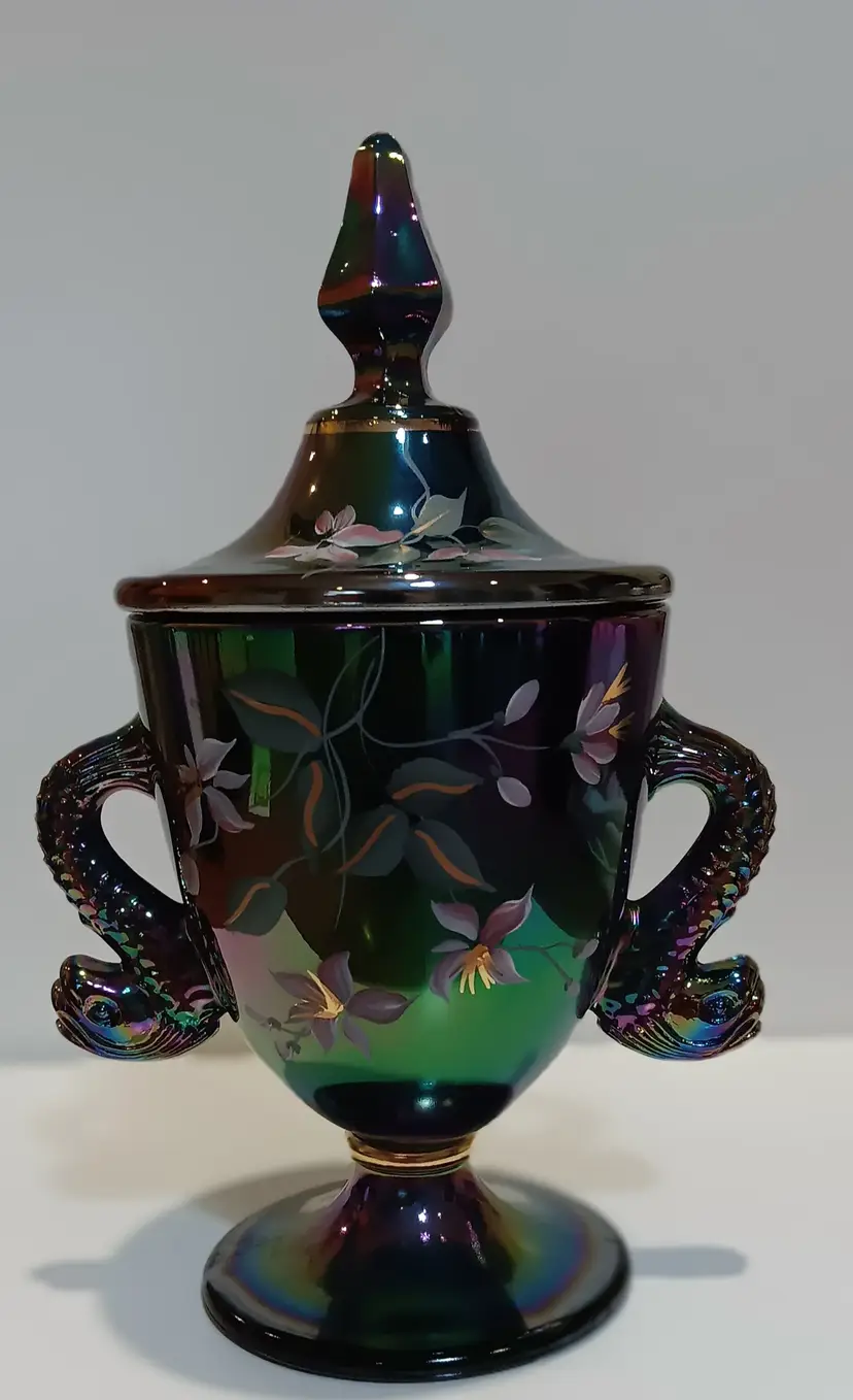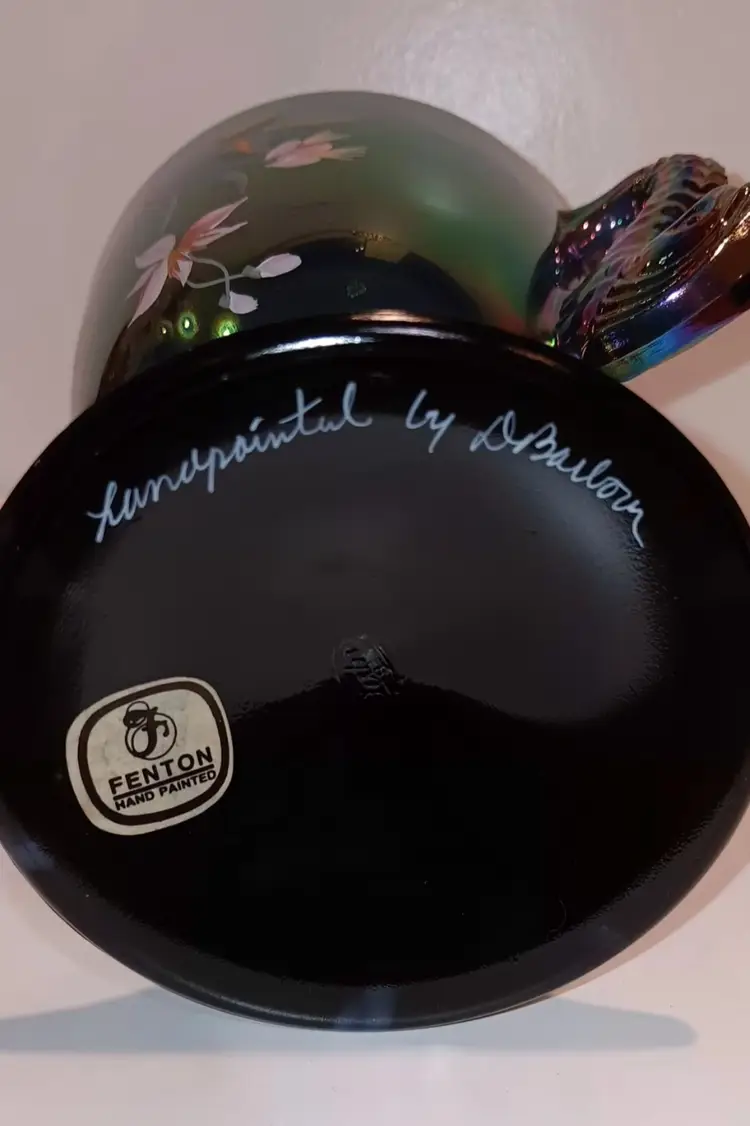 Stunning piece of black Fenton Glass! Hand painted by D. Barbour. Signed on the bottom with sticker. Initials on the lid. The colors are exceptional on this piece. The handle looks like a fish some say dolphin. Excellent condition no chips or cracks. Measuring 9" tall 6" wide 4" deep.