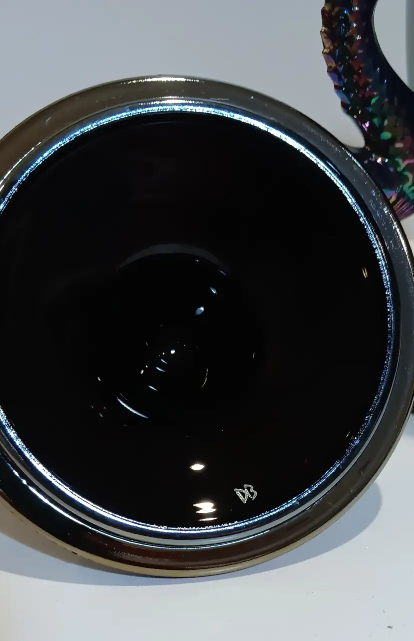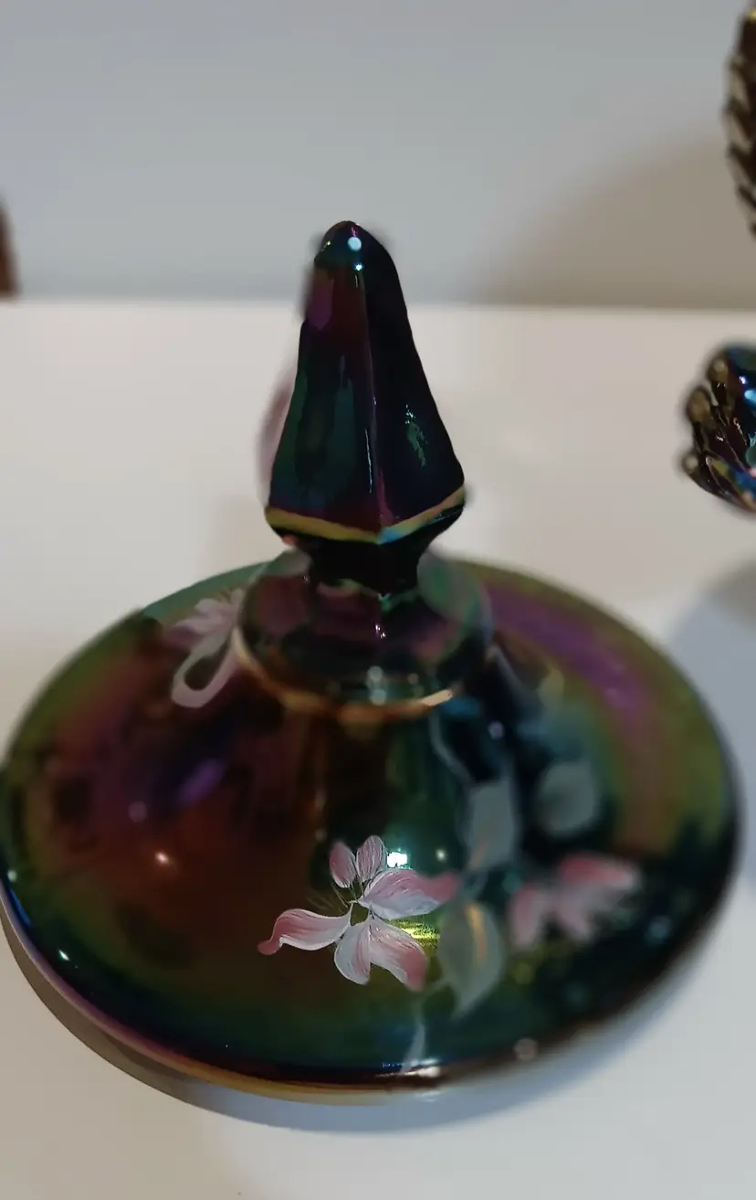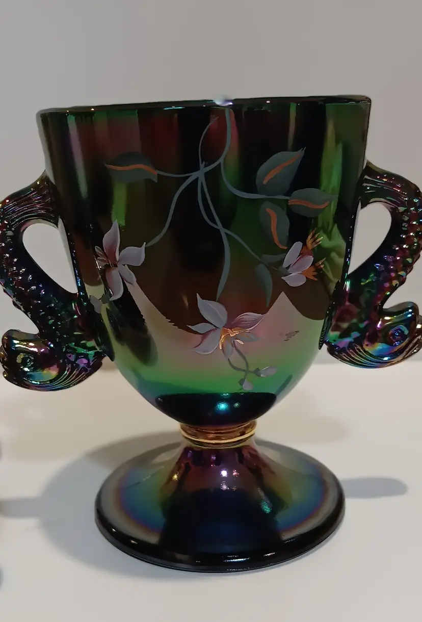 Stunning piece of black Fenton Glass! Hand painted by D. Barbour. Signed on the bottom with sticker. Initials on the lid. The colors are exceptional on this piece. The handle looks like a fish some say dolphin. Excellent condition no chips or cracks. Measuring 9" tall 6" wide 4" deep.