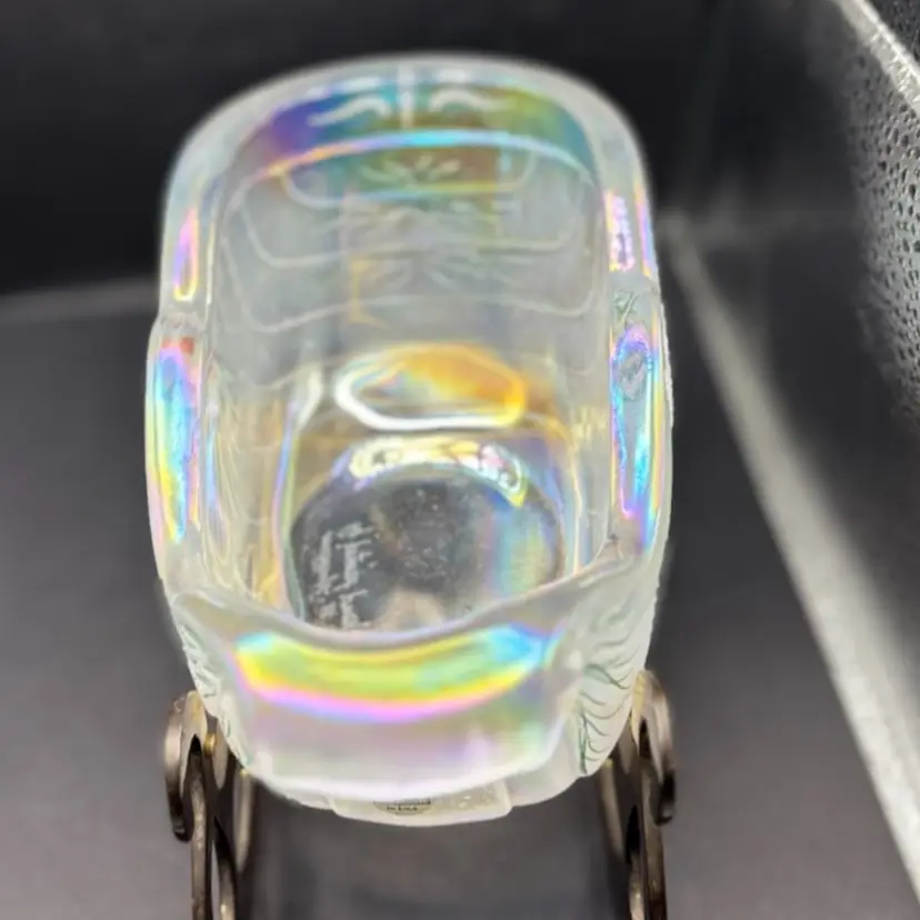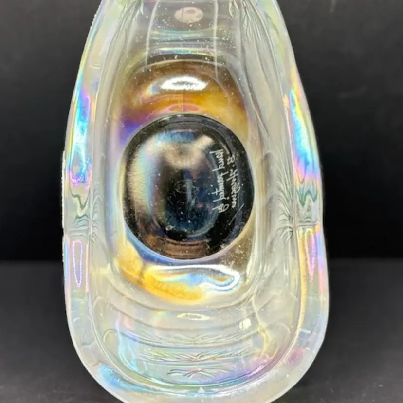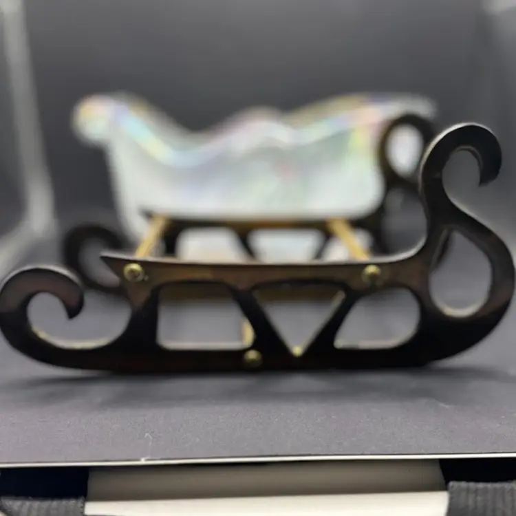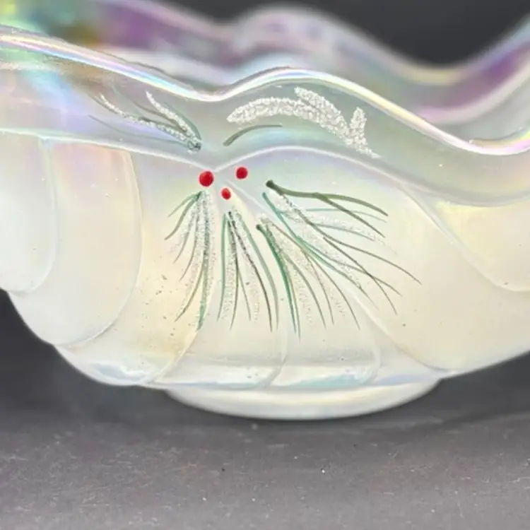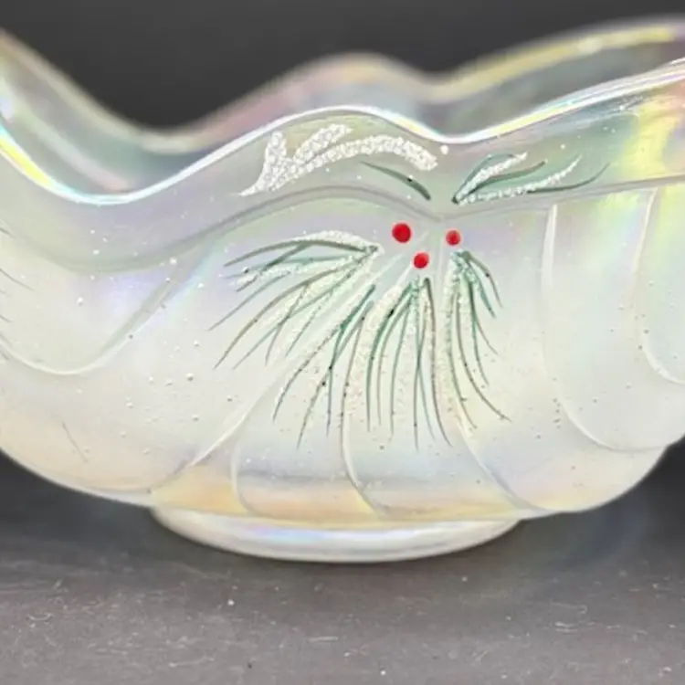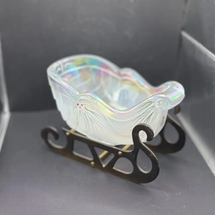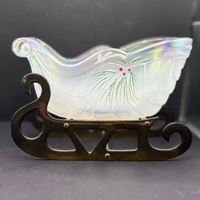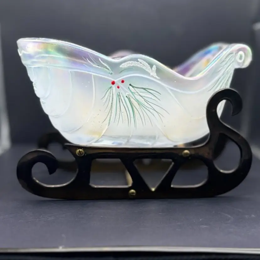 Lovely Christmas display piece. Carriage decorated with holly and glitter details. Signed. Original Fenton sticker. No chips cracks or repairs.