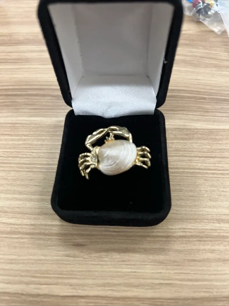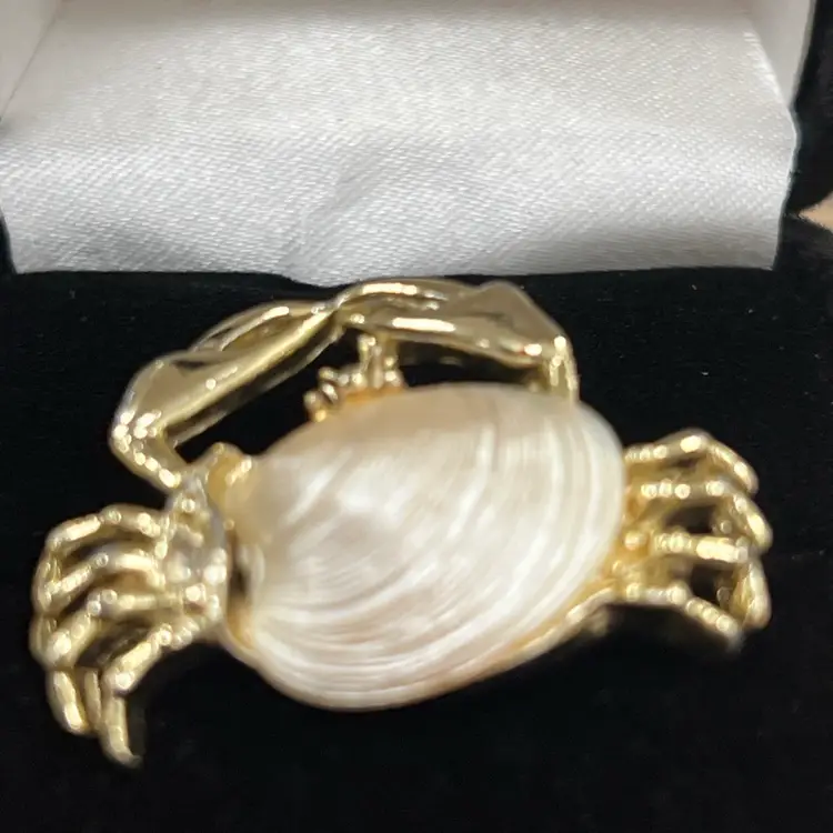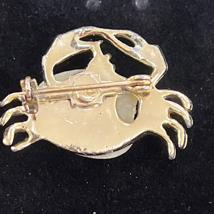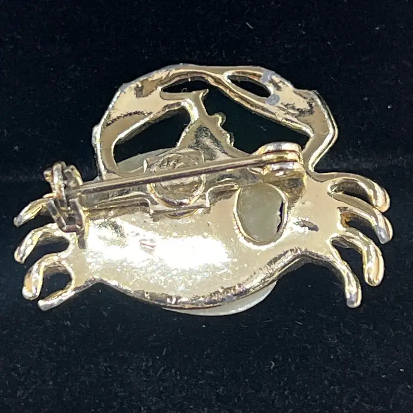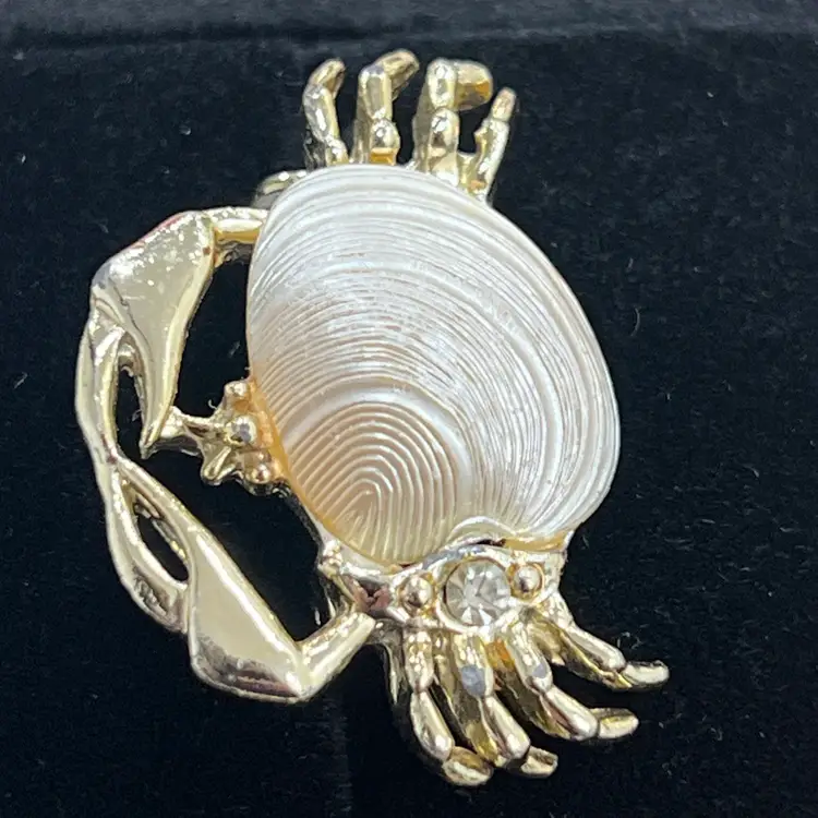 Add a touch of vintage charm to your outfit with this Gerry's crab brooch, featuring a gold tone finish and adorned with sparkling rhinestones. Crafted from lucite, this stylish piece is perfect for adding a nautical flair to any look. The brooch measures 1 inch and is signed by the brand. This fashion jewelry piece is a must-have for any collector of unique and beautiful brooches.