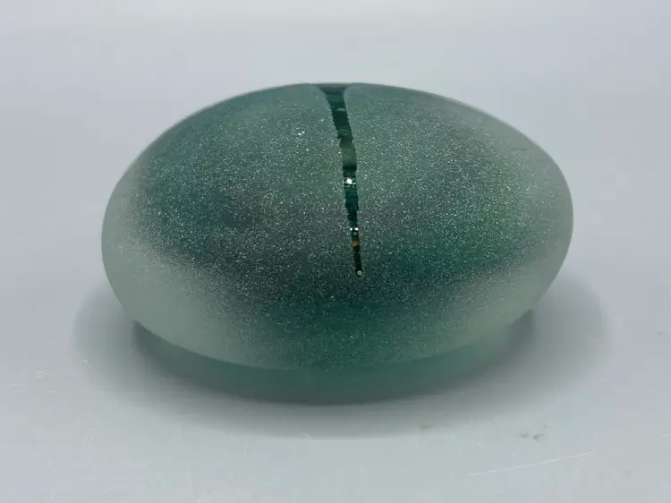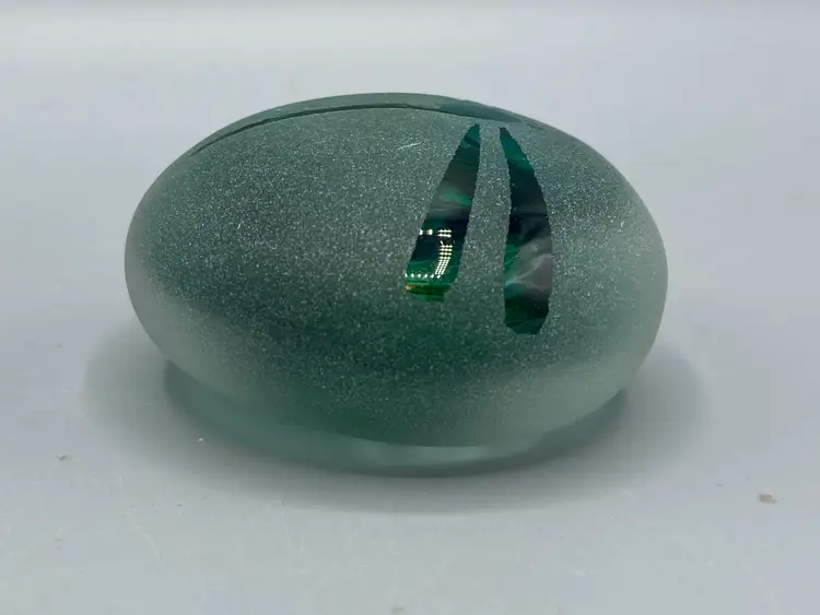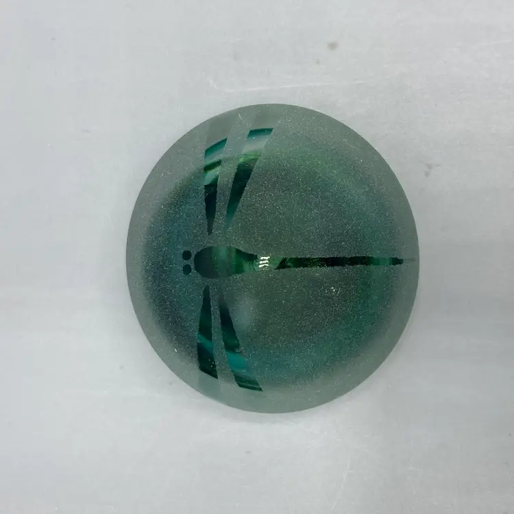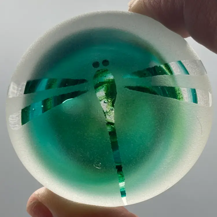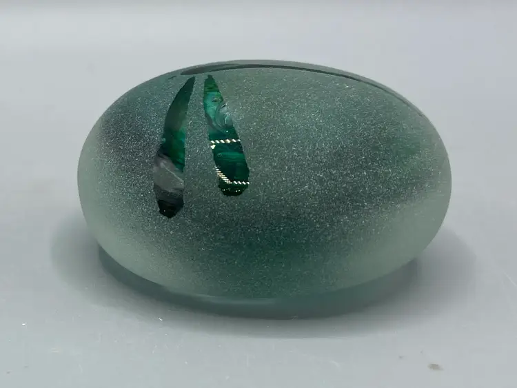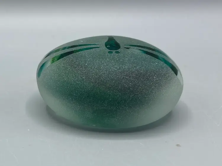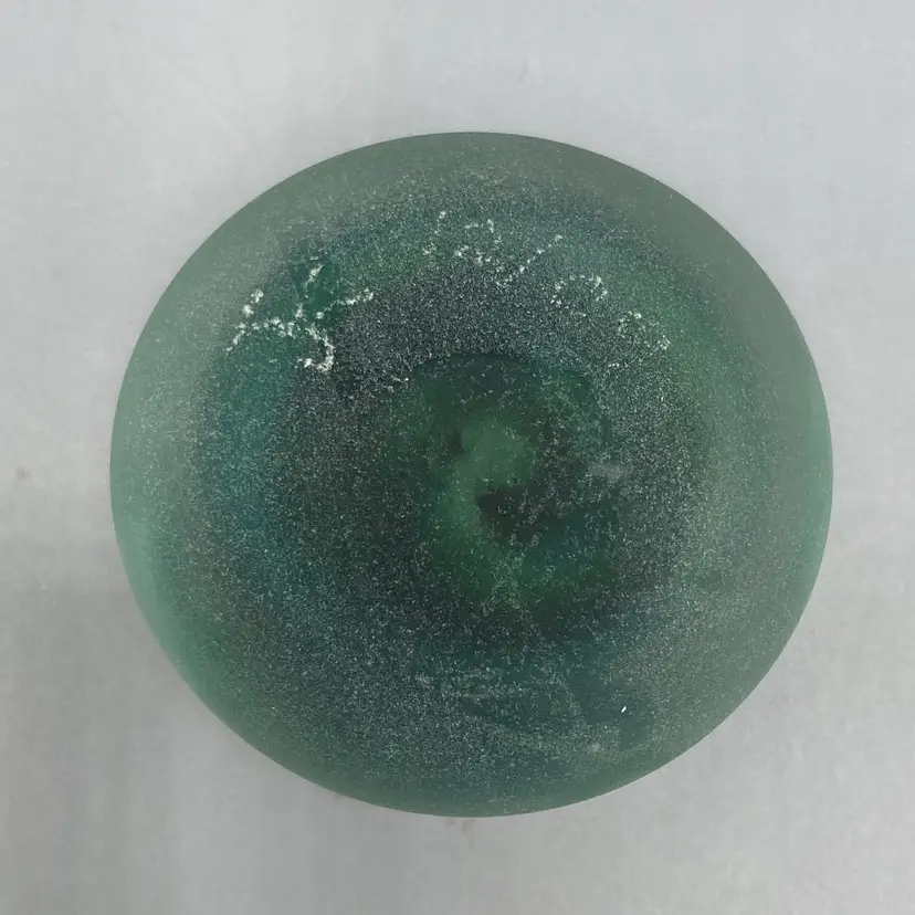 This paperweight is in good condition. It is signed "HS 12/09" on the bottom. It measures 2" across x 1" tall.