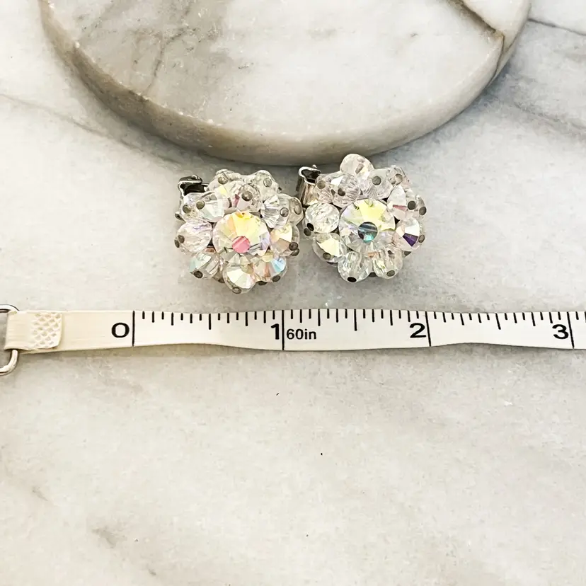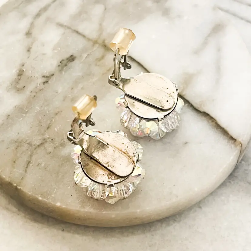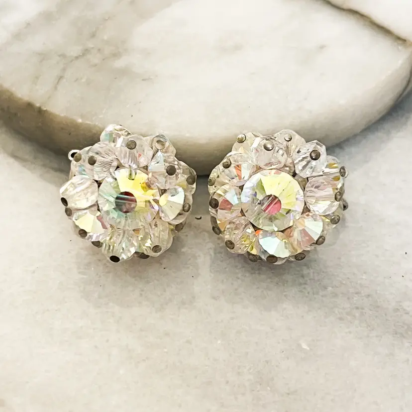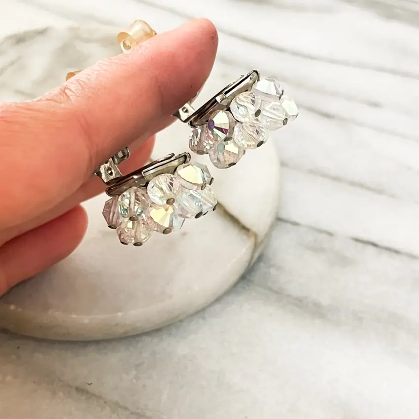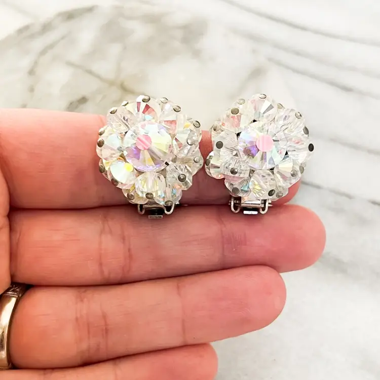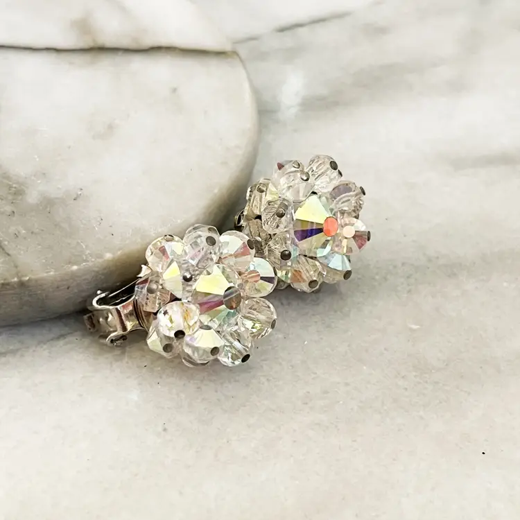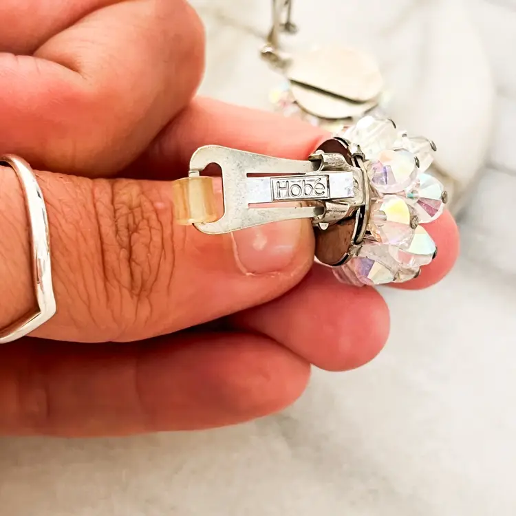 Vintage Signed Hobe Earrings AB Aurora Borealis Crystal Faceted Beads Clip On Silver Toned Metal
