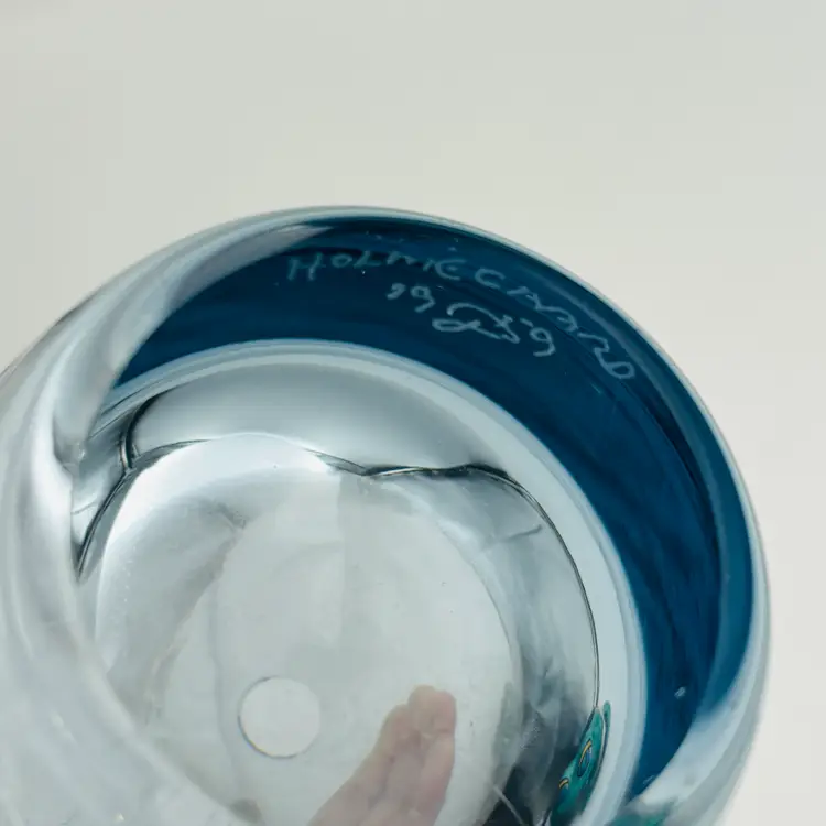 Features: it has the "Holmegaard" signature with 1959 date and "PL" monogram for designer Per Lutken. The color is clear in a blue shade /tint/hue.