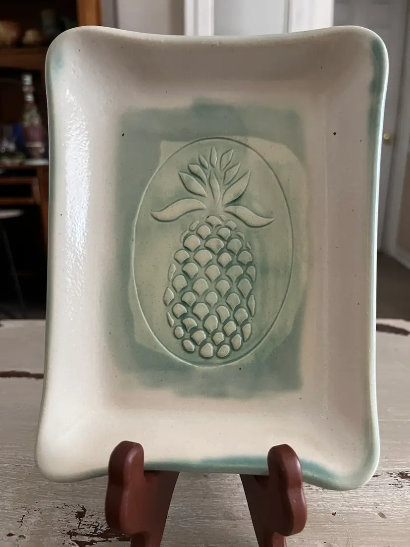 Cute trinket tray with pineapple made by Hugh Wayne, a South Carolina potter 7 x 5 12.2 oz