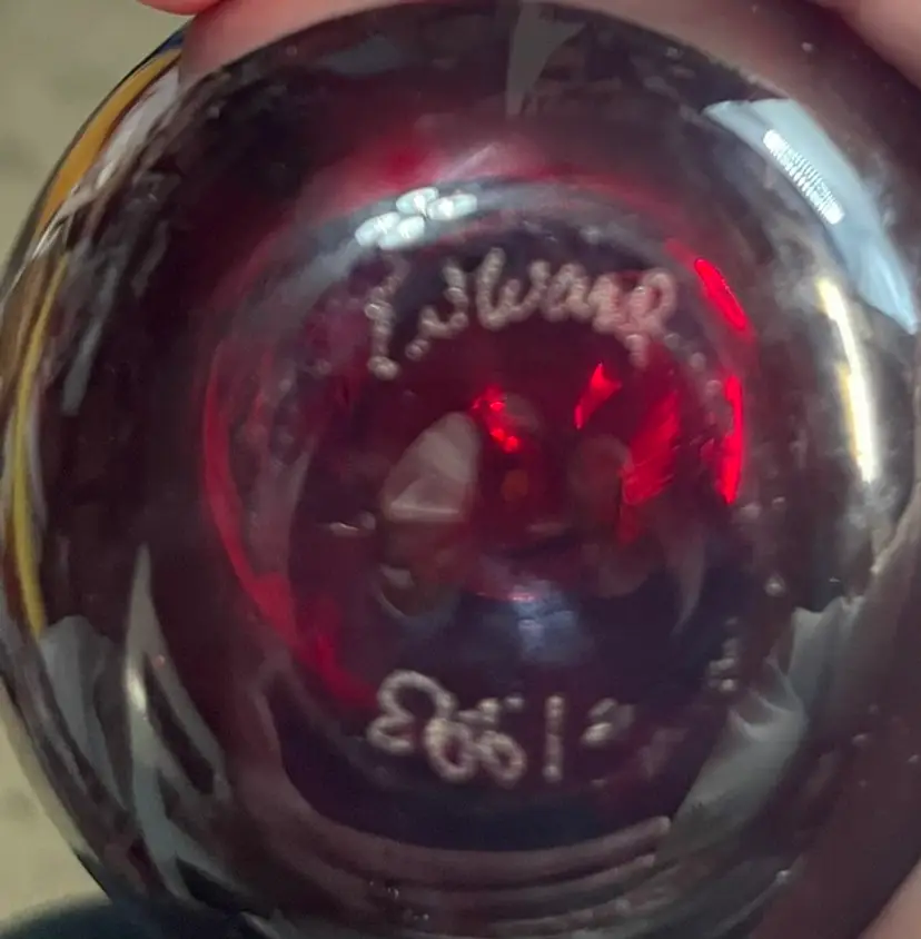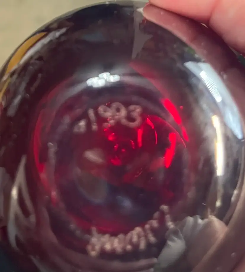 Features a deep ruby red color with clear leaf and stem. Signed by Leo Ward and dated 1993. Measures 4.25 inches tall.