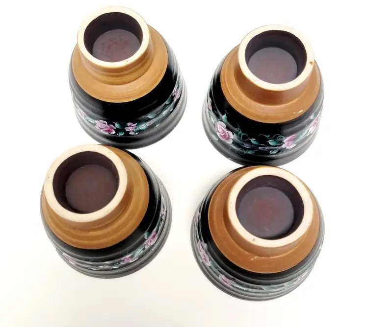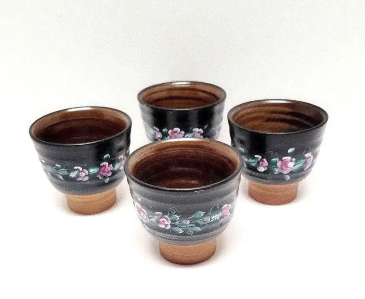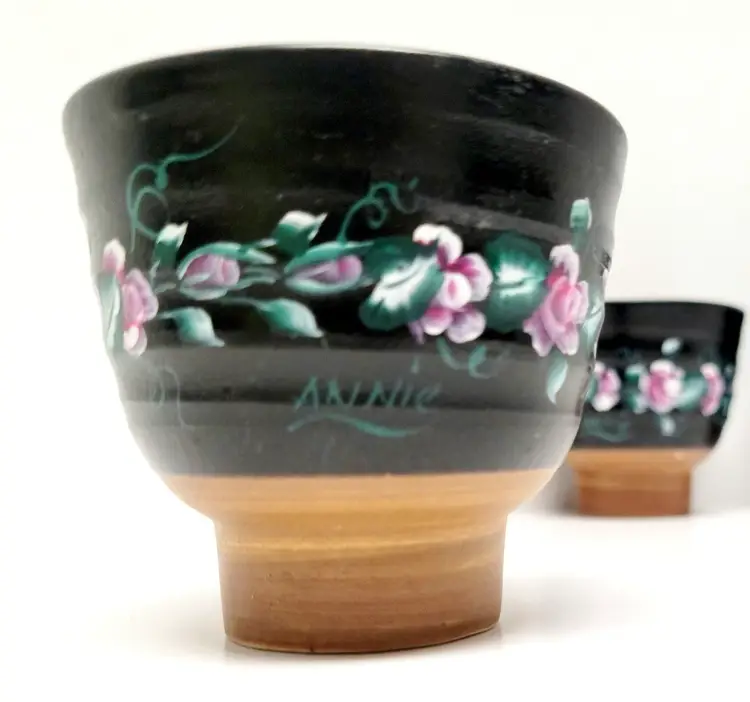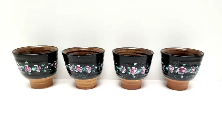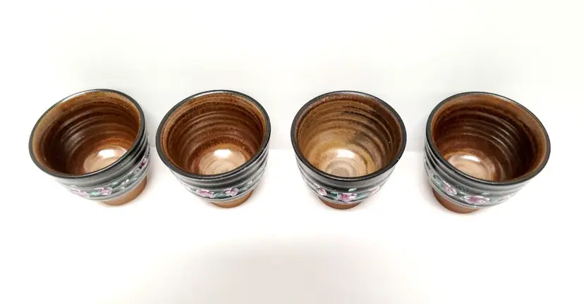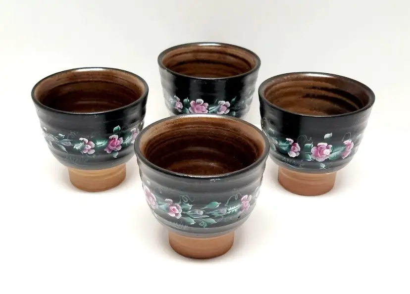 Set of four vintage pottery matcha teacups. Hand painted flowers. Artist signed “Annie”. Vintage condition, as seen in photos.