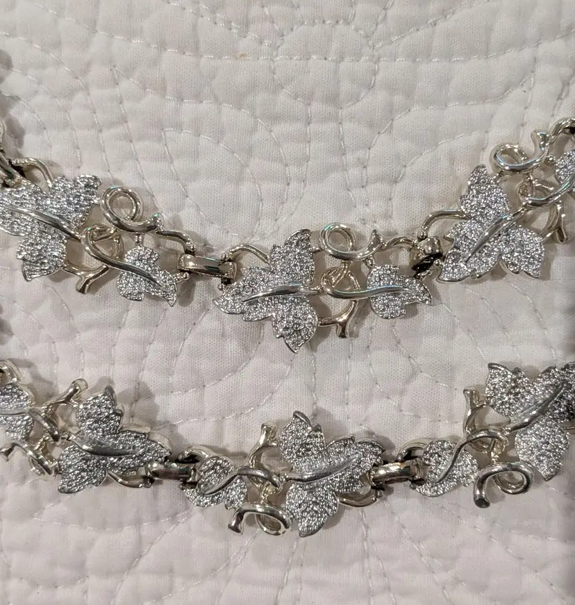 Necklace is 17-1/2" long and bracelet is 6-1/2" long with a food over clasp. Marked SC