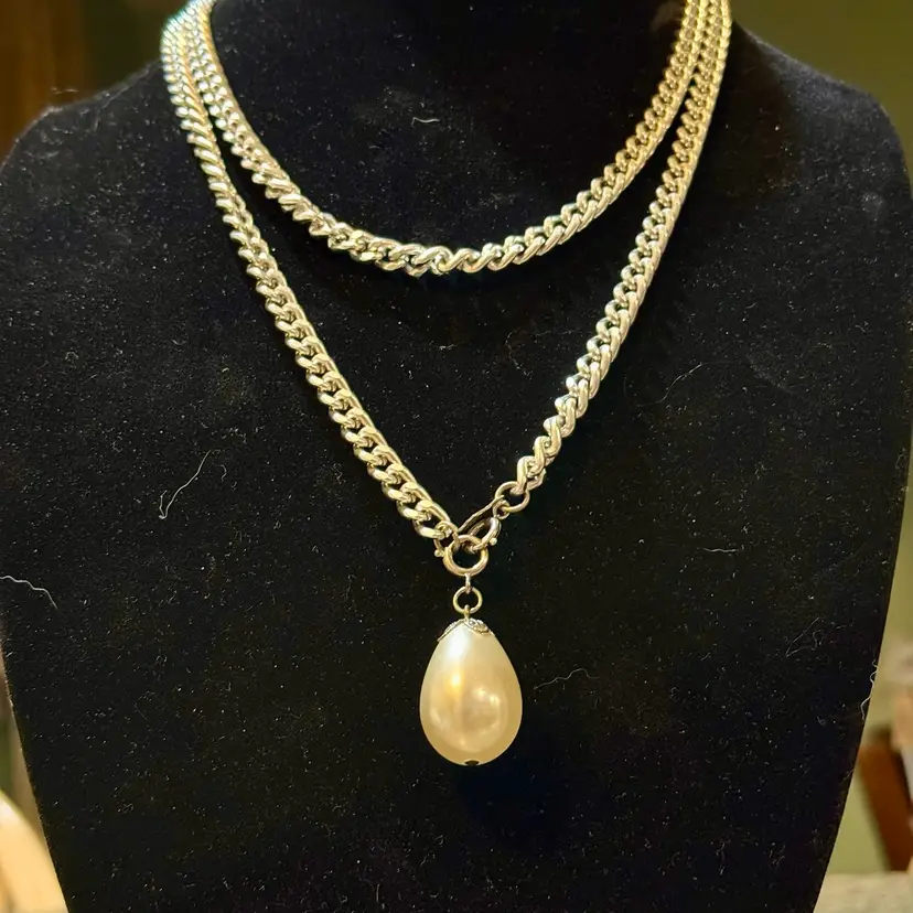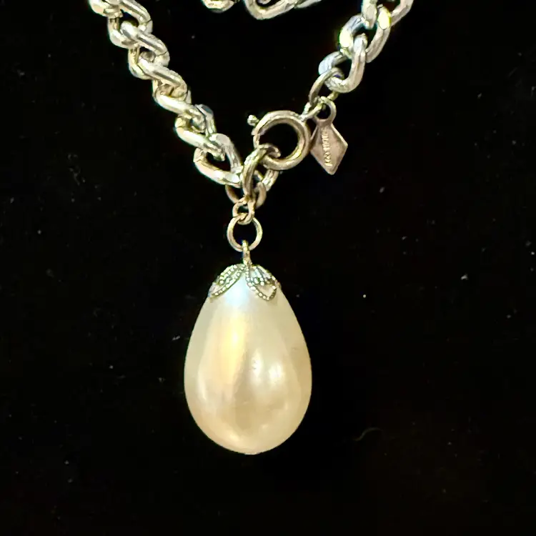 Necklace approx 40”, faux baroque pearl charm approx 1.5” long; signed Sarah Cov; good condition; no issues.