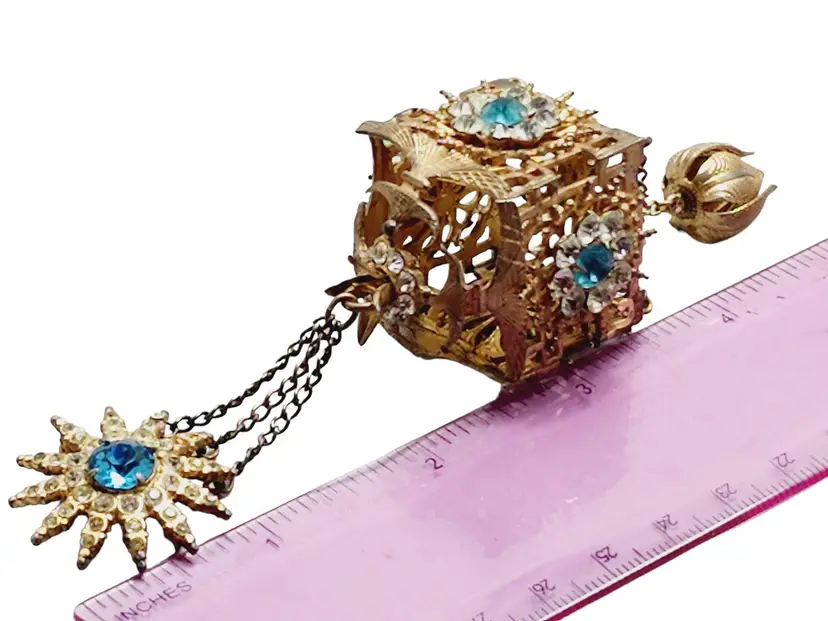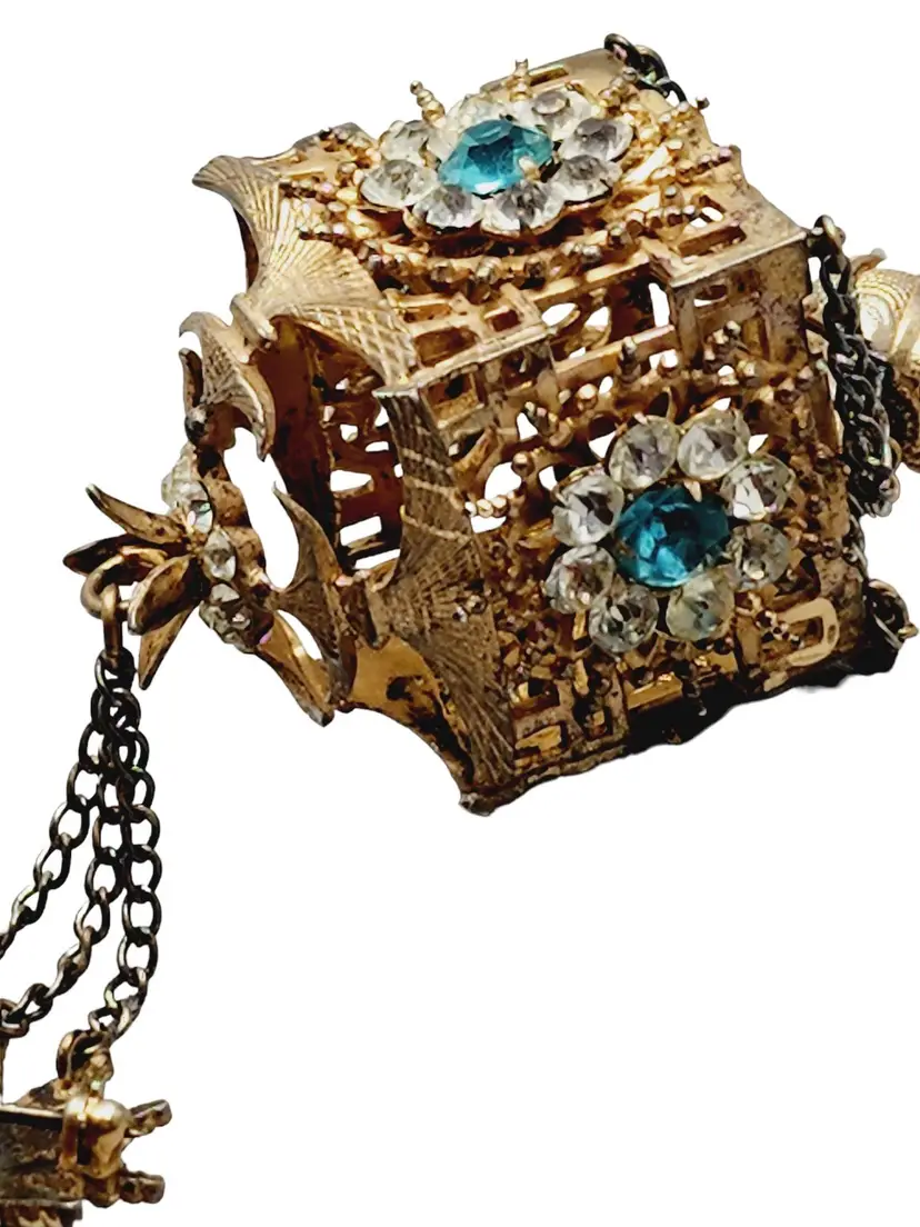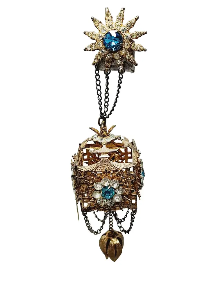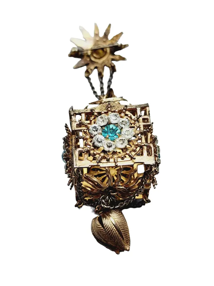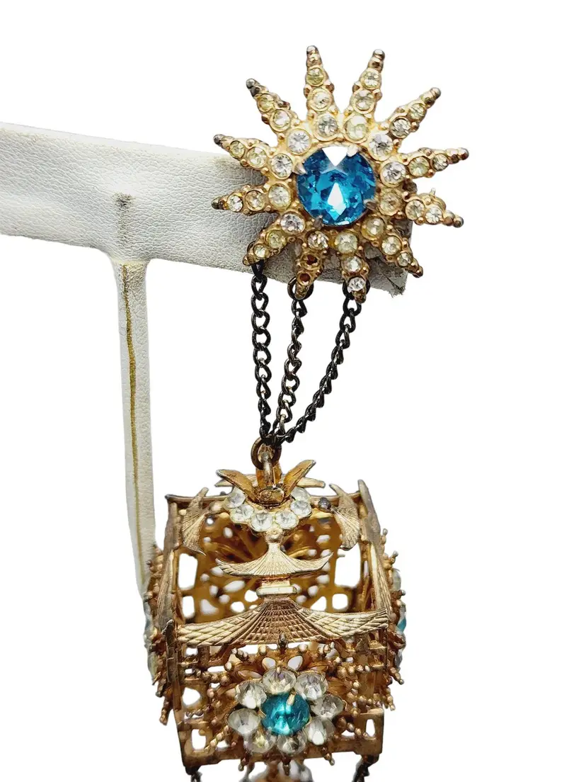 Its fabulous and vintage. The starburst has a beautiful blue stone in the center and it is studded with rhinestones. Attached is a hanging pagoda adorned with clear and blue stones. Yes, there are 2 tiny rhinestones out on the starburst, but I think its spectacular. Hallmarked Sterling by French. This would be a great addition to your vintage jewelry collection or make a great vintage gift!