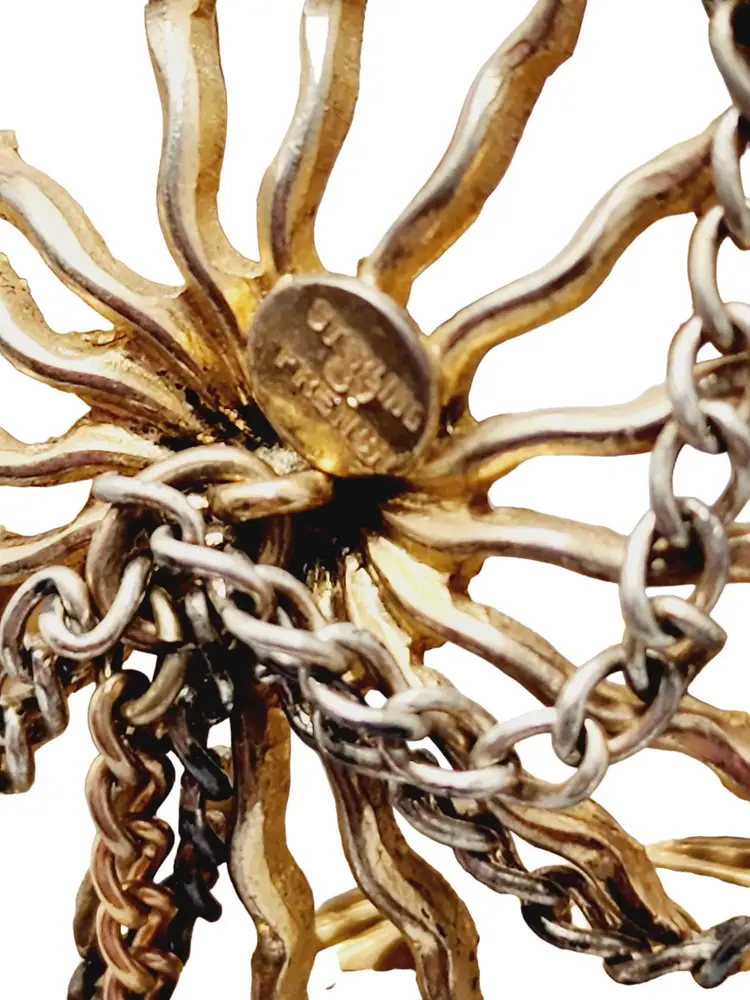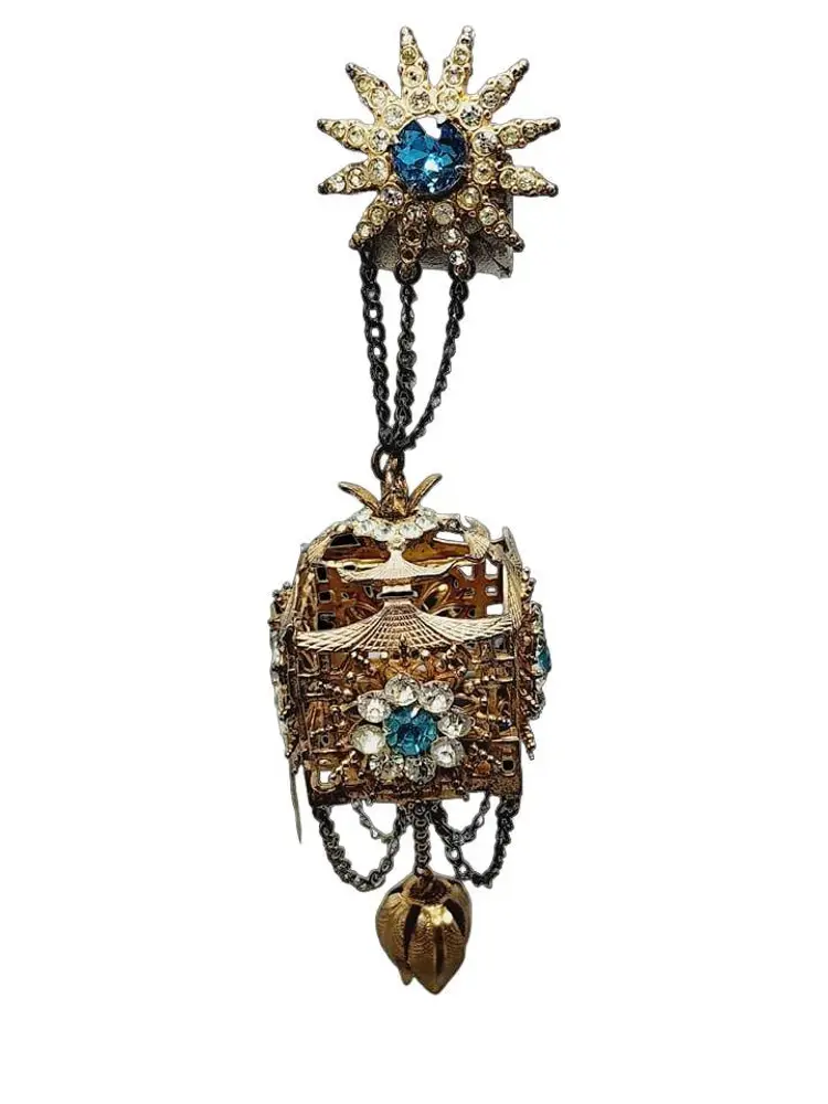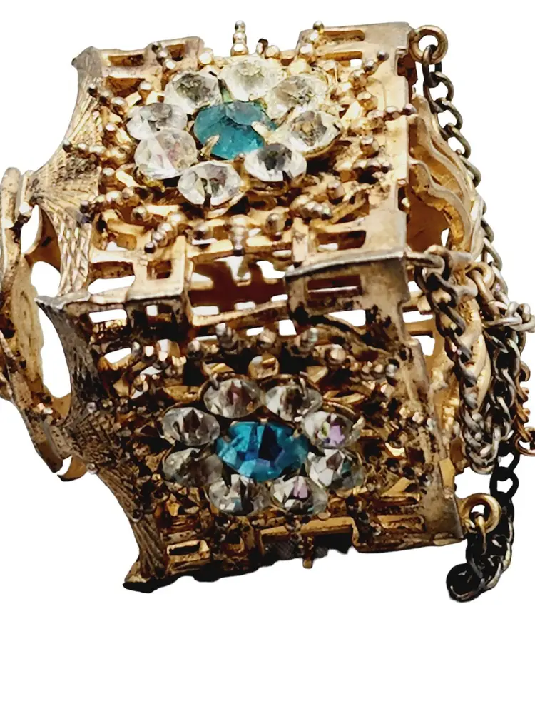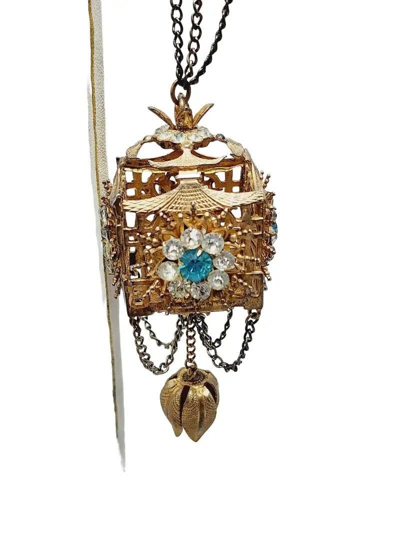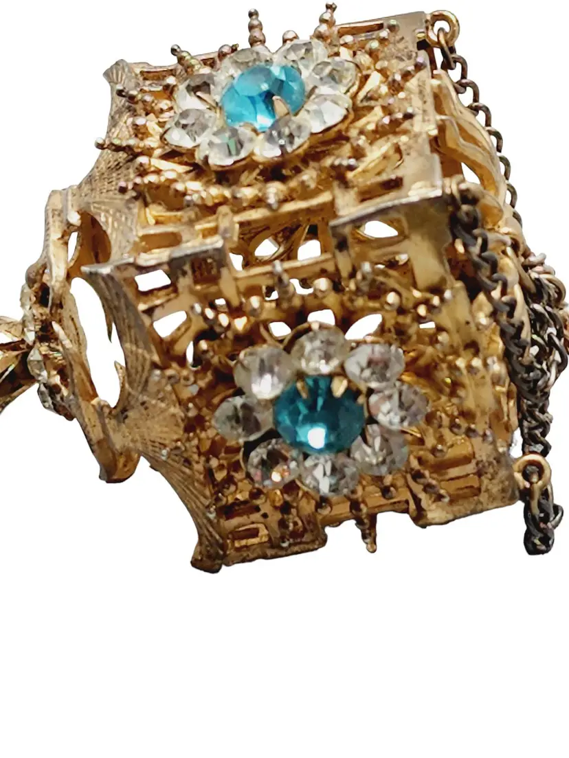 Its fabulous and vintage. The starburst has a beautiful blue stone in the center and it is studded with rhinestones. Attached is a hanging pagoda adorned with clear and blue stones. Yes, there are 2 tiny rhinestones out on the starburst, but I think its spectacular. Hallmarked Sterling by French. This would be a great addition to your vintage jewelry collection or make a great vintage gift!
