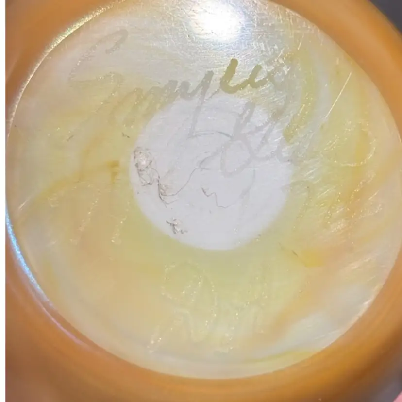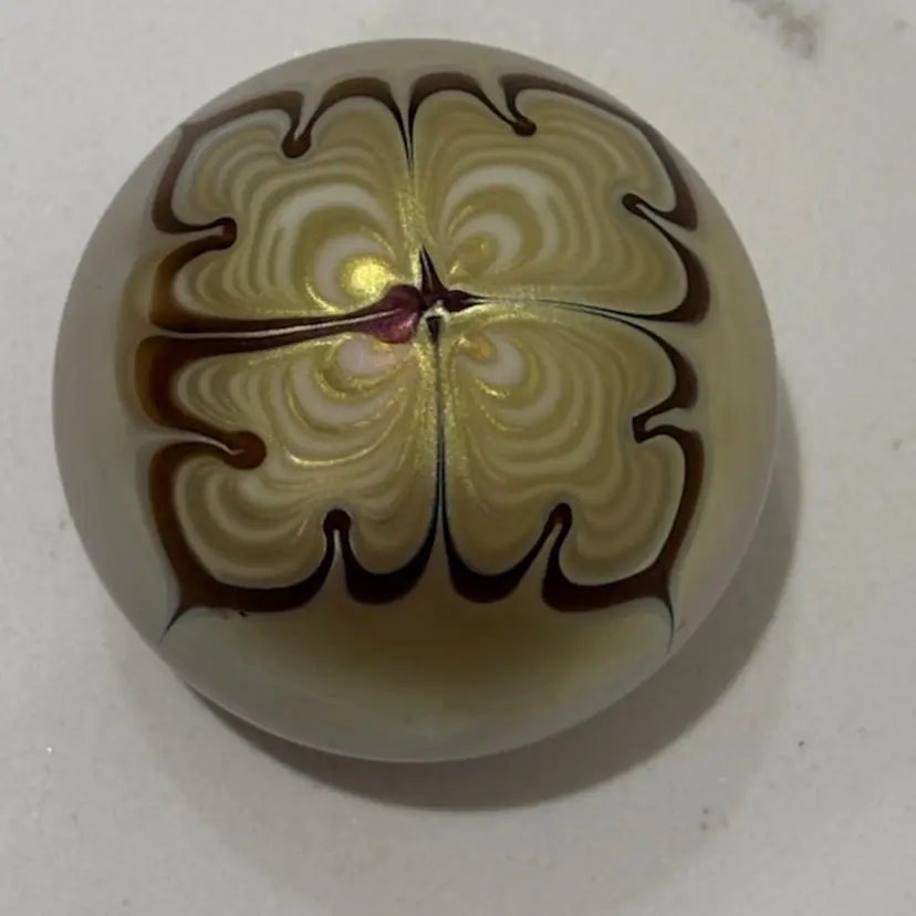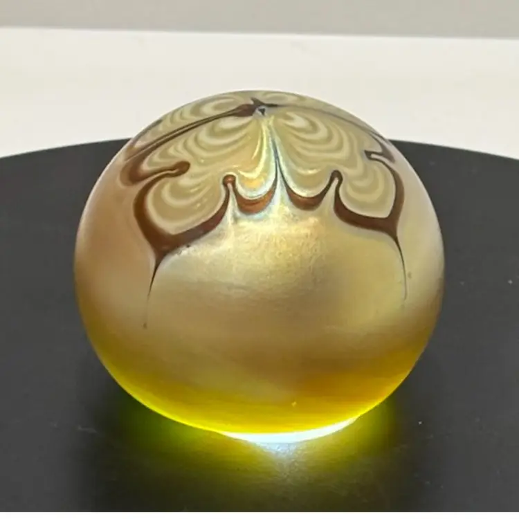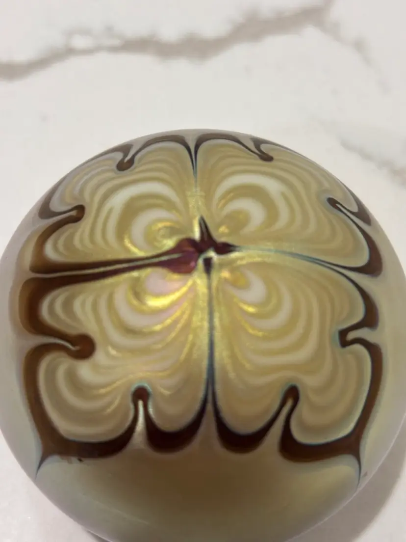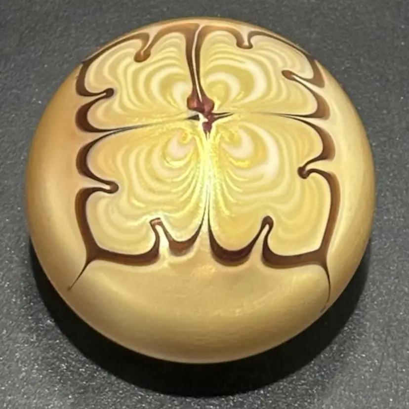 Lovely gold. 2.5” w x 2.25” ht. No chips cracks or repairs. Signature reads “ Smyers Glass 77 DA”.