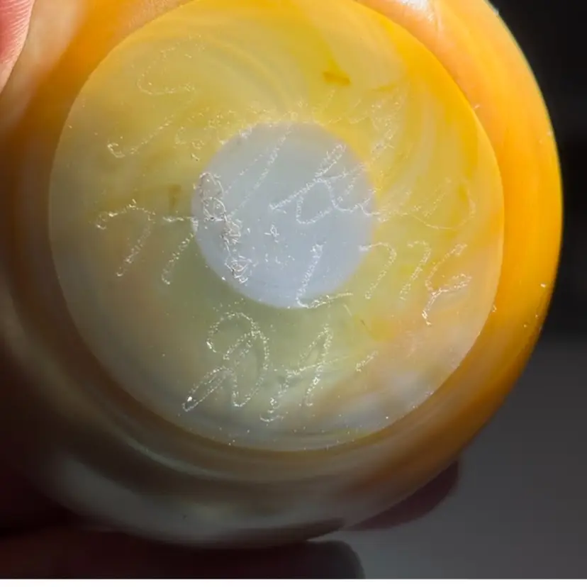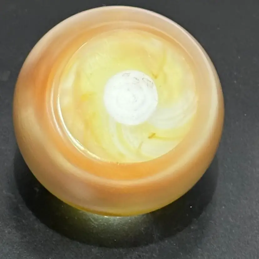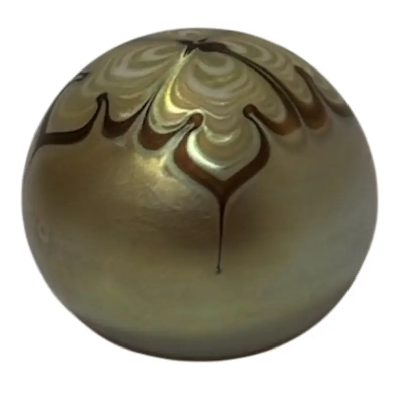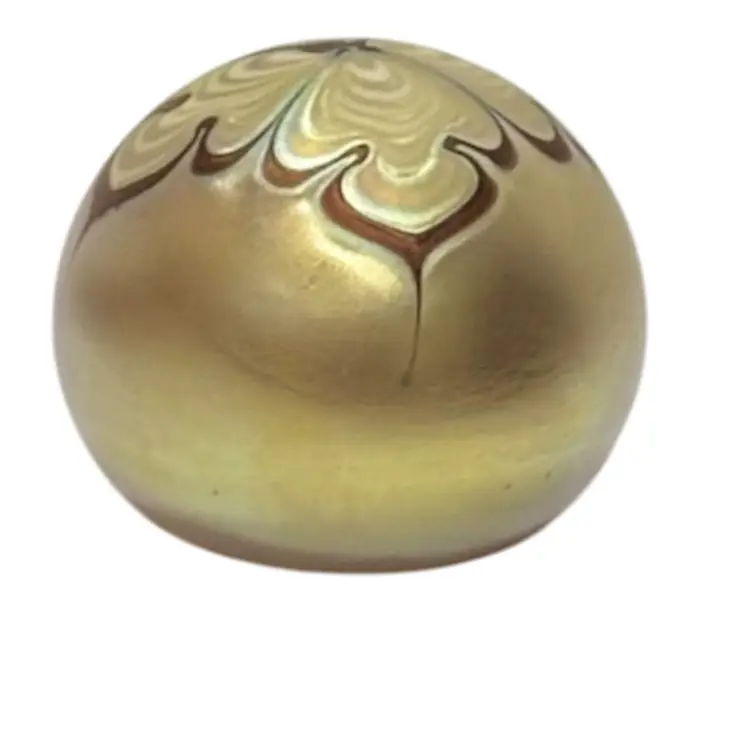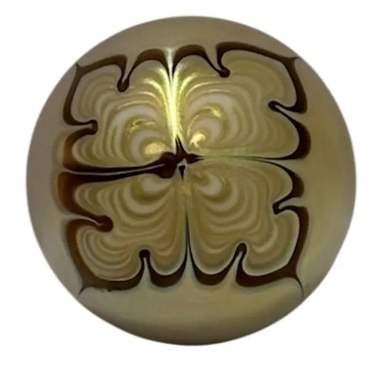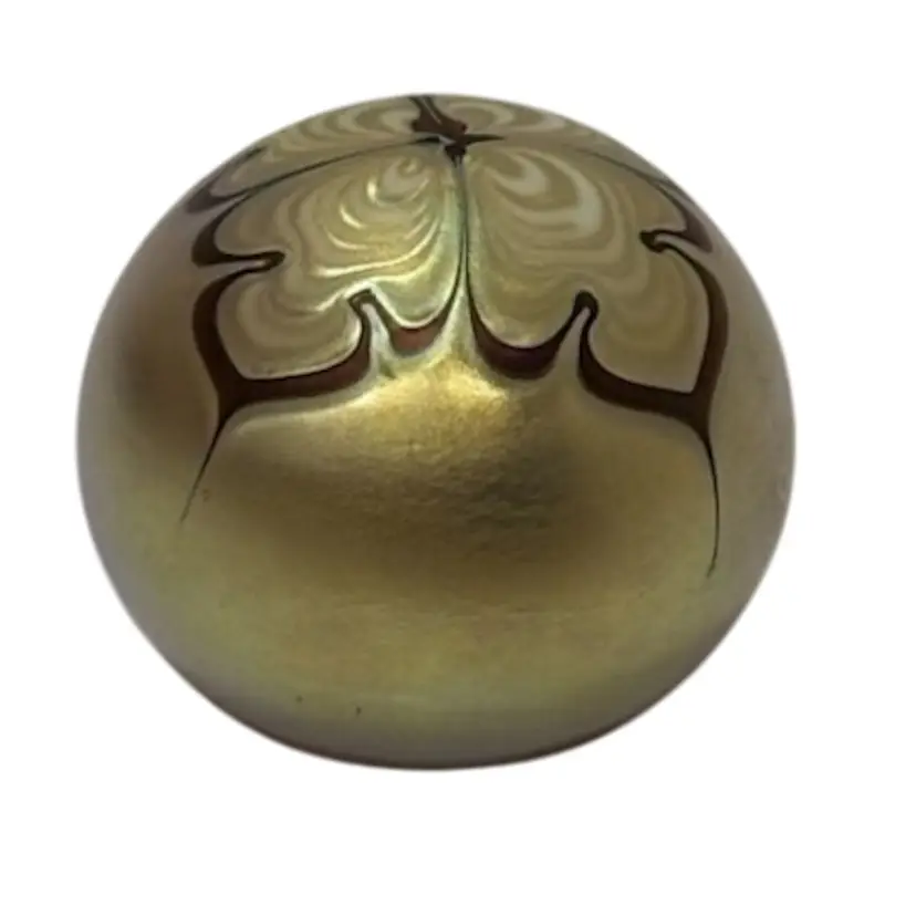 Lovely gold. 2.5” w x 2.25” ht. No chips cracks or repairs. Signature reads “ Smyers Glass 77 DA”.