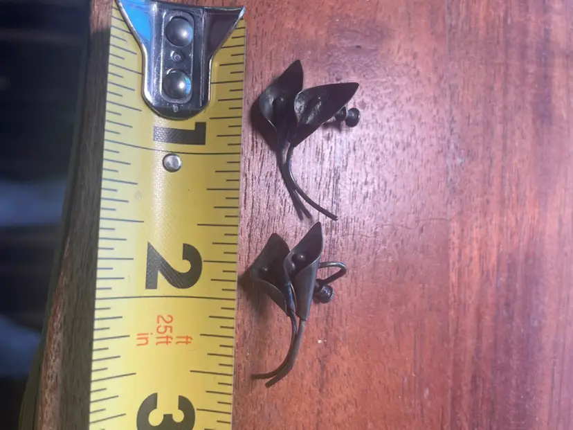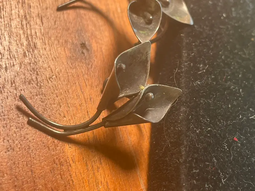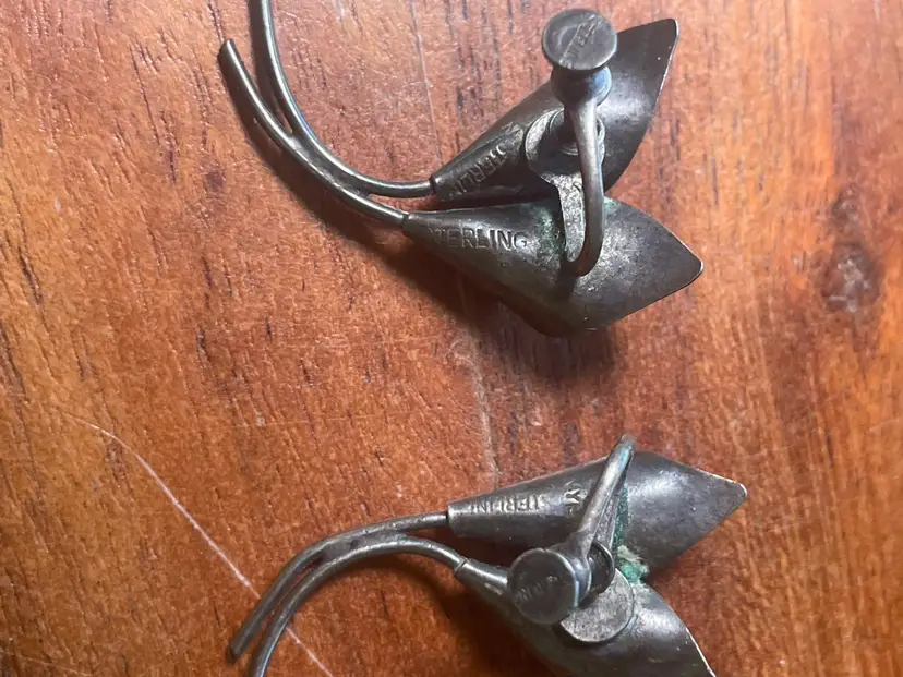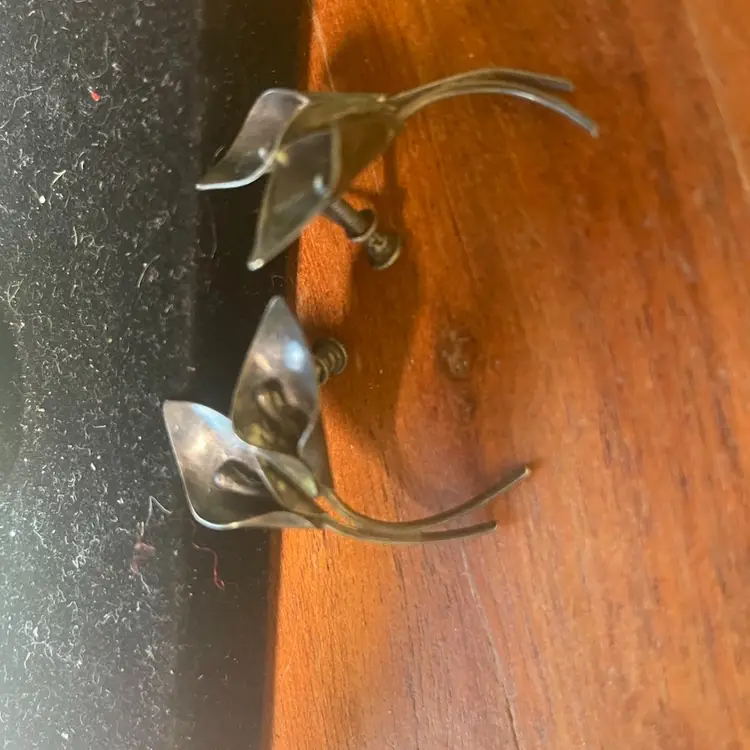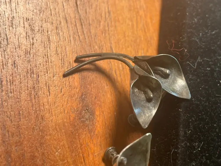 These earrings are hand-wrought made from sterling silver, and feature a calla lily design. Stuart Nye jewelry is known for its handcrafted quality and has been produced in Asheville, North Carolina, since 1933.