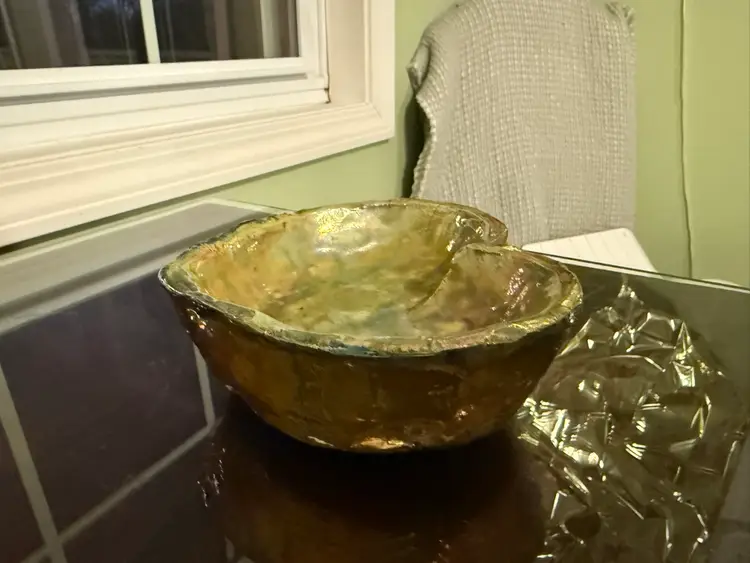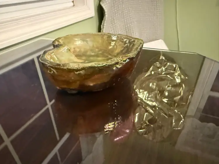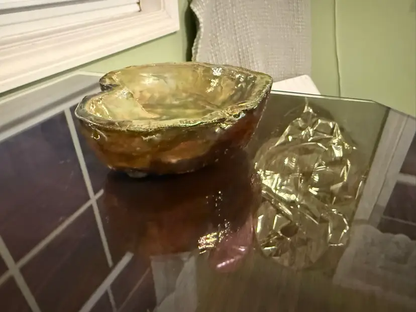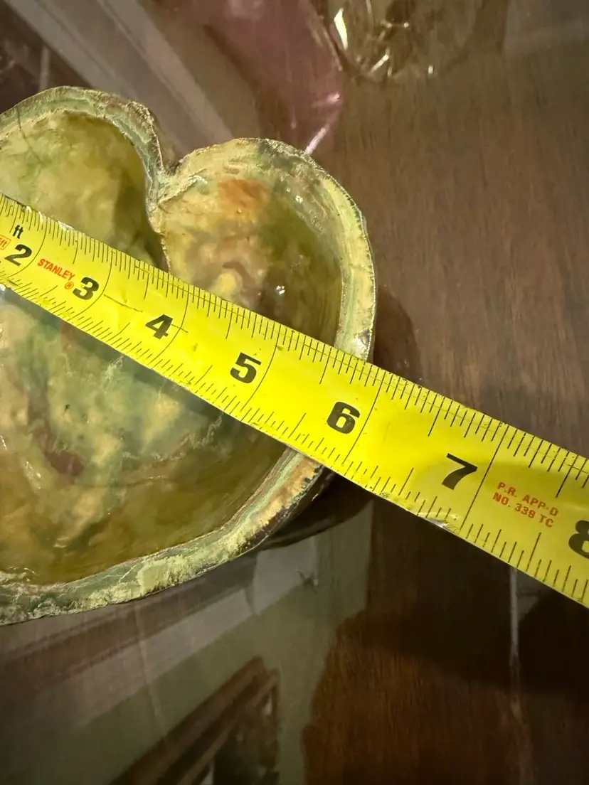 This vintage signed studio pottery heart-shaped bowl in earth tones of green, brown, and copper is a unique decorative piece for all occasions. Handmade in the United States during the late 20th century, this art pottery item features a retro style with hand-painted, glazed finish. The bowl is one-of-a-kind, making it a charming addition to any collection of decorative cookware and serveware. Perfect for teens and adults, this handmade bowl from a studio artist is sure to add a touch of nostalgia and character to any space.