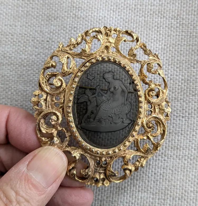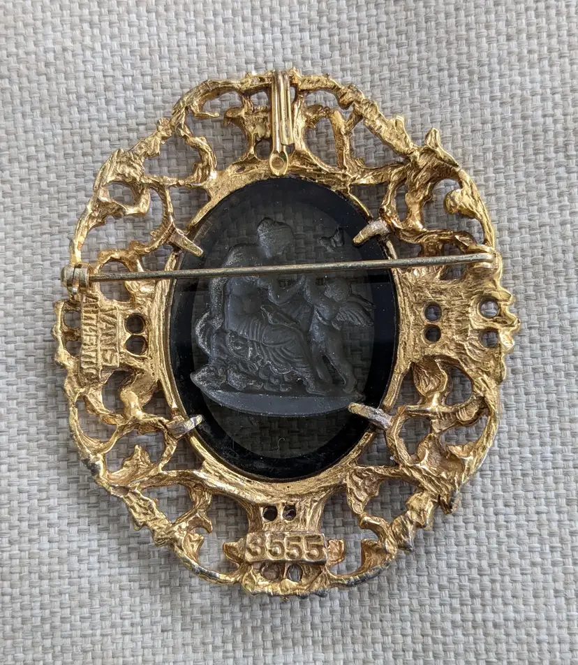 Classic style. The intaglio design is of a woman, a cupid and a butterfly. There is a hook on the back to adapt this brooch to a pendant. 2-3/4" long. Signed Vans Authentic