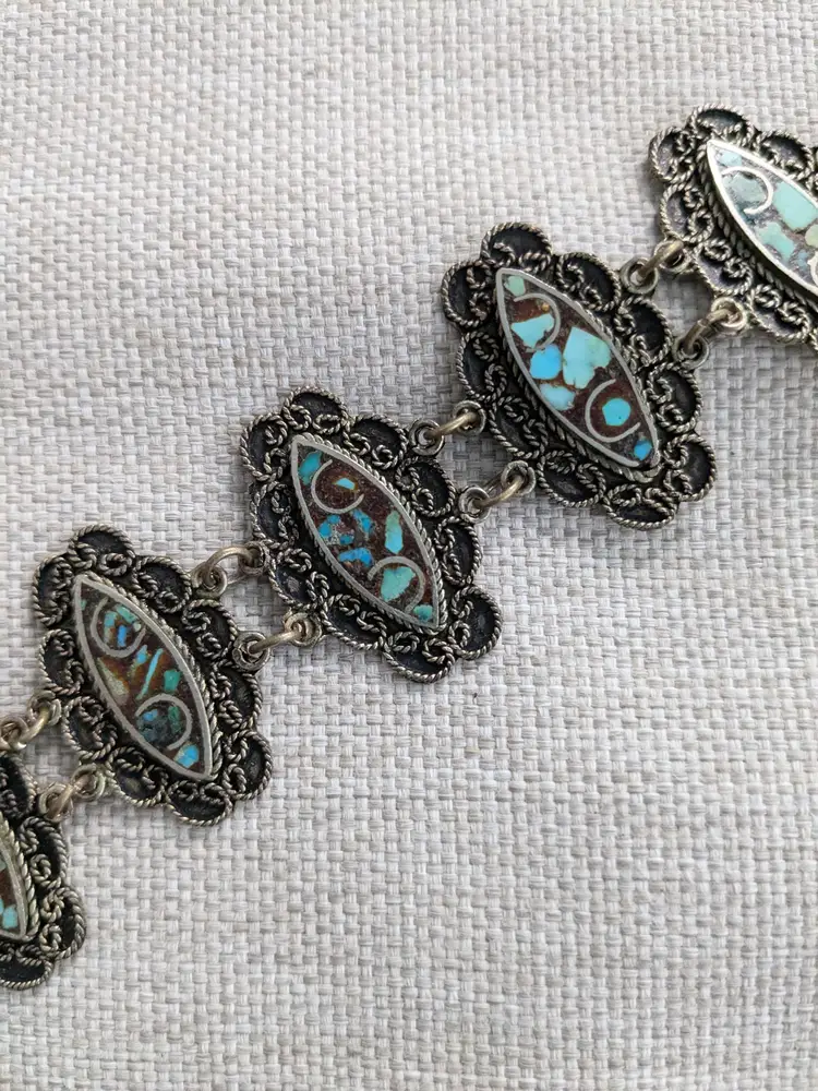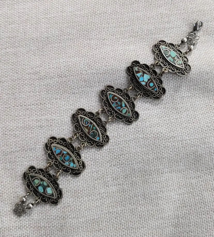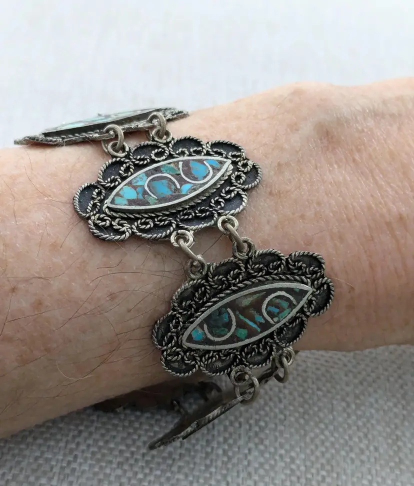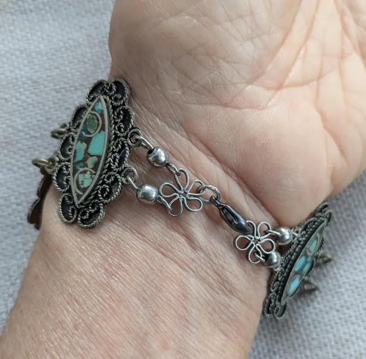 7" long. The clasp has been replaced and is now a lobster clasp. This is not a sterling bracelet. Unmarked