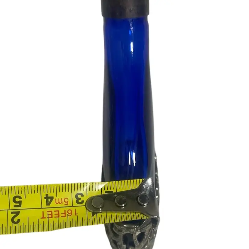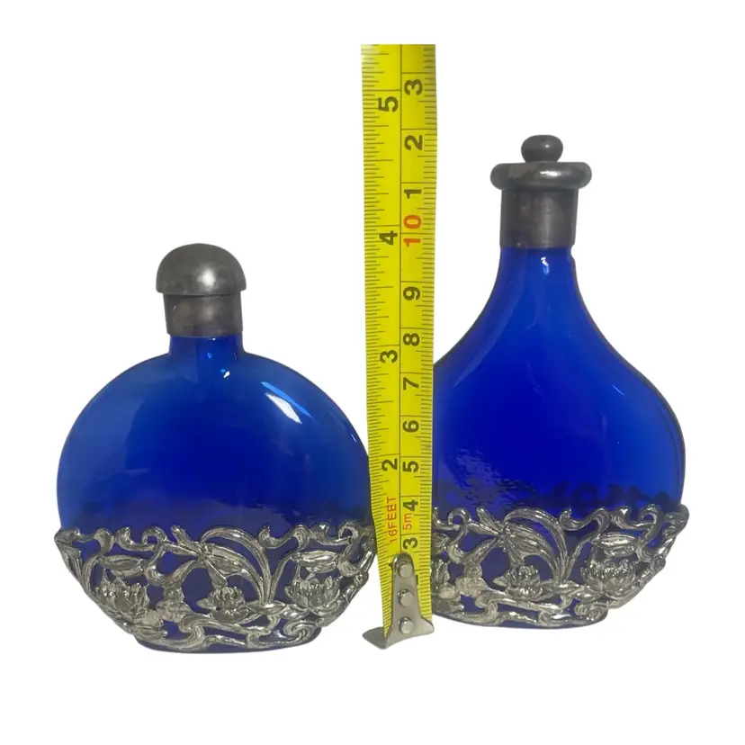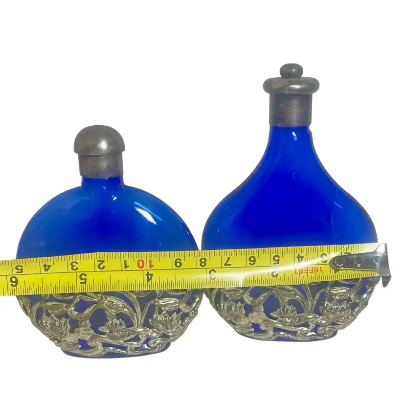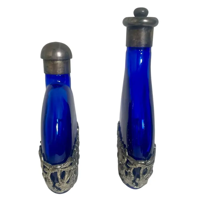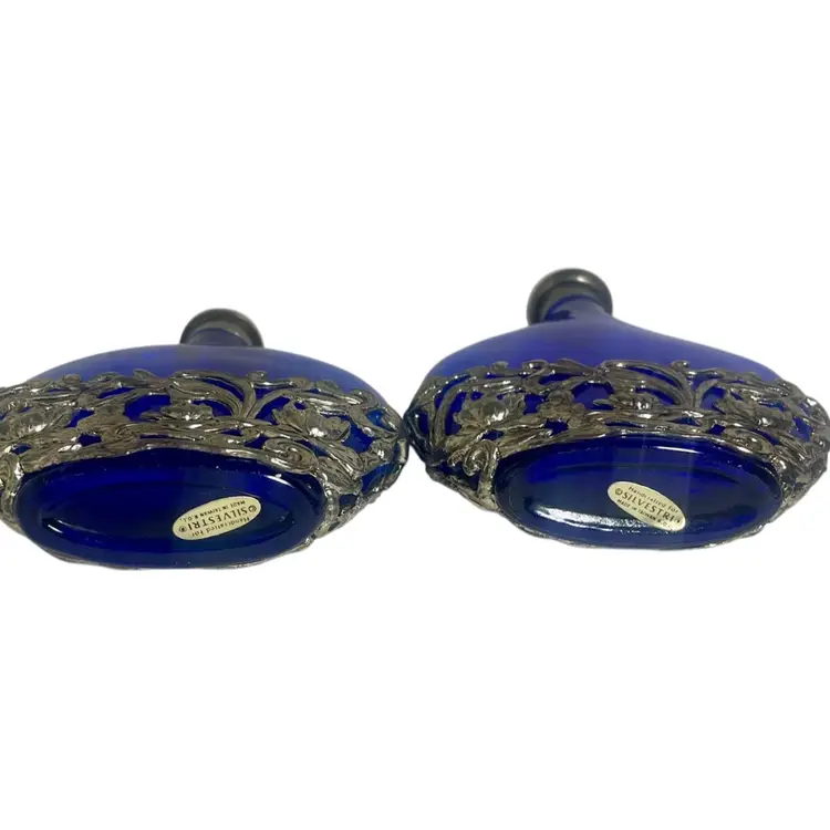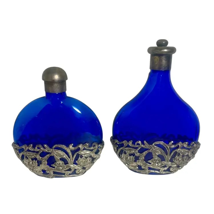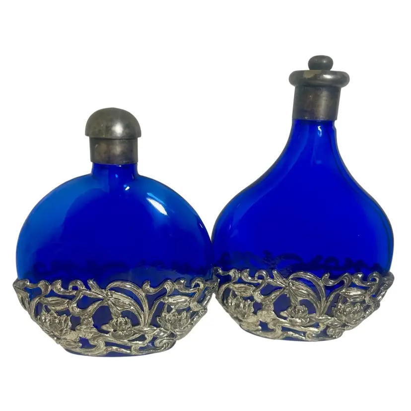 Vintage SILVER PLATED COBALT BLUE Glass Filigree Perfume Bottle Floral 2 Bottles