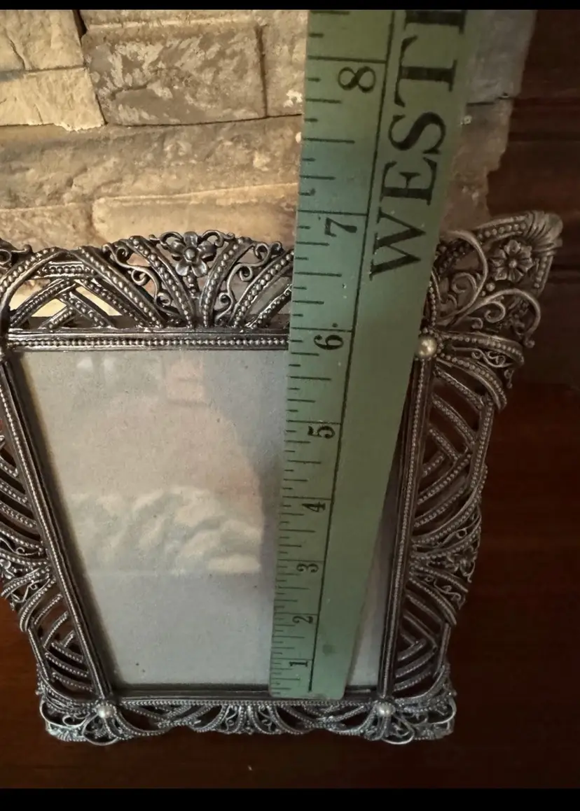 This vintage photo picture frame is a true gem for collectors of decorative items. The silver metal frame features a fancy floral pattern and pearls, making it a great addition to any home decor. Measuring less than 11 inches in height, length, and width, it is perfect for displaying your favorite 8 x 6 inch photos.