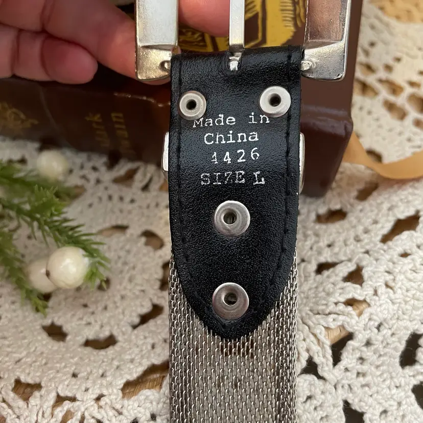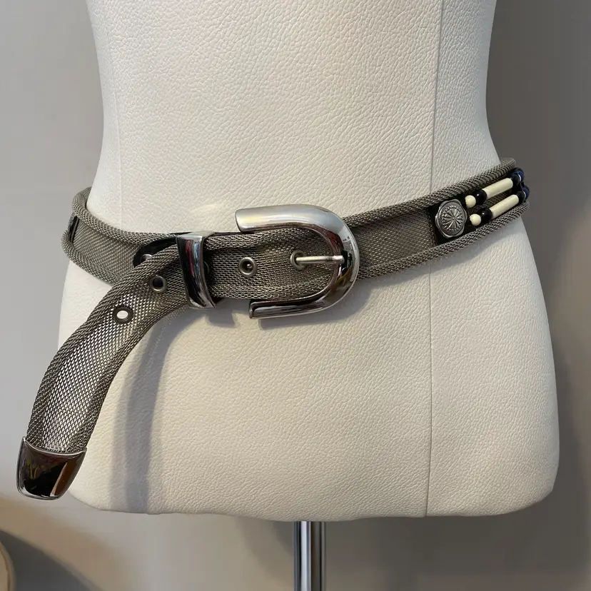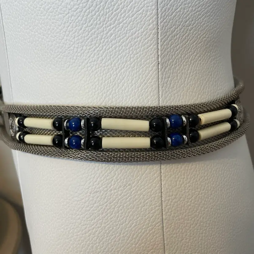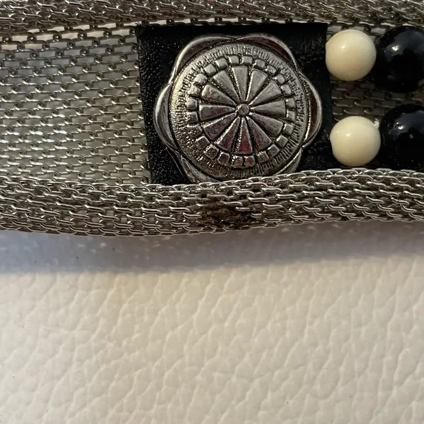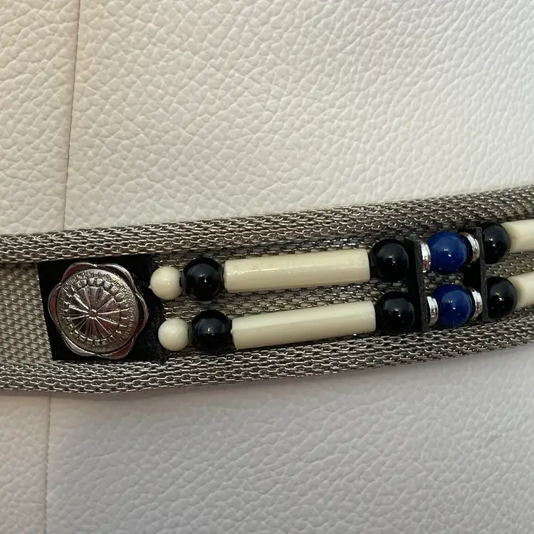 Great condition Silver metal mesh with southwestern metal and beaded trim. One small dark mark on metal as pictured 1.25” wide Holes measure from 29.5” to 33” 0000225