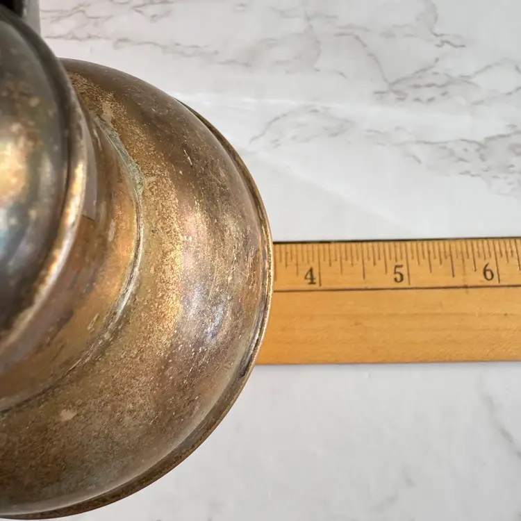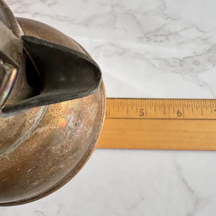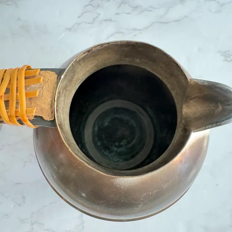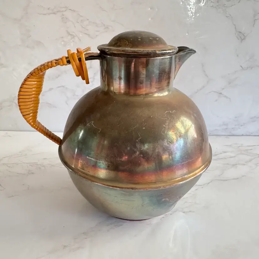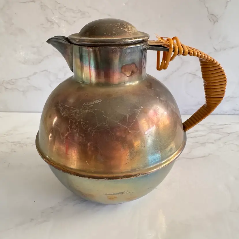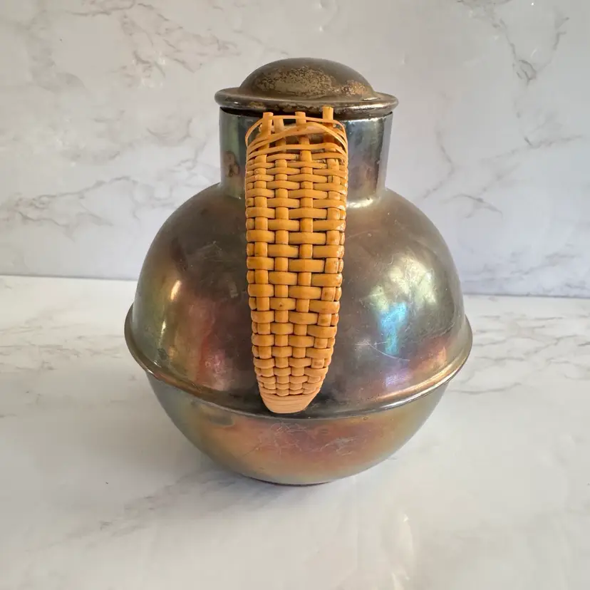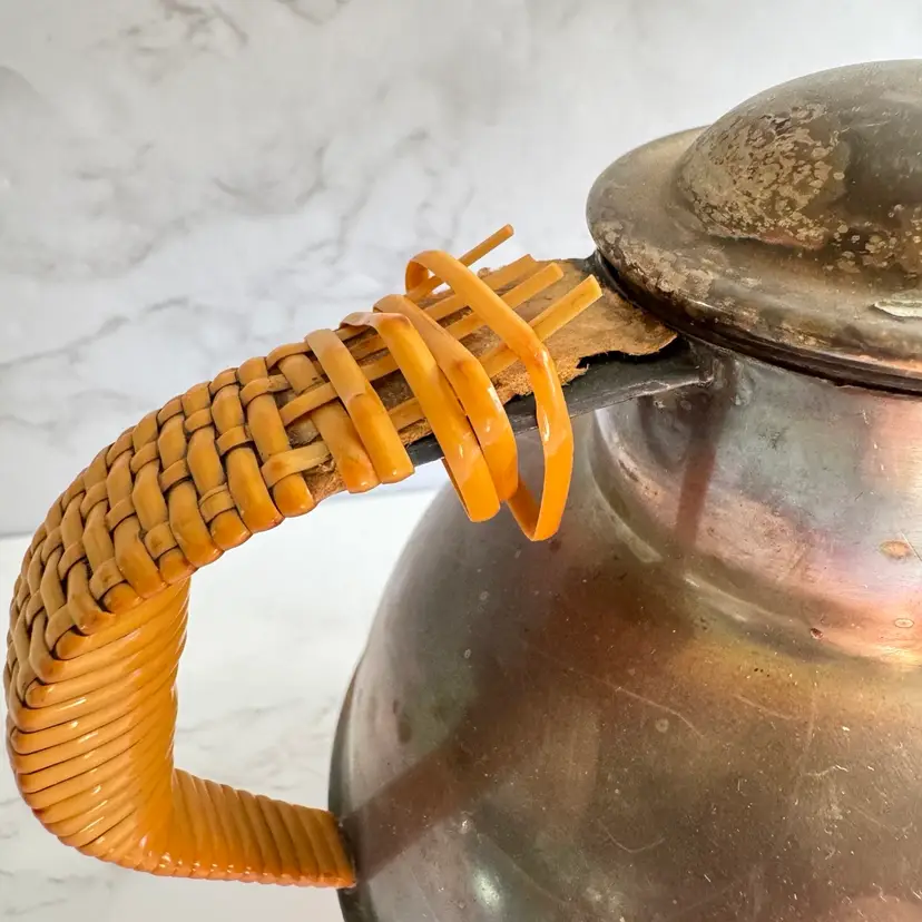 Wicker handle is coming undone. Lots of tarnish and dents.