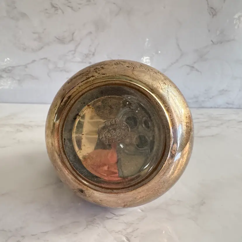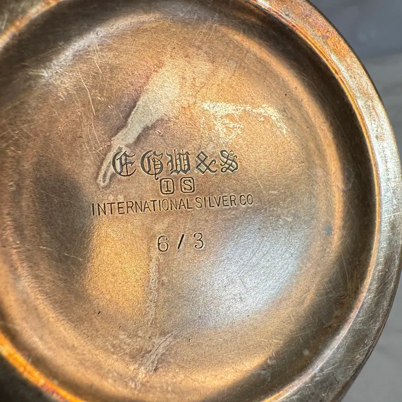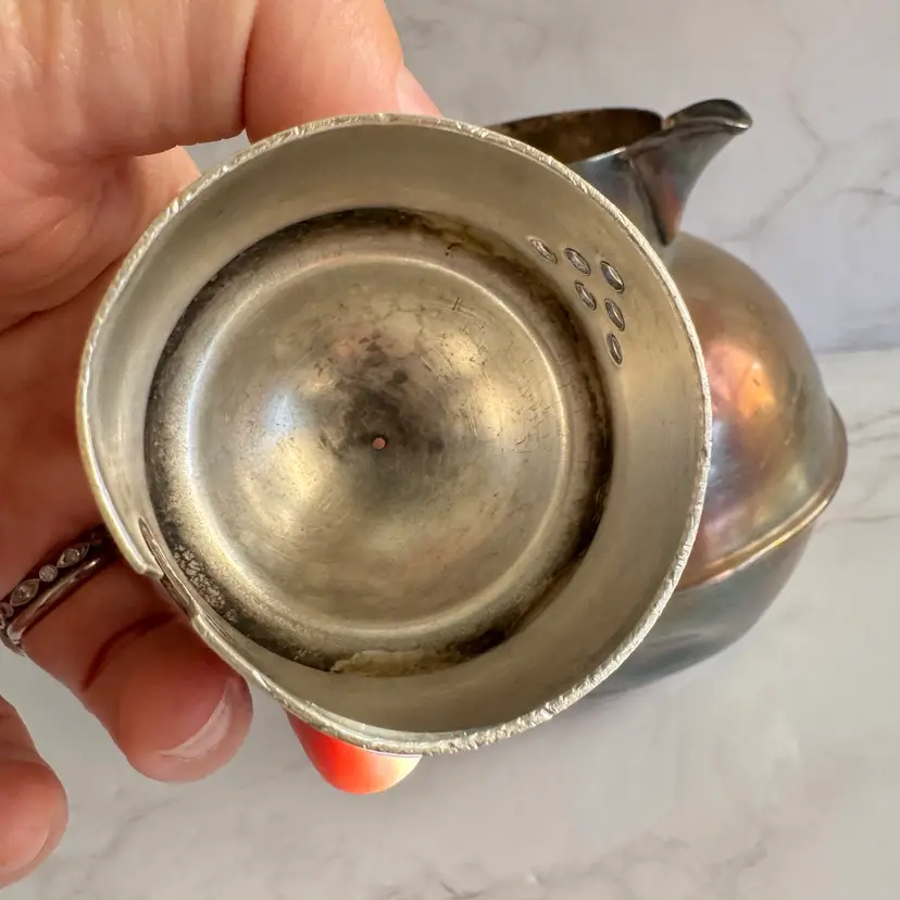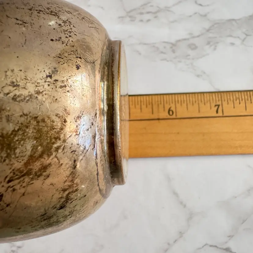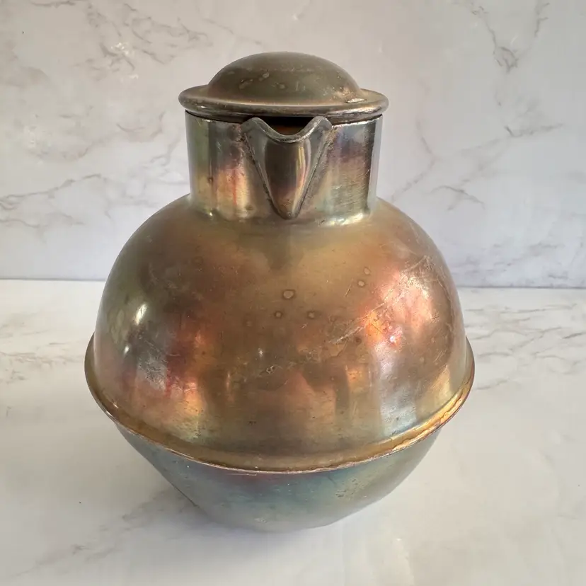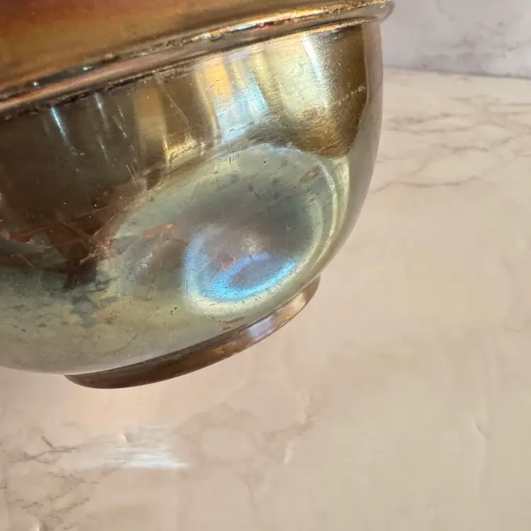 Wicker handle is coming undone. Lots of tarnish and dents.