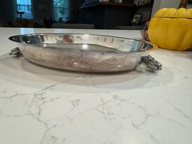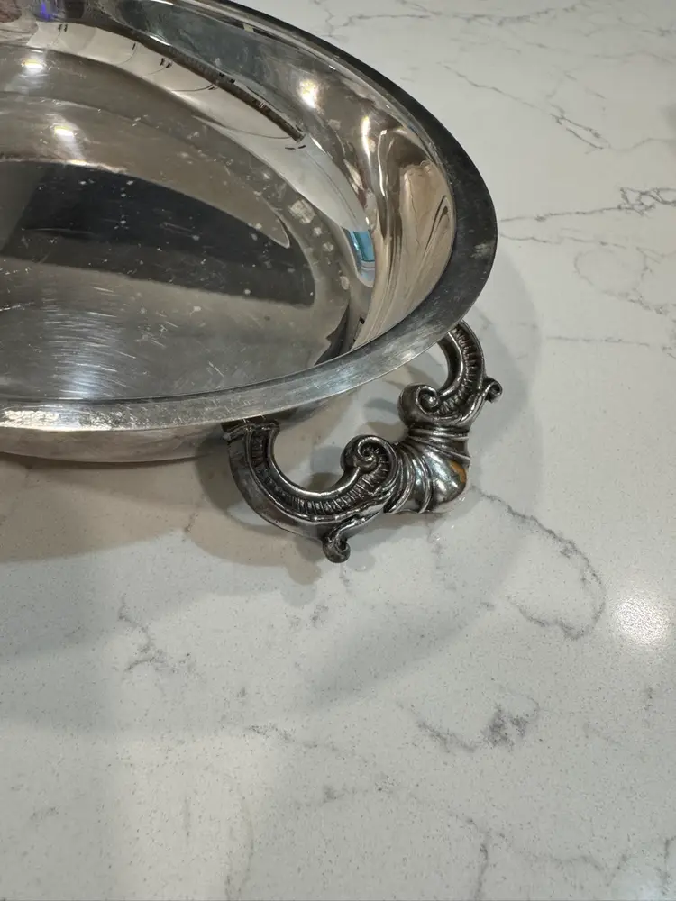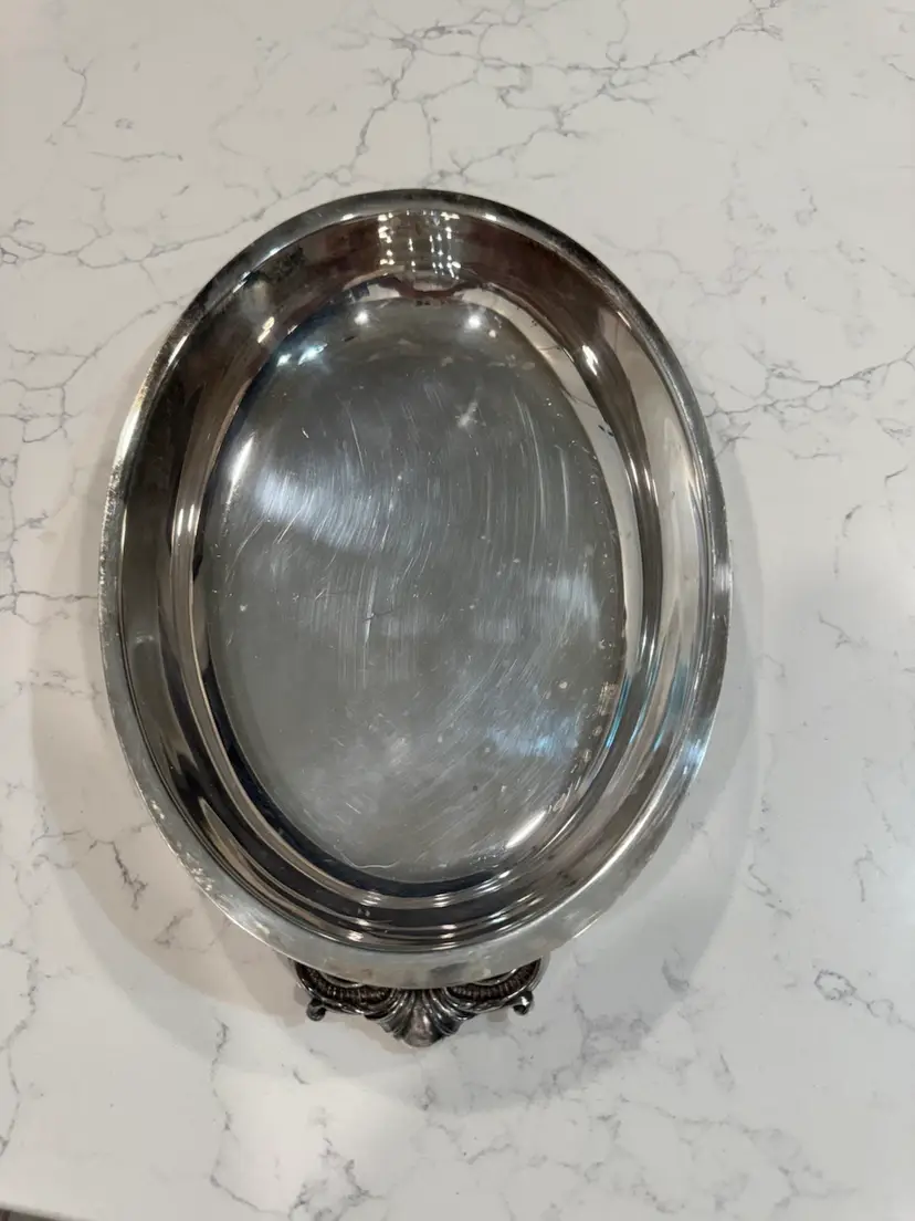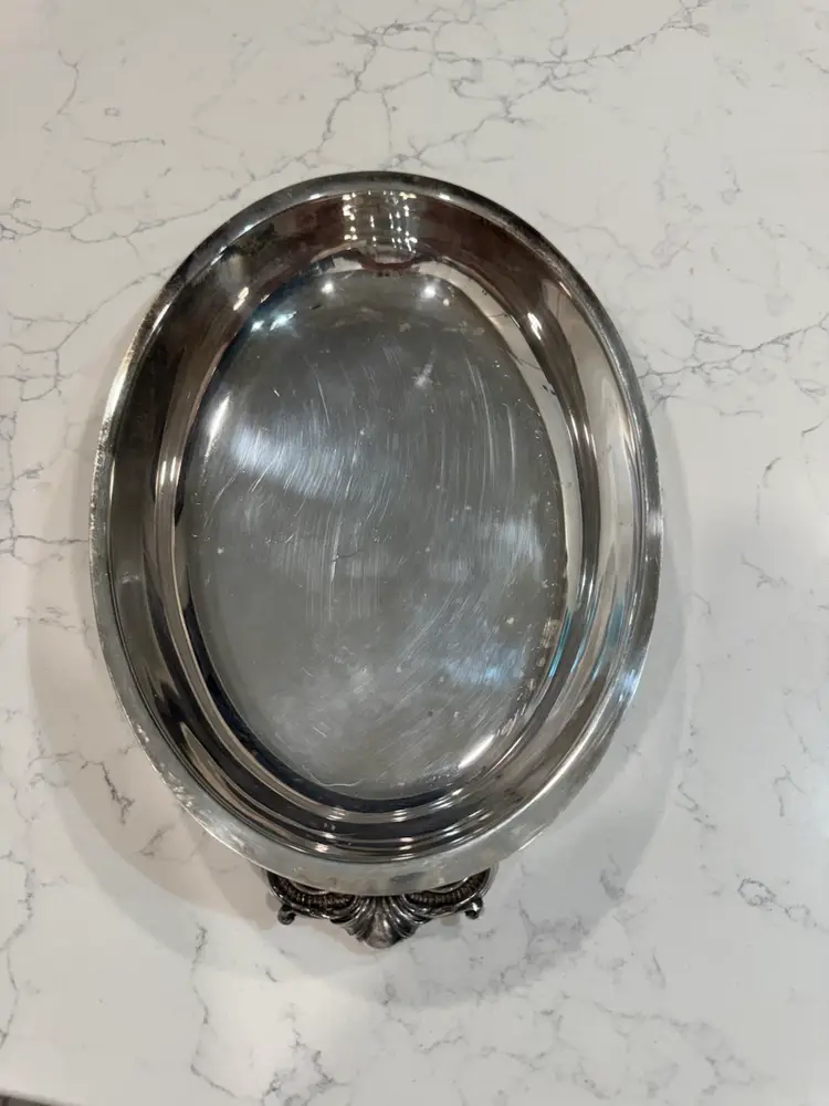 Vintage Silver Plate Serving Tray, an elegant oval piece perfect for entertaining or display. This classic serving tray features a polished silver-plate finish with subtle detailing. Ideal for appetizers, drinks, or as a decorative accent. Good pre-owned condition with some surface scratches and patina consistent with age and use, which adds to its vintage charm. No major dents or damage. Ready to be polished to a shine or left as is for a charming antique look.