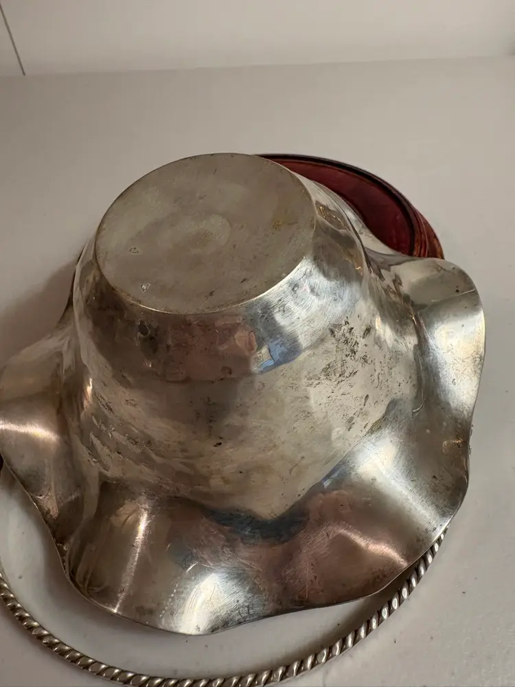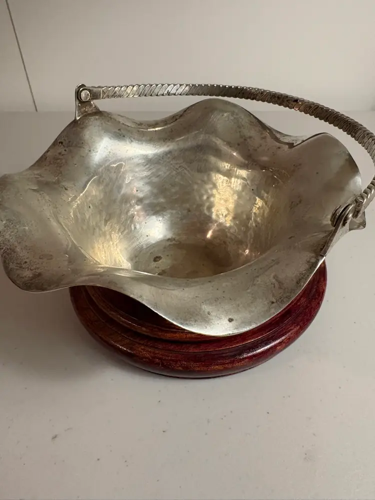 The Vintage Silver Plated Basket with Handle features a classic and elegant design, perfect for adding a touch of charm to any space. Made of silverplate, this basket is durable and long-lasting. The collapsible handle adds versatility and convenience, making it easy to store and transport. Its decorative pattern and timeless appeal make it a beautiful and practical piece for any home or collector. It’s very heavy.