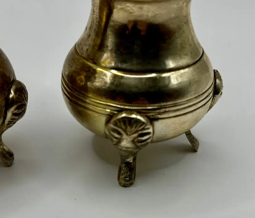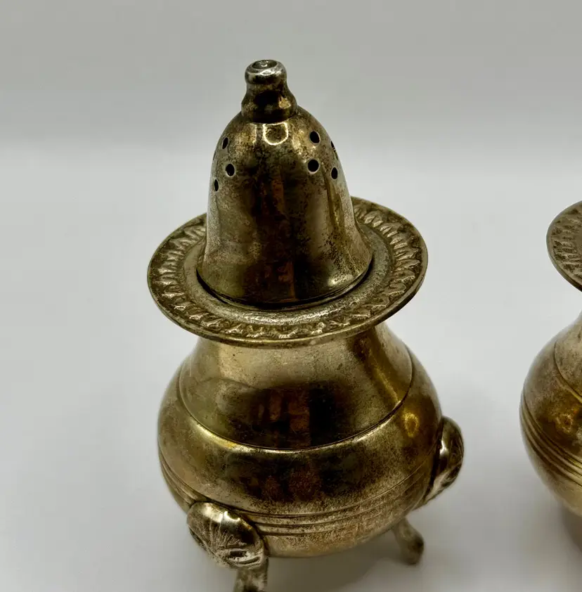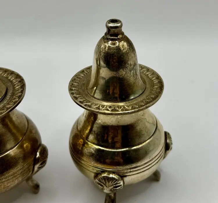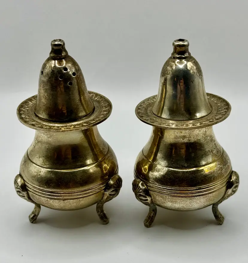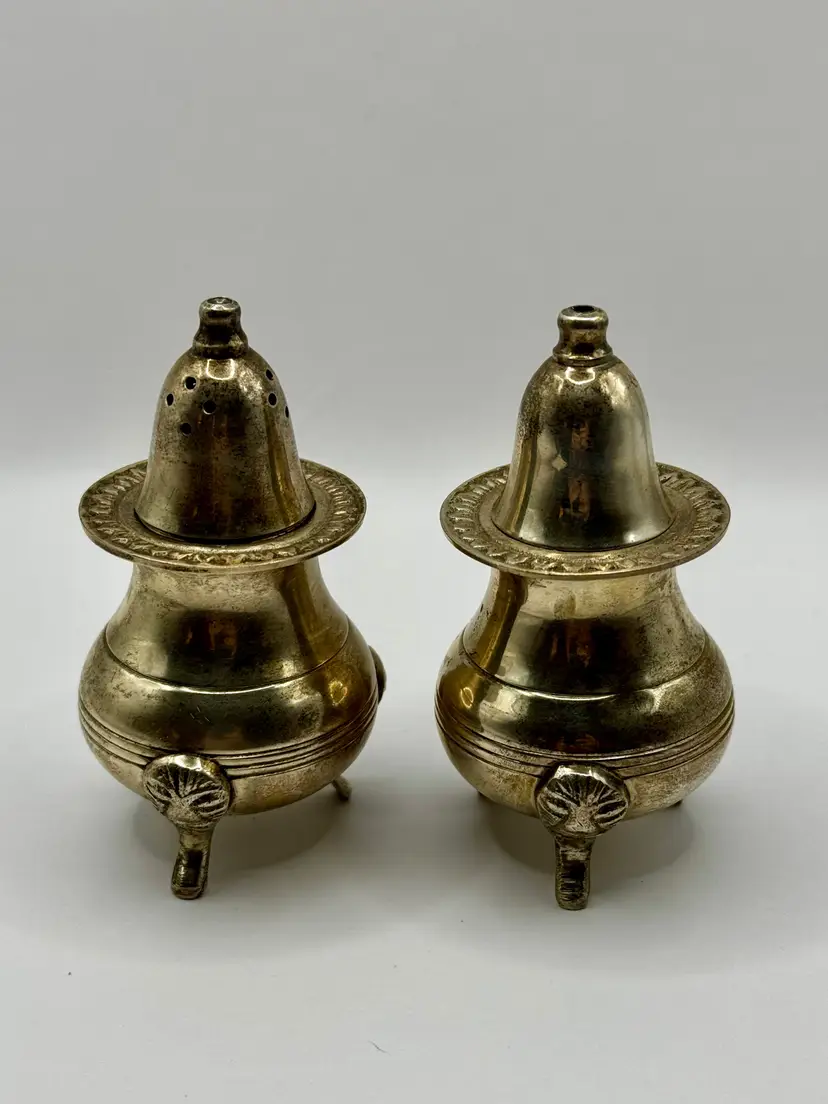 Add a touch of elegance to your dining table with this vintage silver plated salt and pepper shaker set. Featuring a classic design with intricate detailing, these shakers are perfect for both everyday use and special occasions. They show signs of age, adding to their authentic vintage charm. Good condition with minor wear consistent with age. Measures 2x3.5 inches. Weighs 8oz.