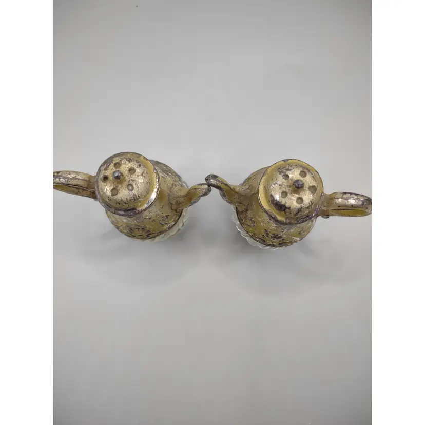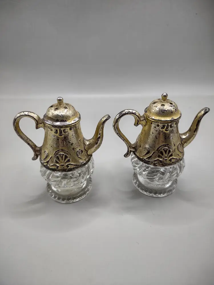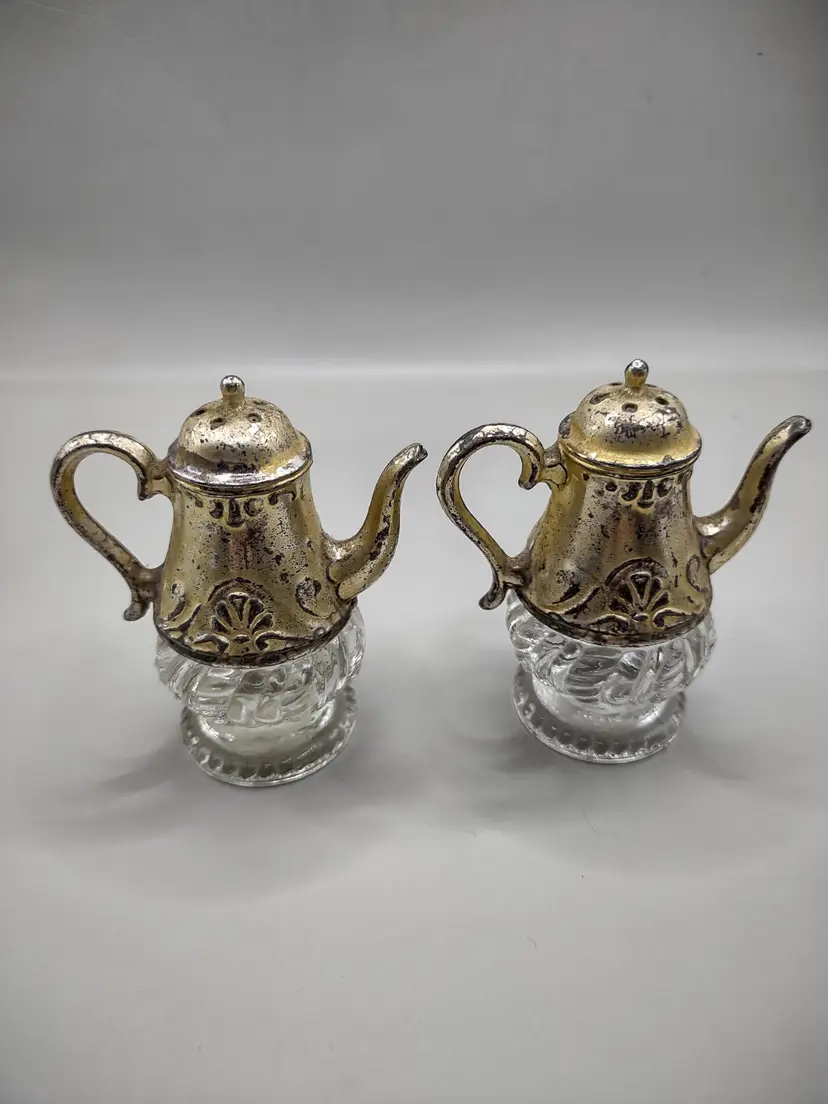 Adorable vintage silver plated teapot and glass salt and pepper shakers. They are unbranded. They are about 3 1/4 inches tall.