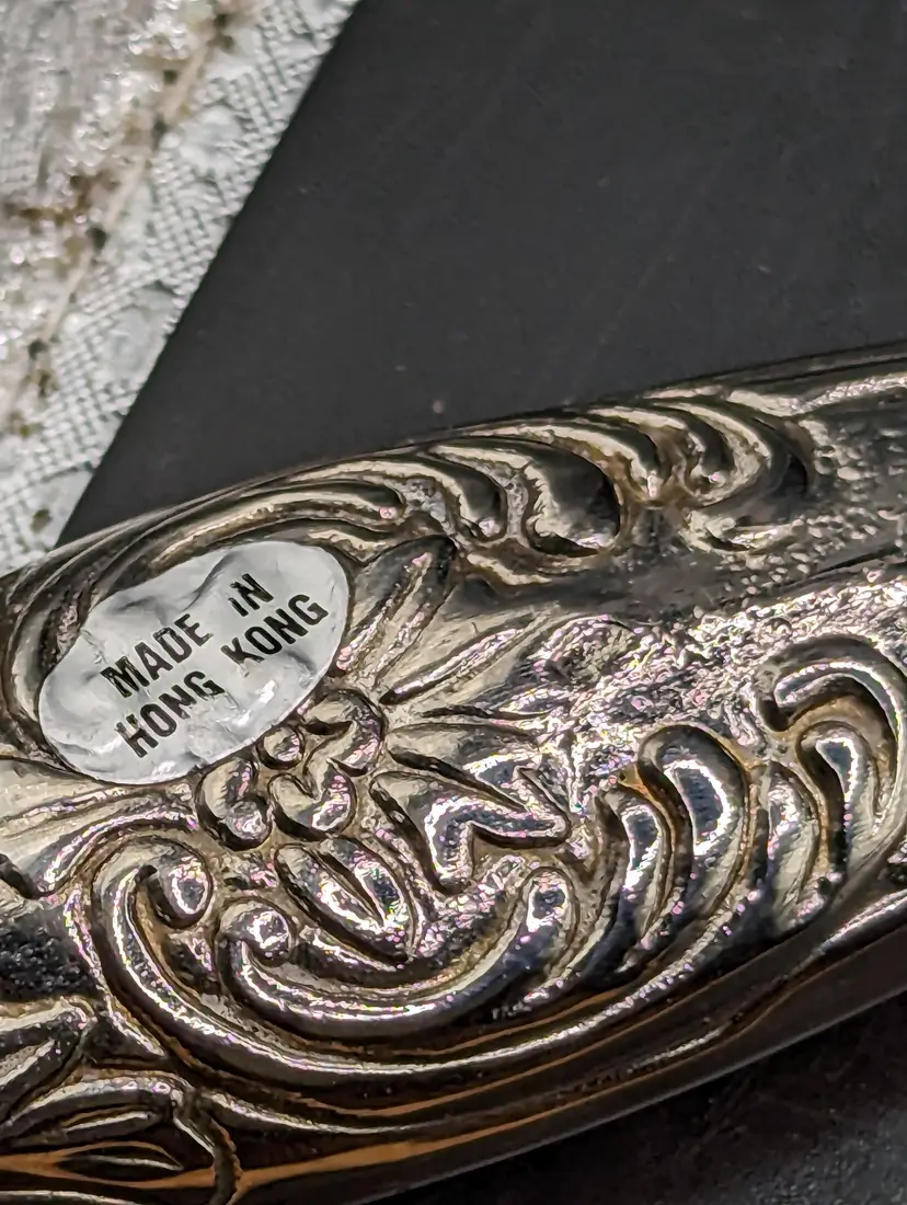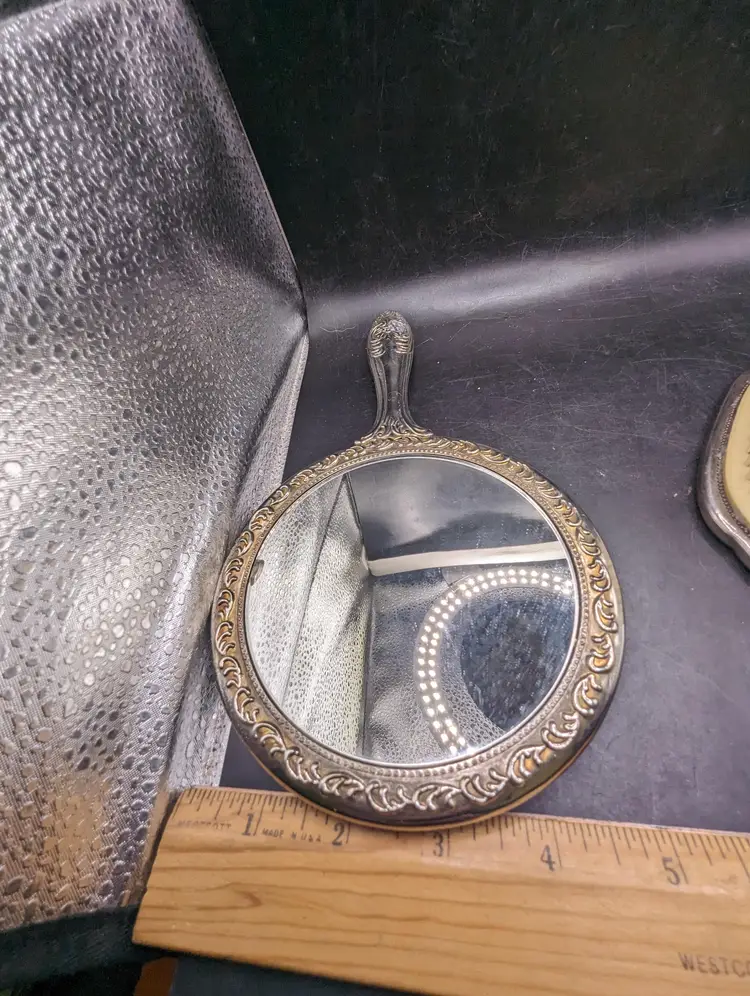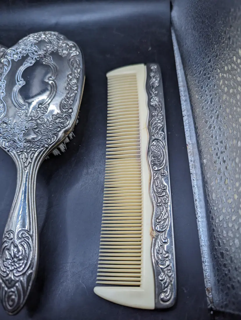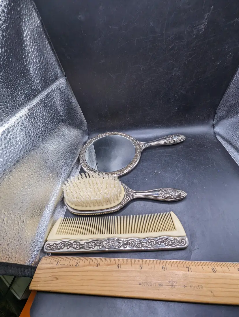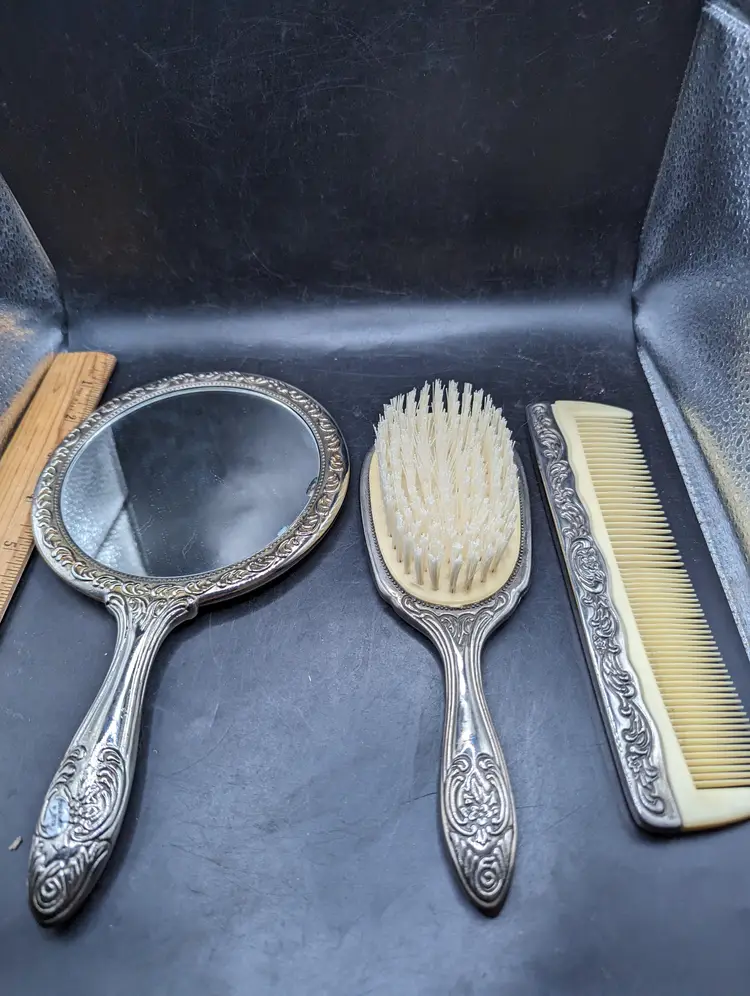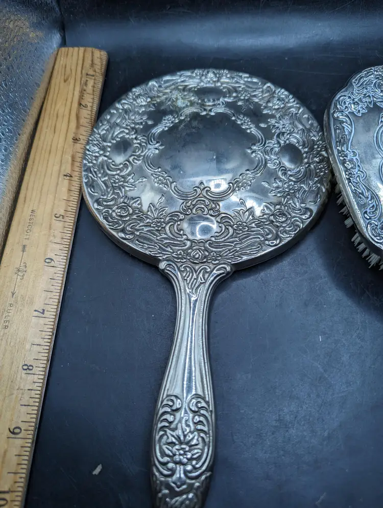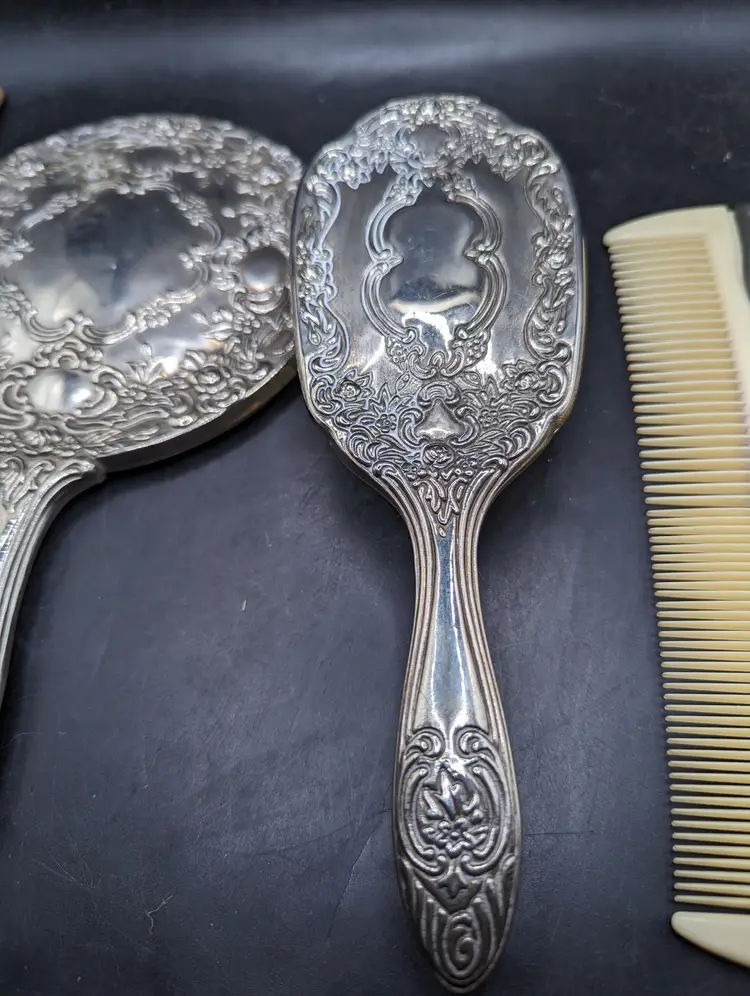 Add a touch of elegance to your dressing table with this vintage silver vanity set. Featuring a beautifully detailed hand mirror, brush, and comb, it's perfect for collectors or as a unique gift. Please see all photos for condition and measurements.