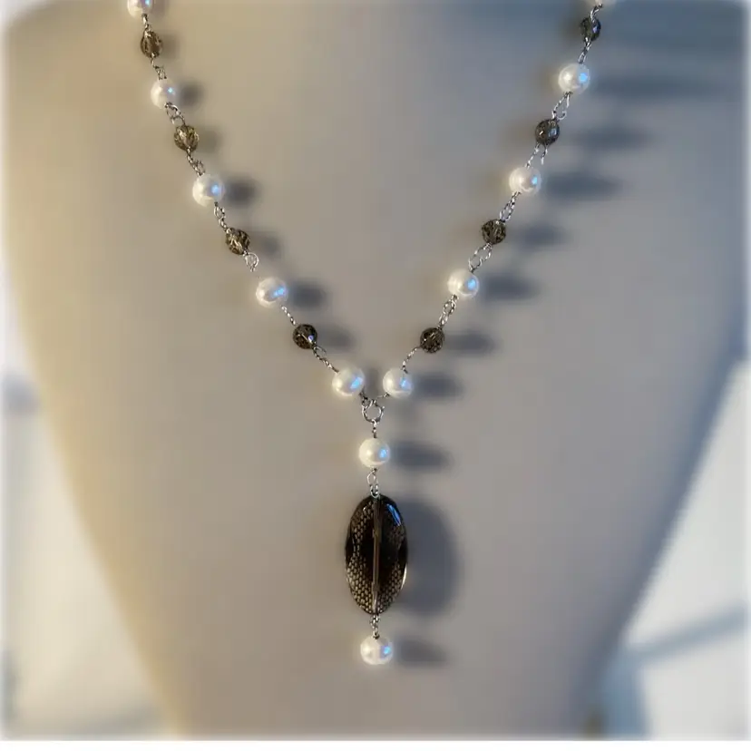 Vintaged silver tone, ringed oval pearl and smokey glass necklace. Length measures 16” to 18 1/2” with adjustment. Clasp is marked 925, but is magnetic so I do not think it is.