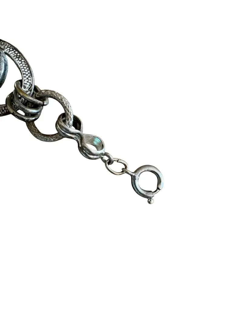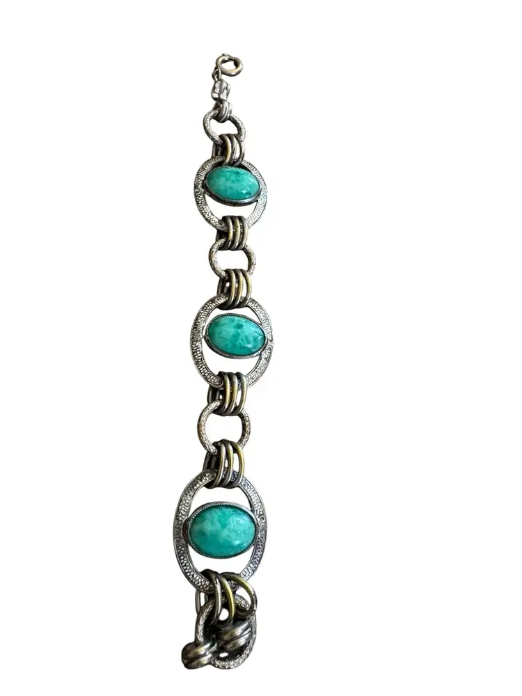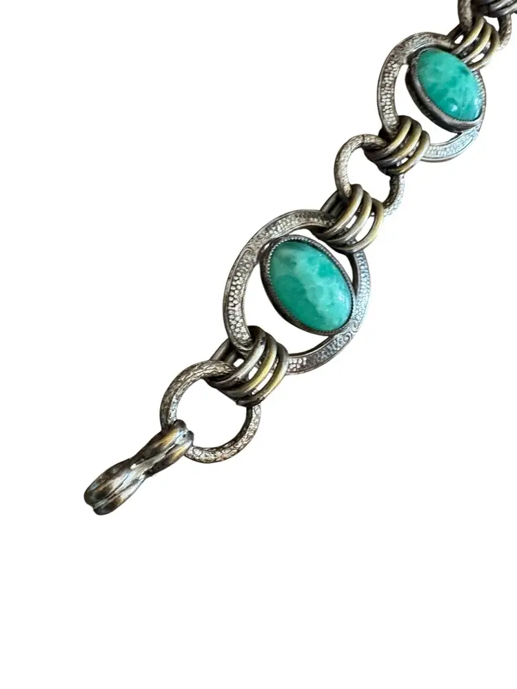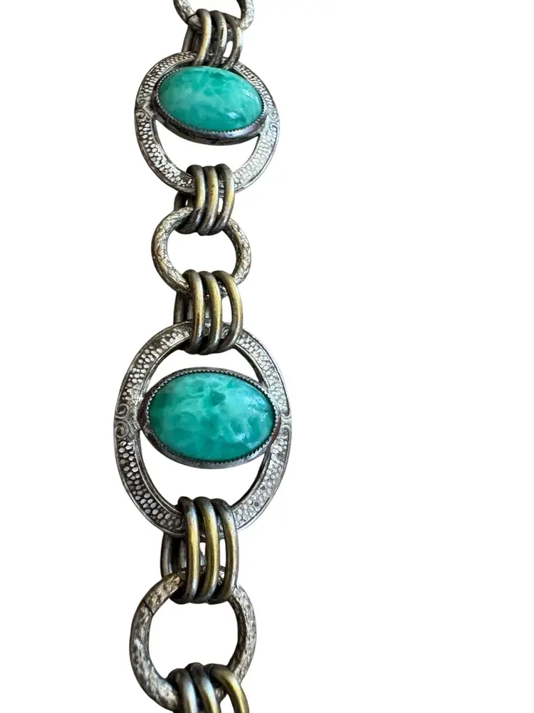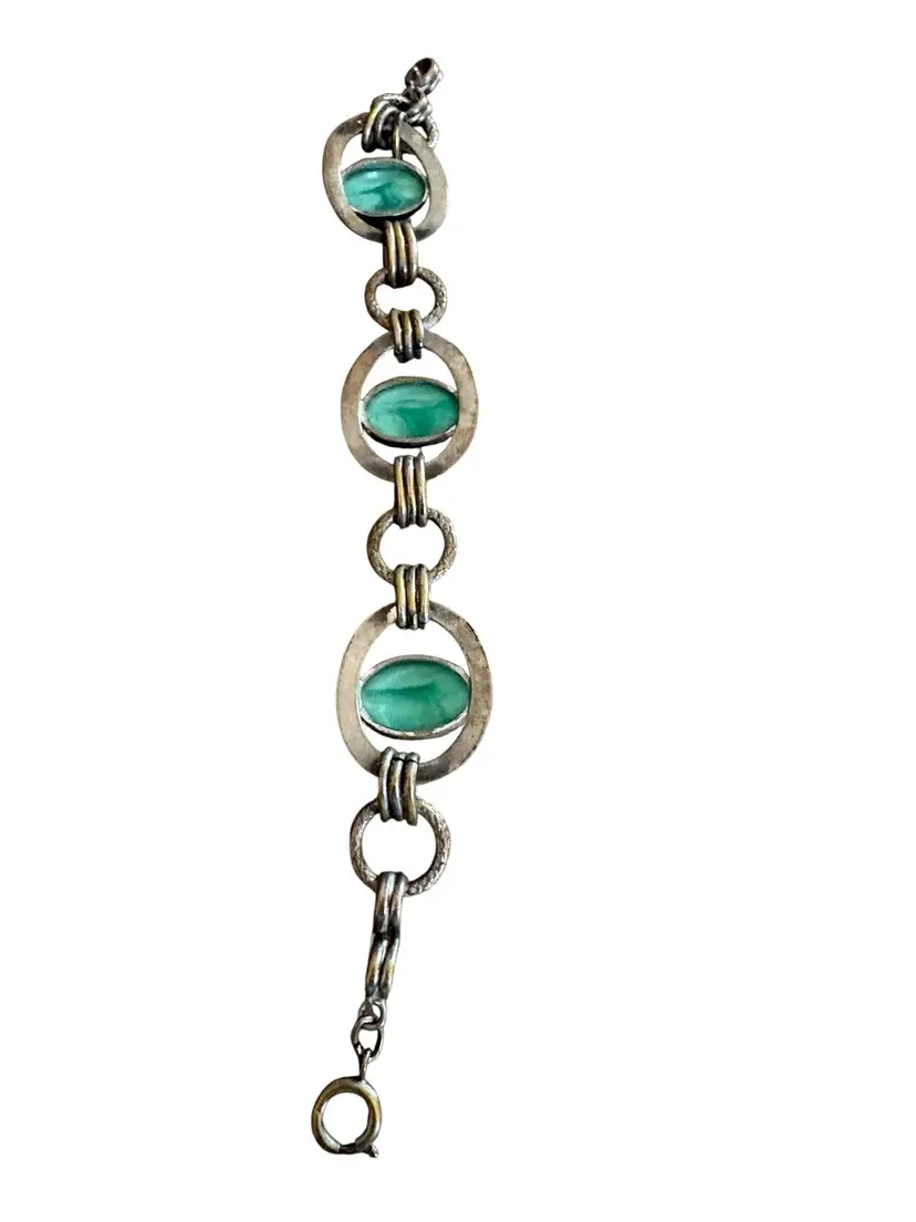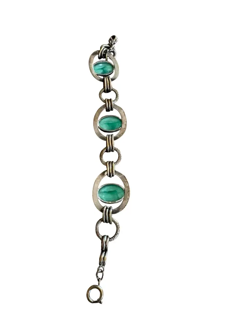 Vintage Silver tone and Green stone Cabochon Link Bracelet. This beautiful piece features oval green cabochons set in decorative silver tone metal circular link frames. A classic example of vintage Mexican silver artistry.