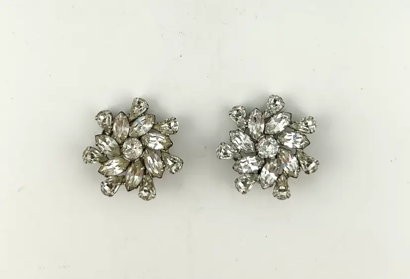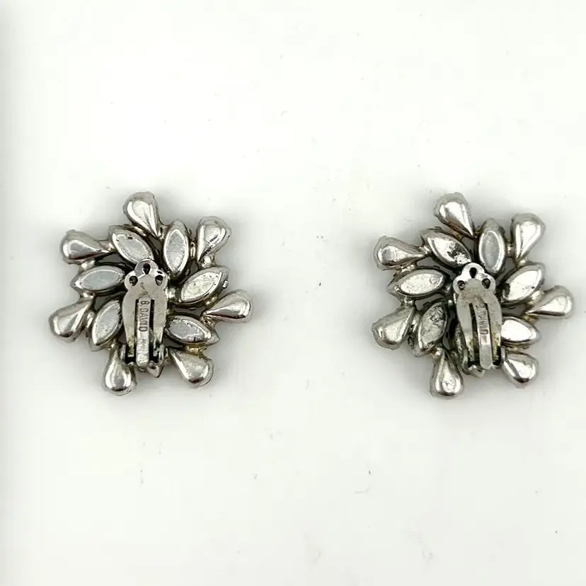 Vintage Silver Tone B. David Rhinestone Clip-on Earrings 1”